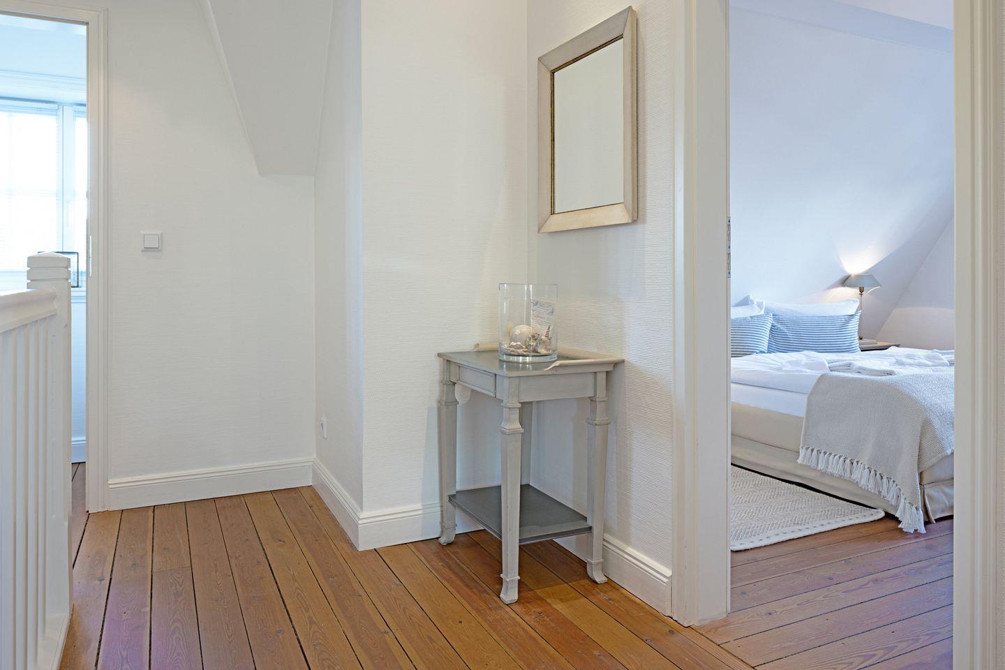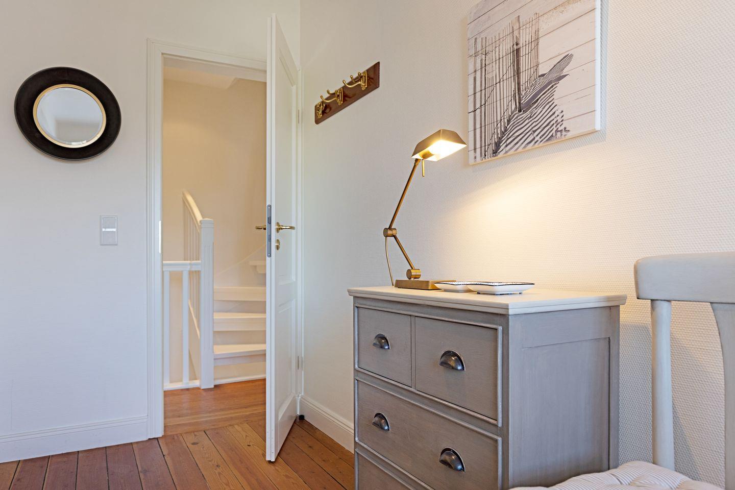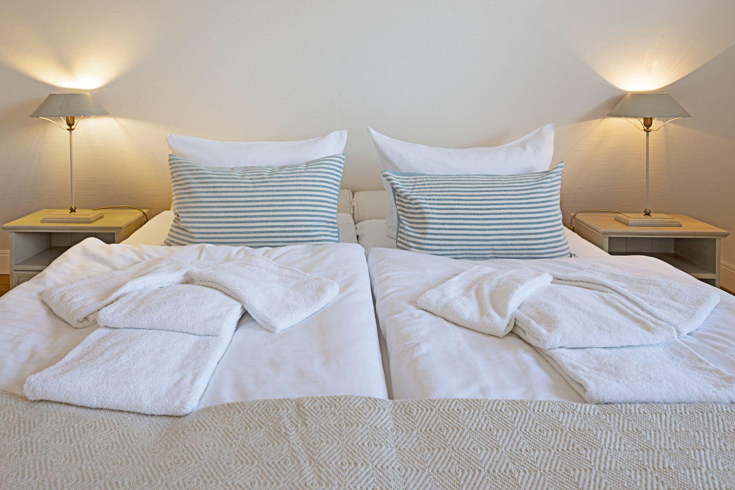 Im 1 Obergeschoss angekommen, unterteilt sich dies in zwei komfortable Schlafzimmer mit Doppelbetten sowie ein Badezimmer mit Dusche.