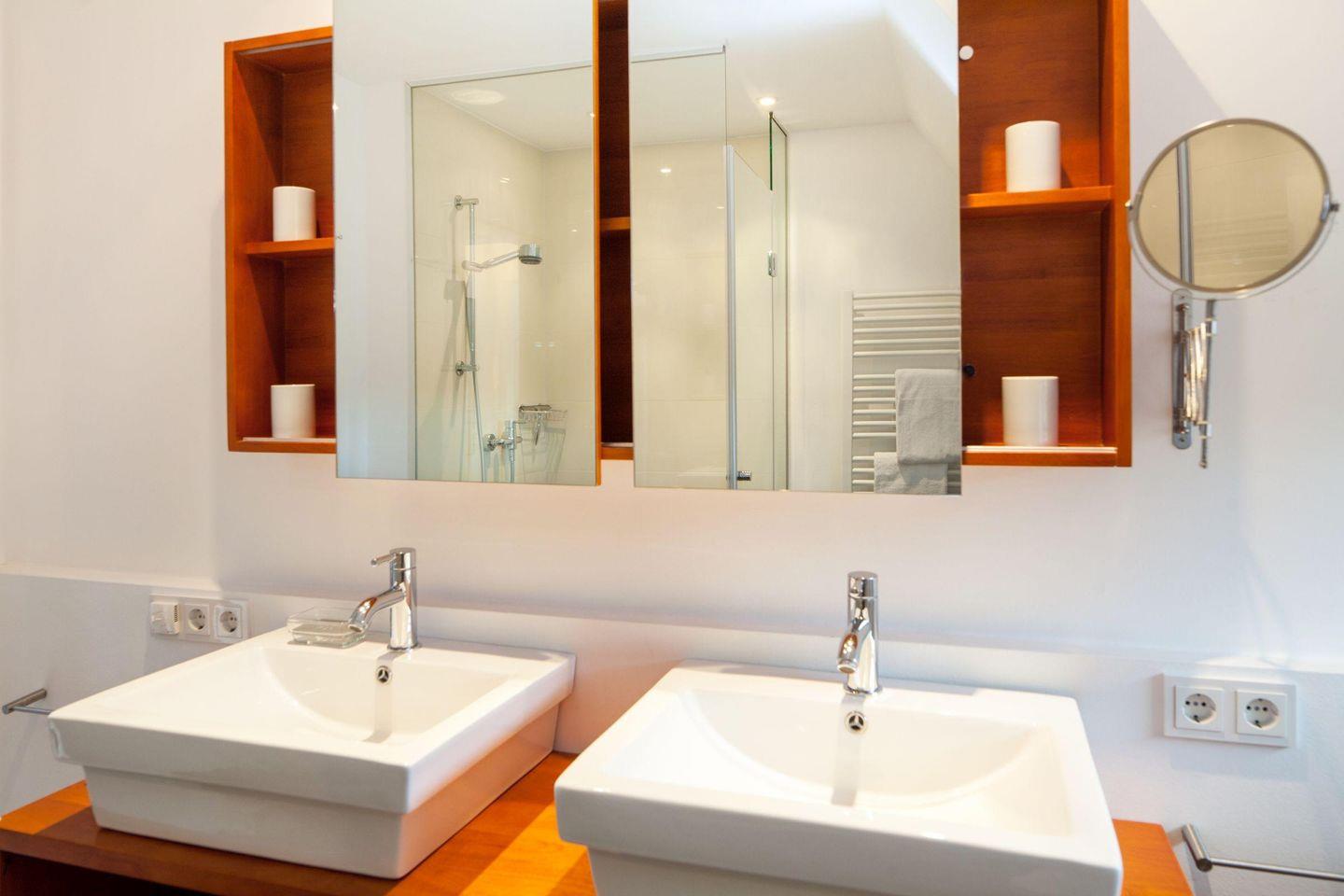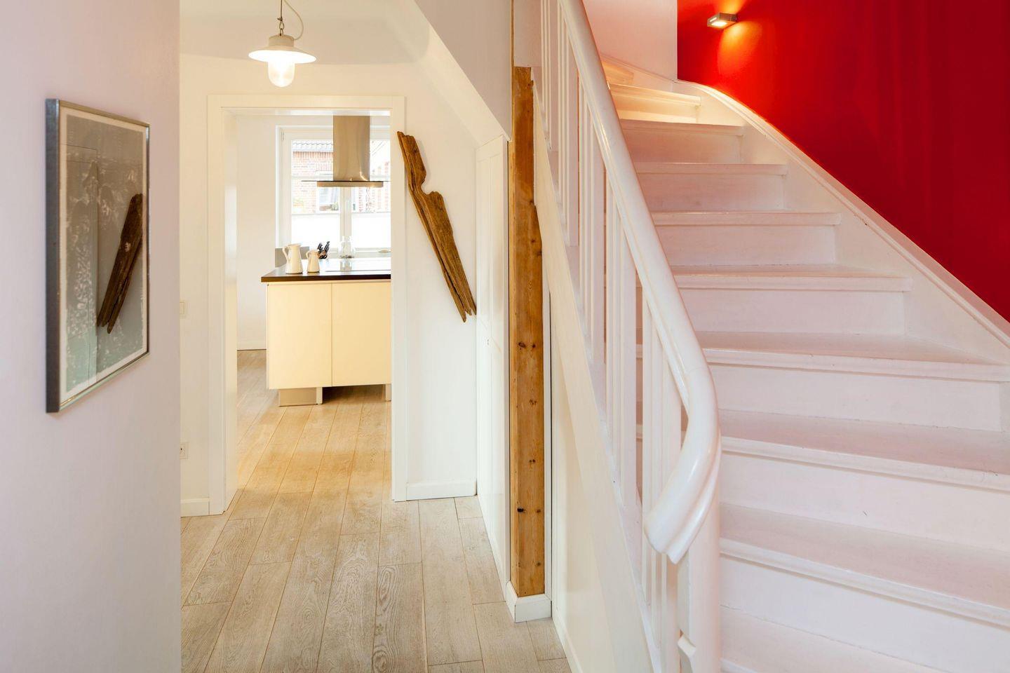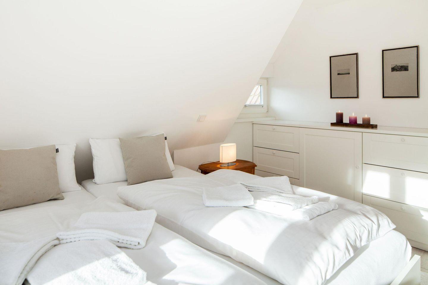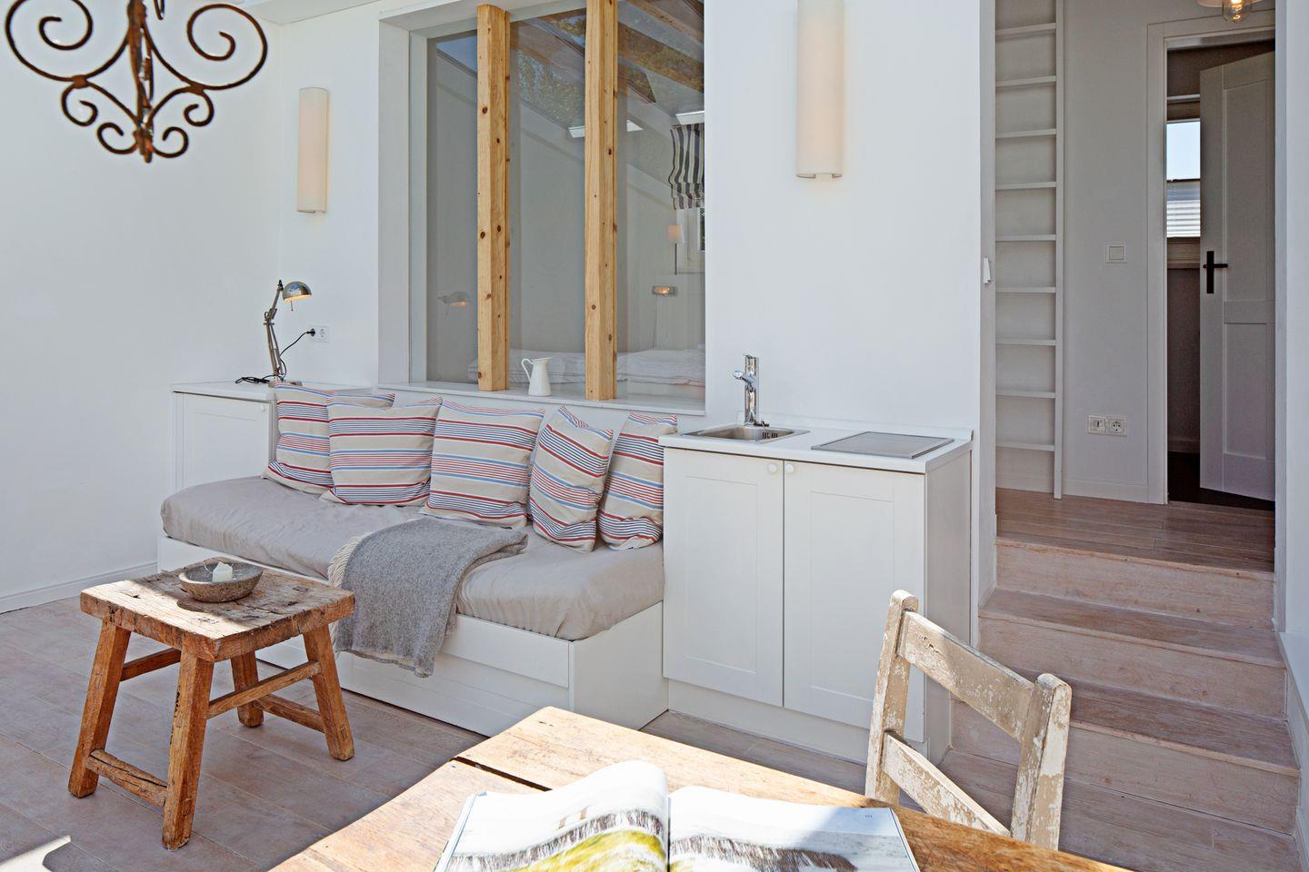 Sie betreten das Haus über einen kleinen Flur mit großzügiger Garderobe. Links gelangen Sie in das Haupthaus, rechts in den Wintergarten-Anbau. Im gesamten Haus sorgen weiß gekalkte Eichendielen für eine helle, freundliche Atmosphäre. Über eine helle Holztreppe gelangen Sie in den ersten Stock, wo sich ein Schlafzimmer mit Doppelbett, ein Kinderzimmer mit zwei Einzelbetten und ein Badezimmer mit großer Dusche, zwei Waschbecken, WC, Bidet und Fußbodenheizung befinden. Ein weiteres Doppelbett steht im Wintergarten-Anbau im Erdgeschoss zur Verfügung.