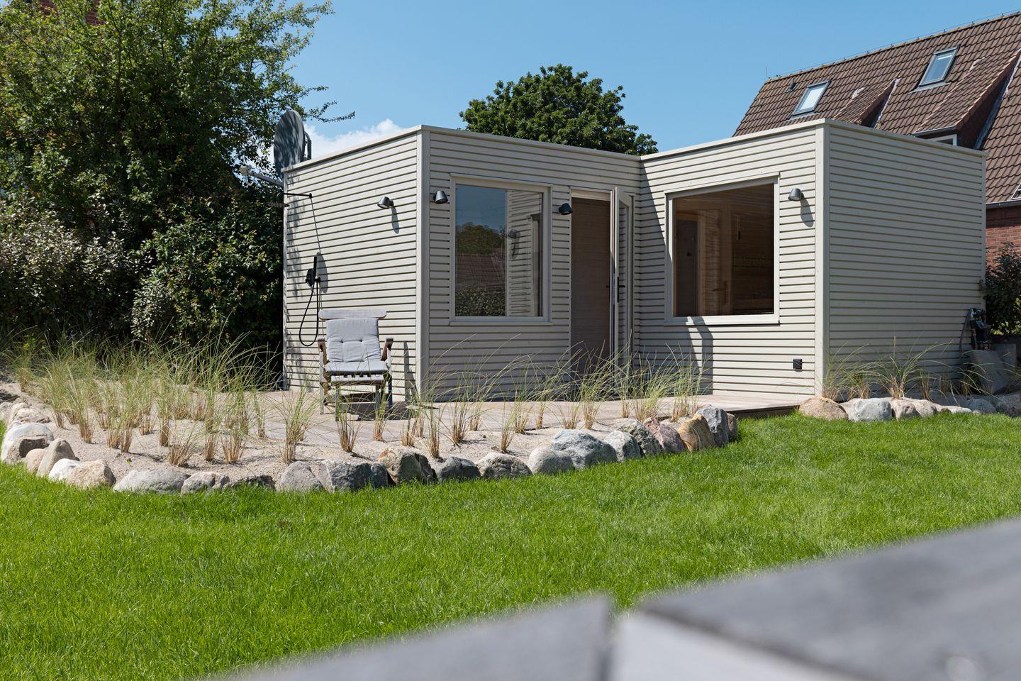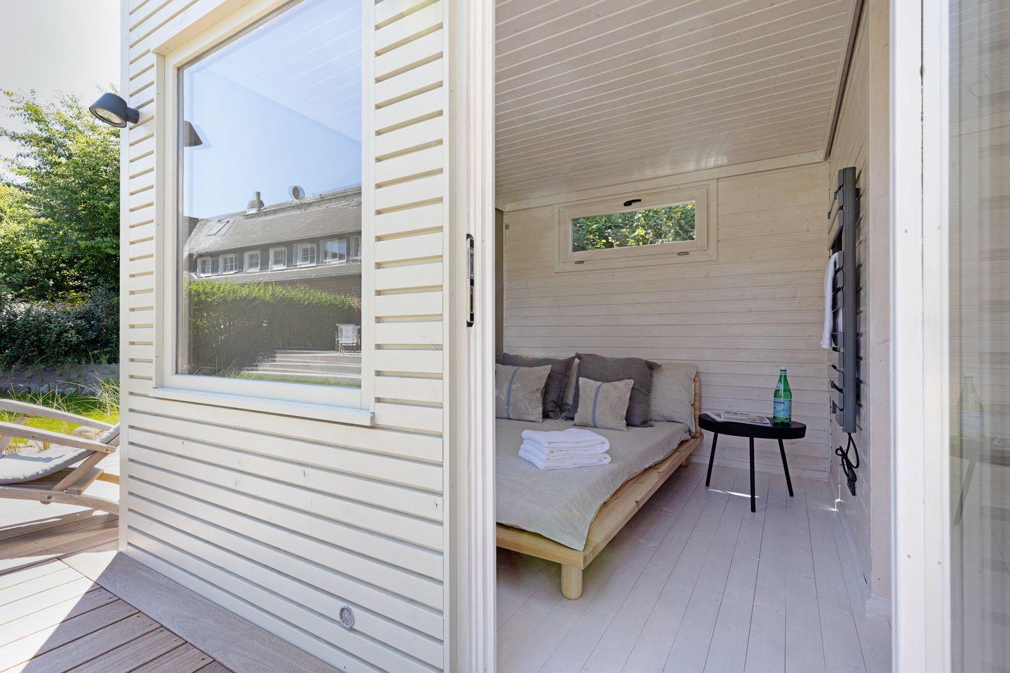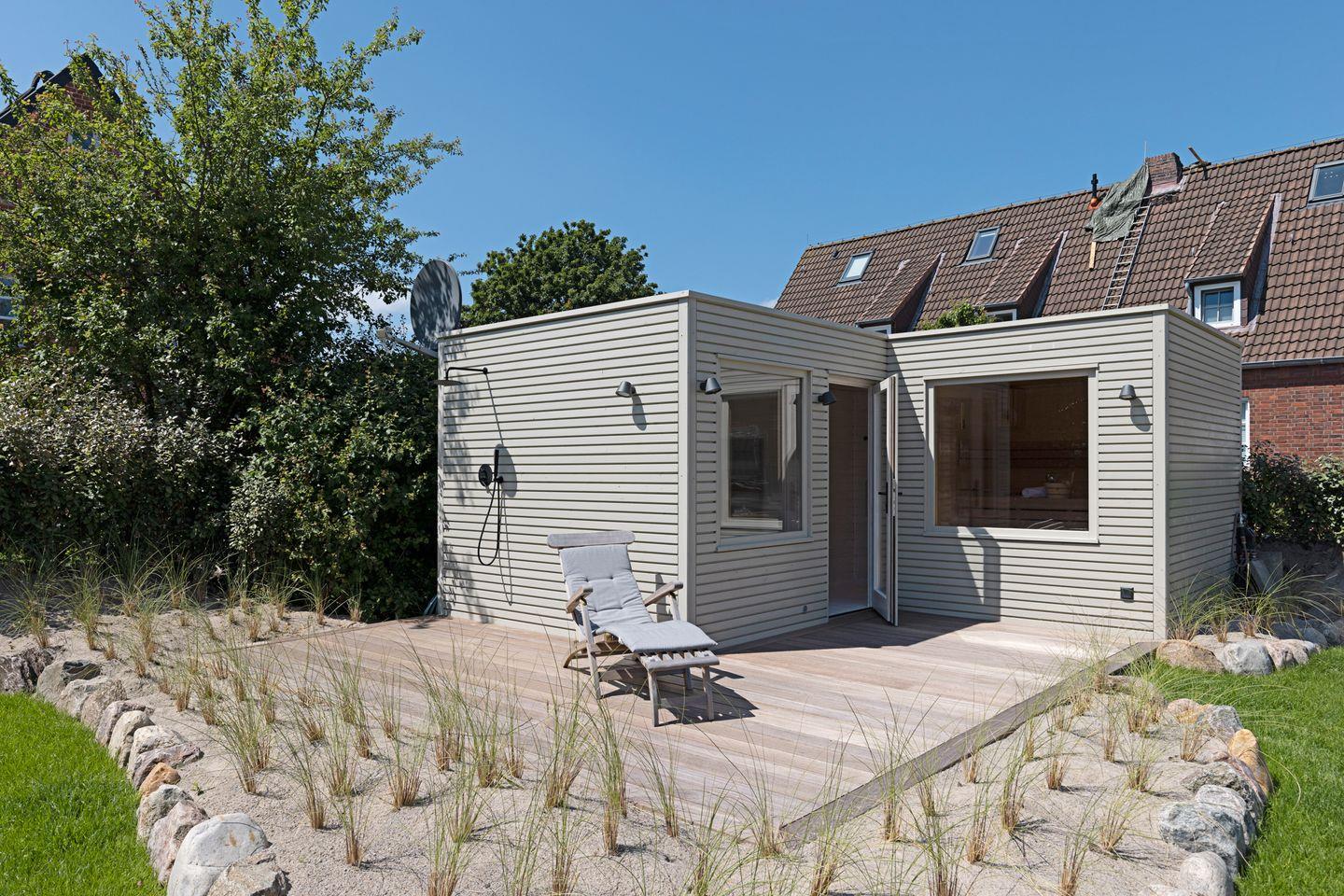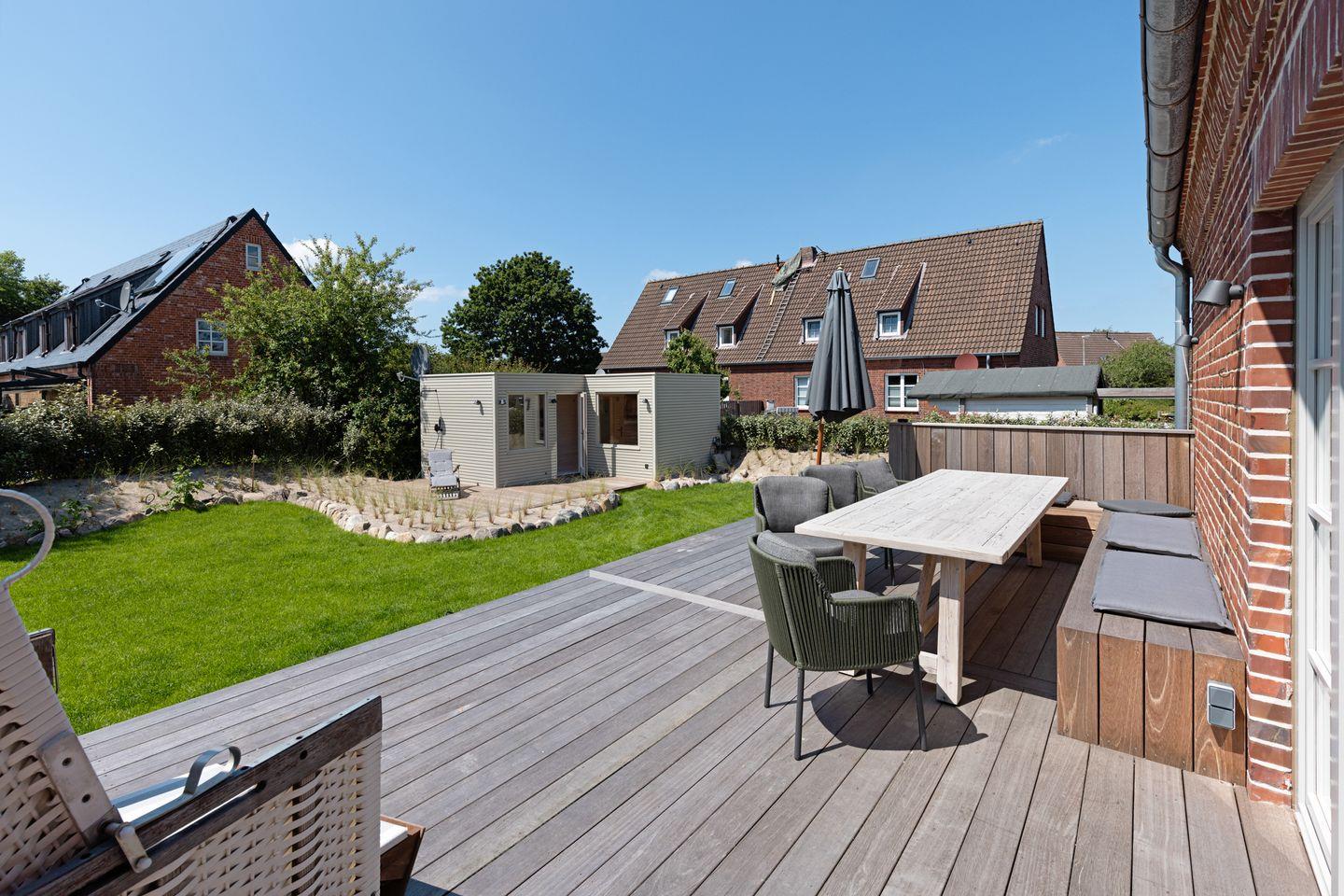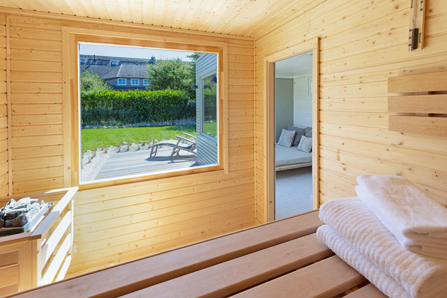 Im Außenbereich erwartet Sie ein sonniger Garten mit zwei Terrassen, Strandkorb, Gartenmöbeln, ein eigenes Saunahaus mit Außendusche sowie einer Relax-Liegefläche – Ihre private Wohlfühloase!