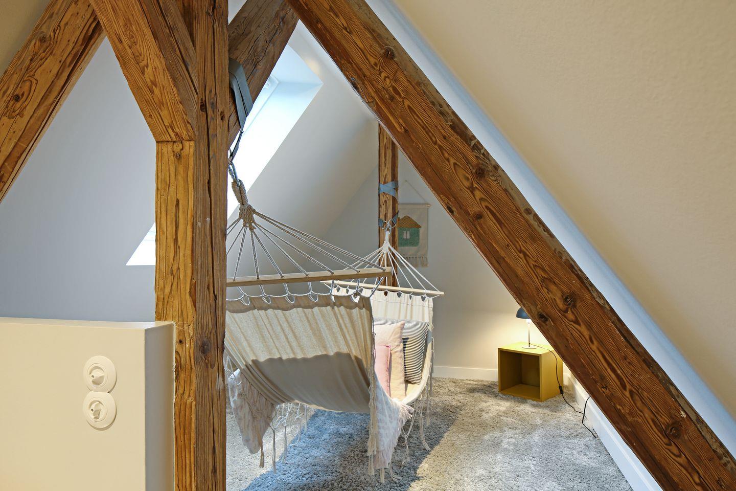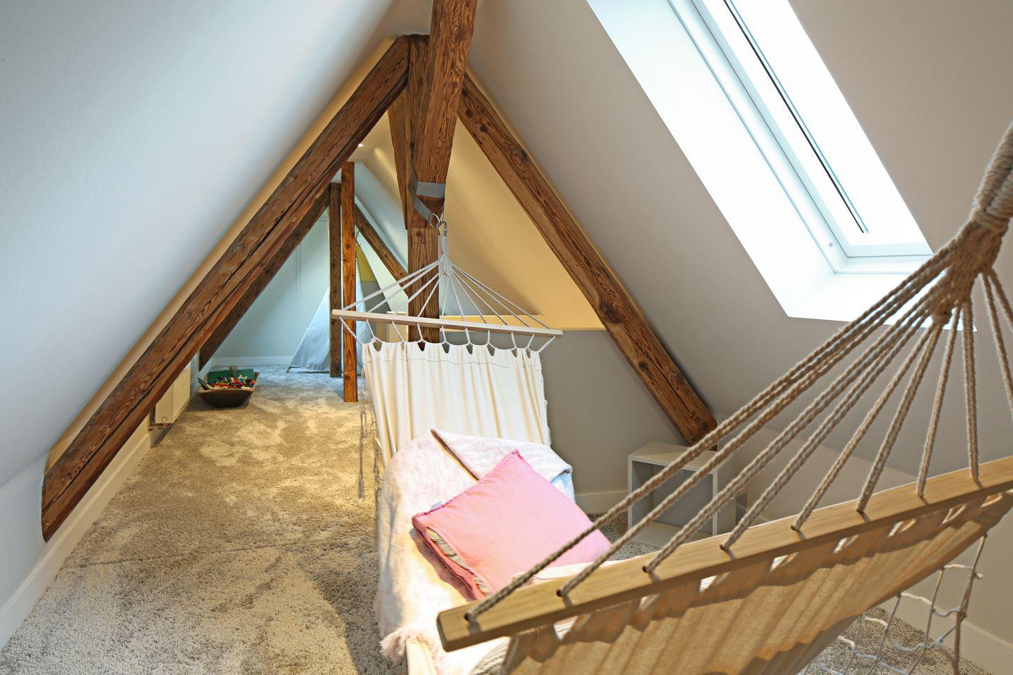 Ein besonderes Highlight ist der gemütliche Spitzboden, der mit einer kuscheligen Kinderspielecke und einer Hängematte ausgestattet ist – ideal zum Zurückziehen und Träumen.