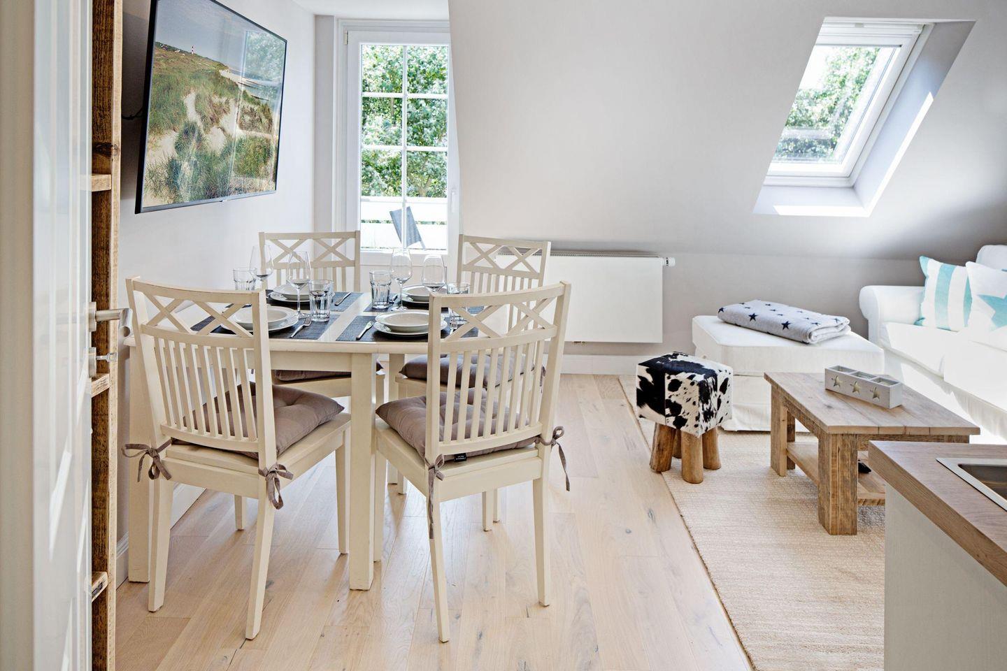 Willkommen im Appartement "Sylter Perle". Das im Obergeschoss gelegene Ferienappartement bietet Ihnen Platz für 4 Personen auf 60m².