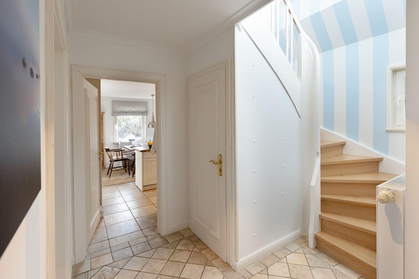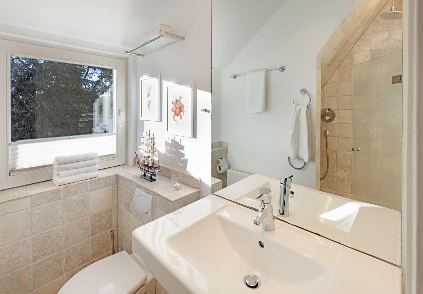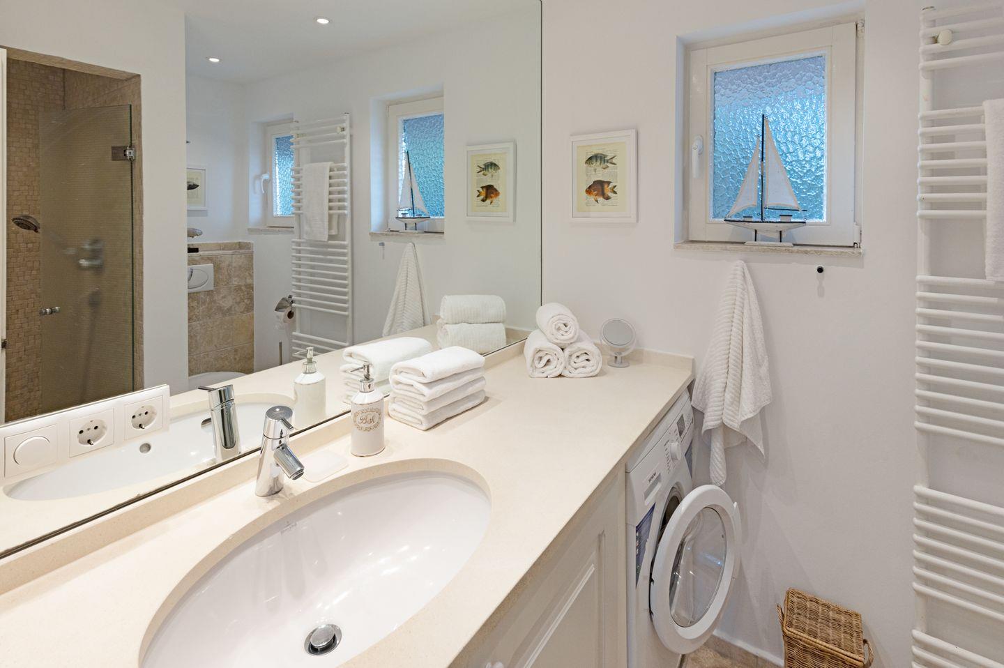 Im ersten Stock liegen drei weitere Schlafräume, jeweils mit Doppelbett und ein Bad mit Badewanne. Eine Waschmaschine steht zur Verfügung.