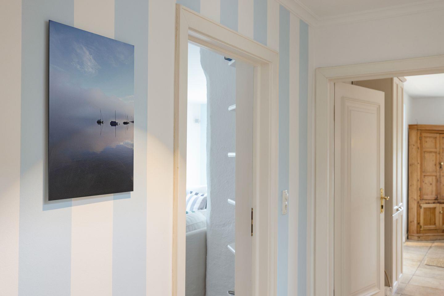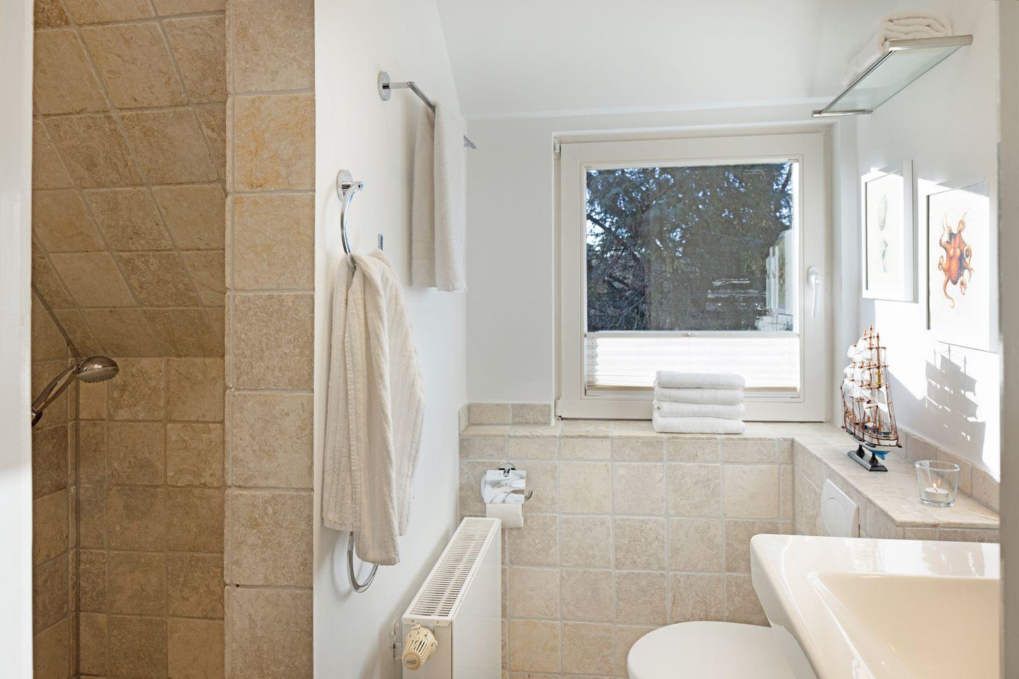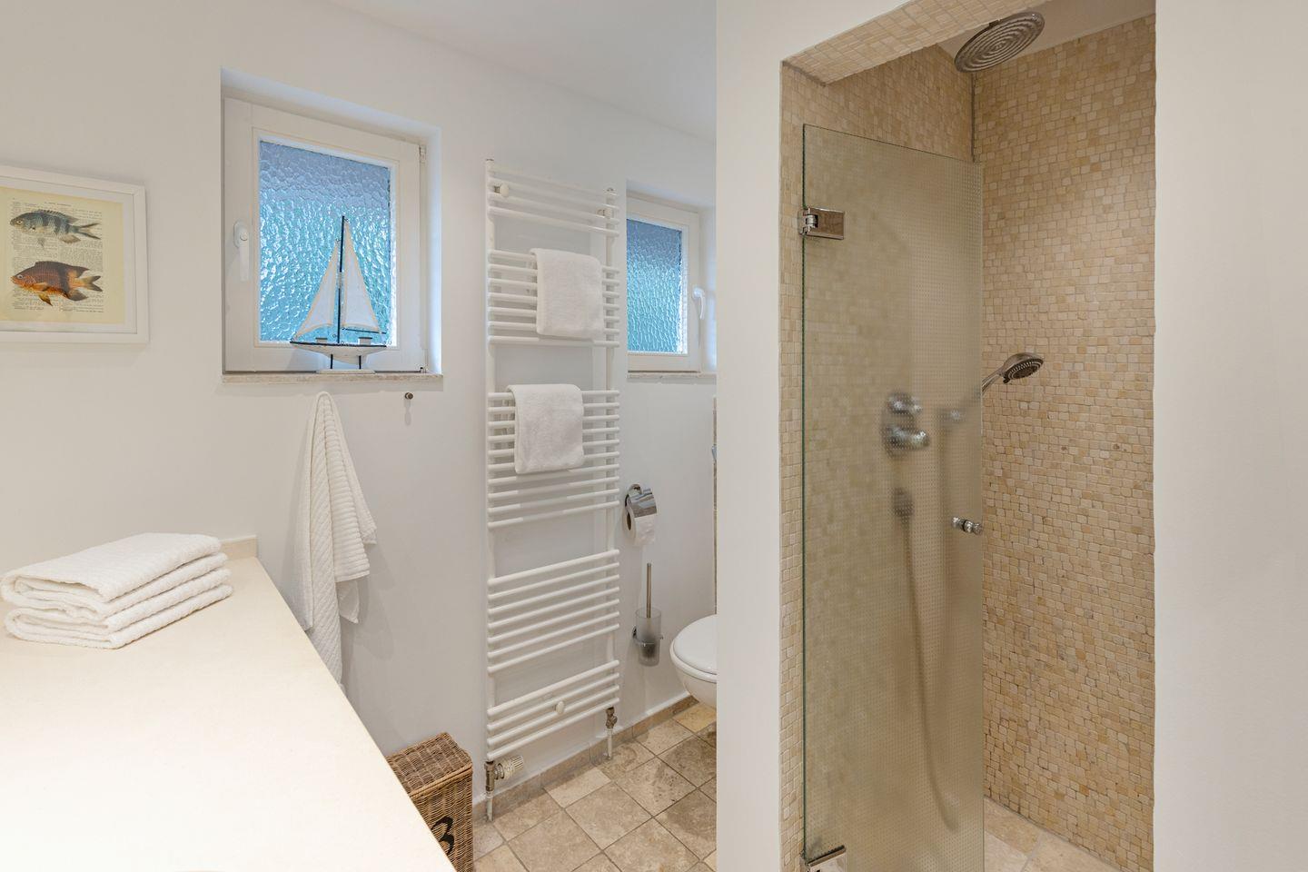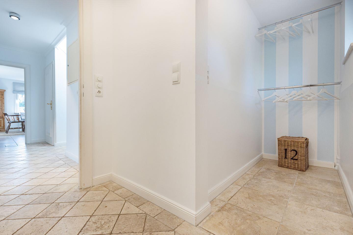Im ersten Stock liegen drei weitere Schlafräume, jeweils mit Doppelbett und ein Bad mit Badewanne. Eine Waschmaschine steht zur Verfügung.