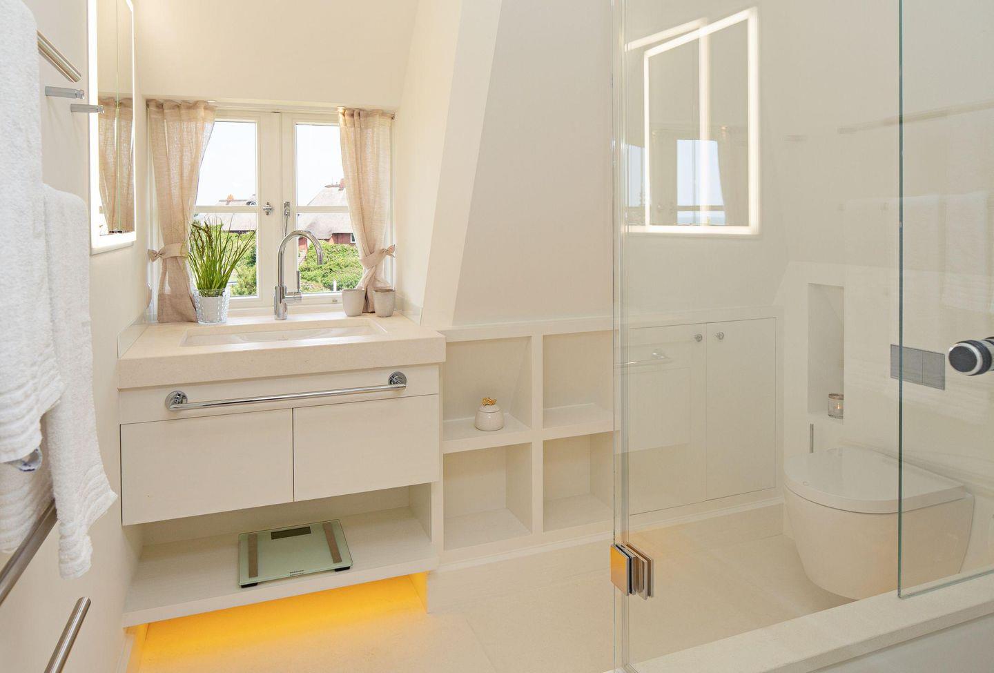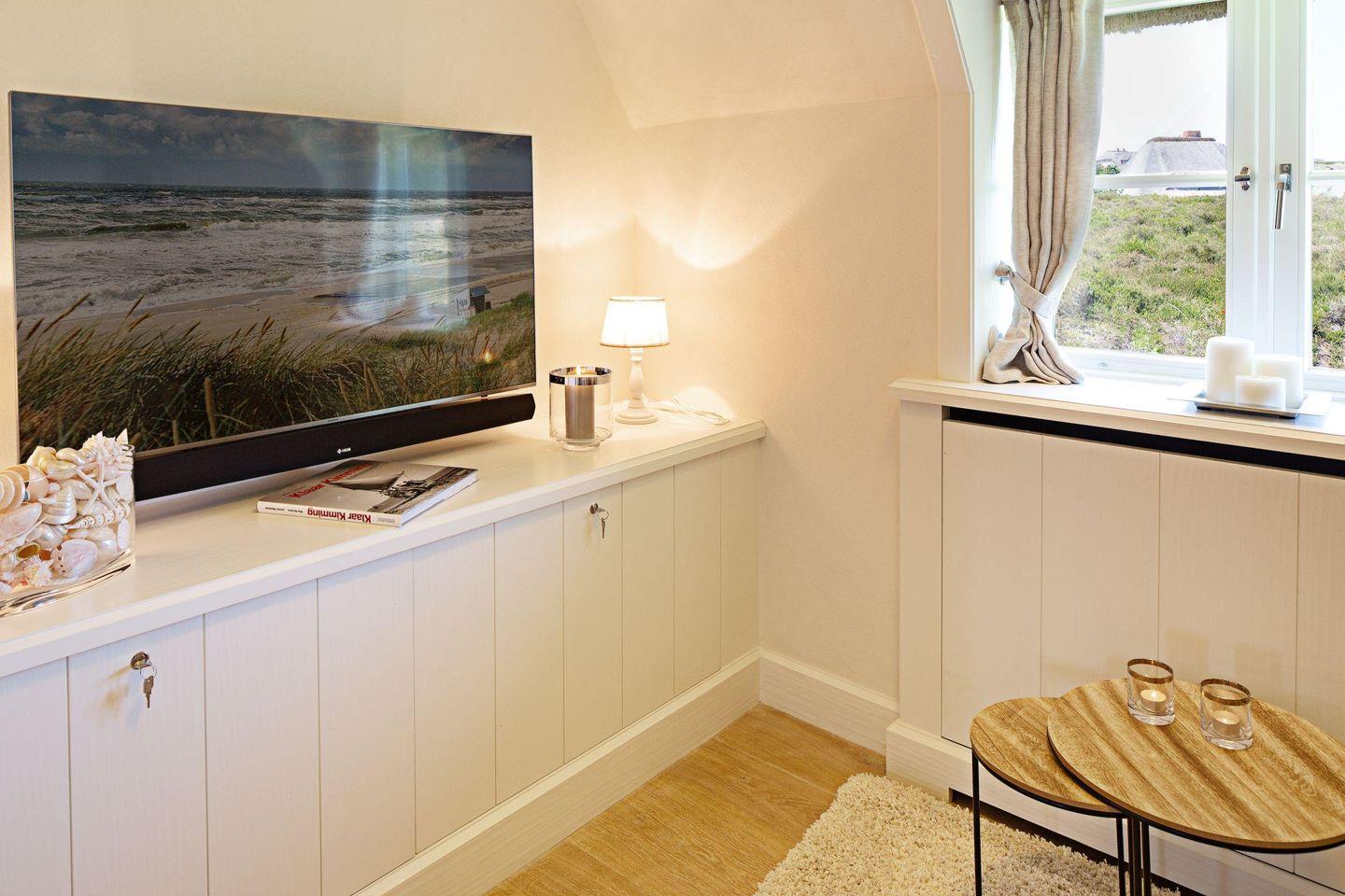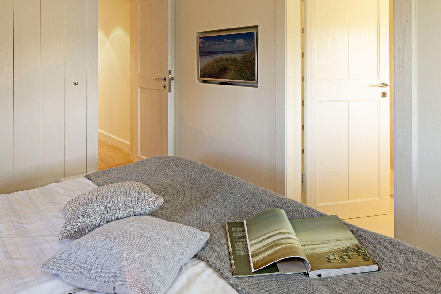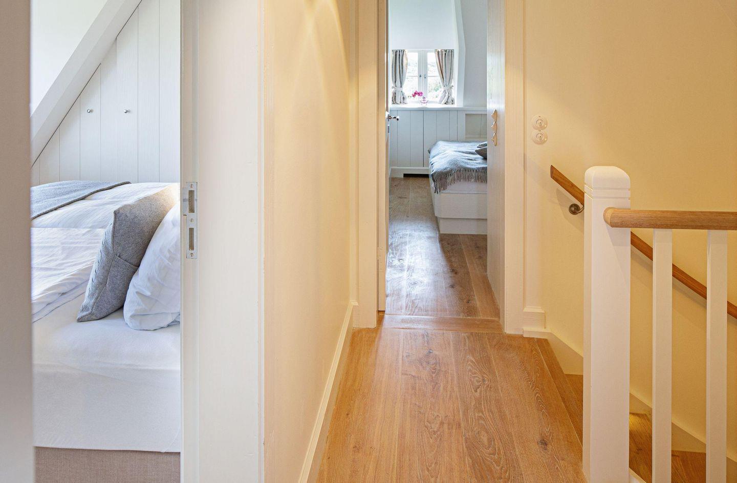 Das EG, im Beachflair gestaltet, bietet mit Gaskamin, offener Landhausküche und dem gemütlichen Fernseh- und Lesezimmer ausreichend Möglichkeiten zur individuellen Nutzung. In der ersten Etage befinden sich drei vollklimatisierte Schlafzimmer mit Doppelbetten und zwei Badezimmer. Ein zusätzliches Bad steht Ihnen im EG zur Verfügung. Vom Essbereich aus gelangen Sie auf die große Sonnenterrasse mit Meerblick. Der Garten geht nahtlos in den Heide-Naturpark über. Großzügig und kuschelig zugleich – ein Objekt, einfach unverwechselbar! Der Oststrand ist 100 m entfernt. Einzelgarage mit Ladestation für Elektrofahrzeuge (Wallbox) sowie Waschmaschine und Trockner sind vorhanden.