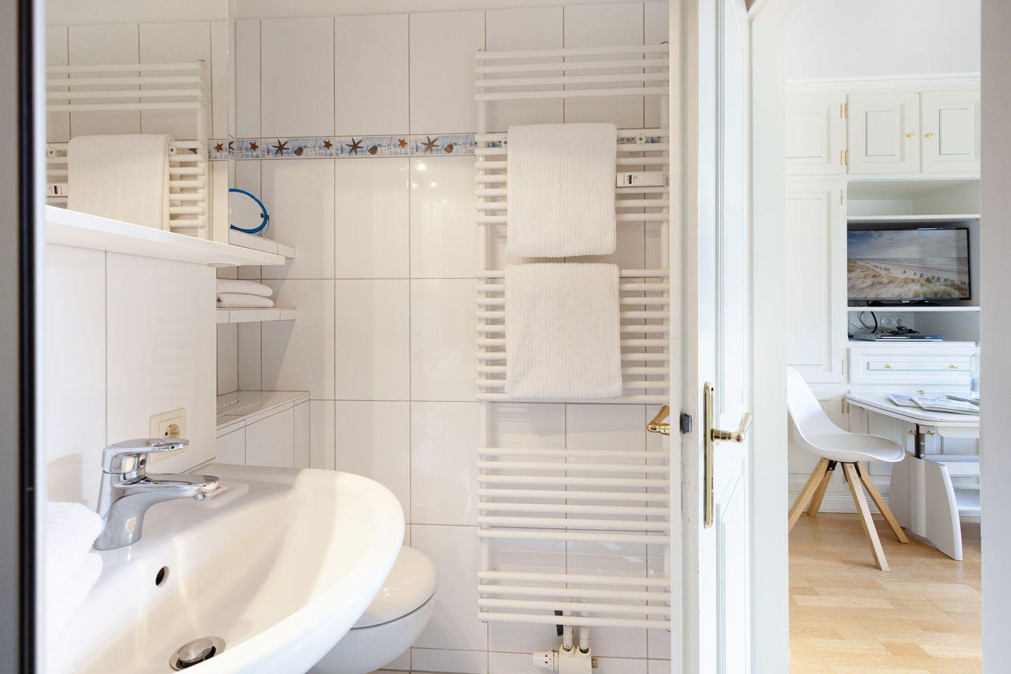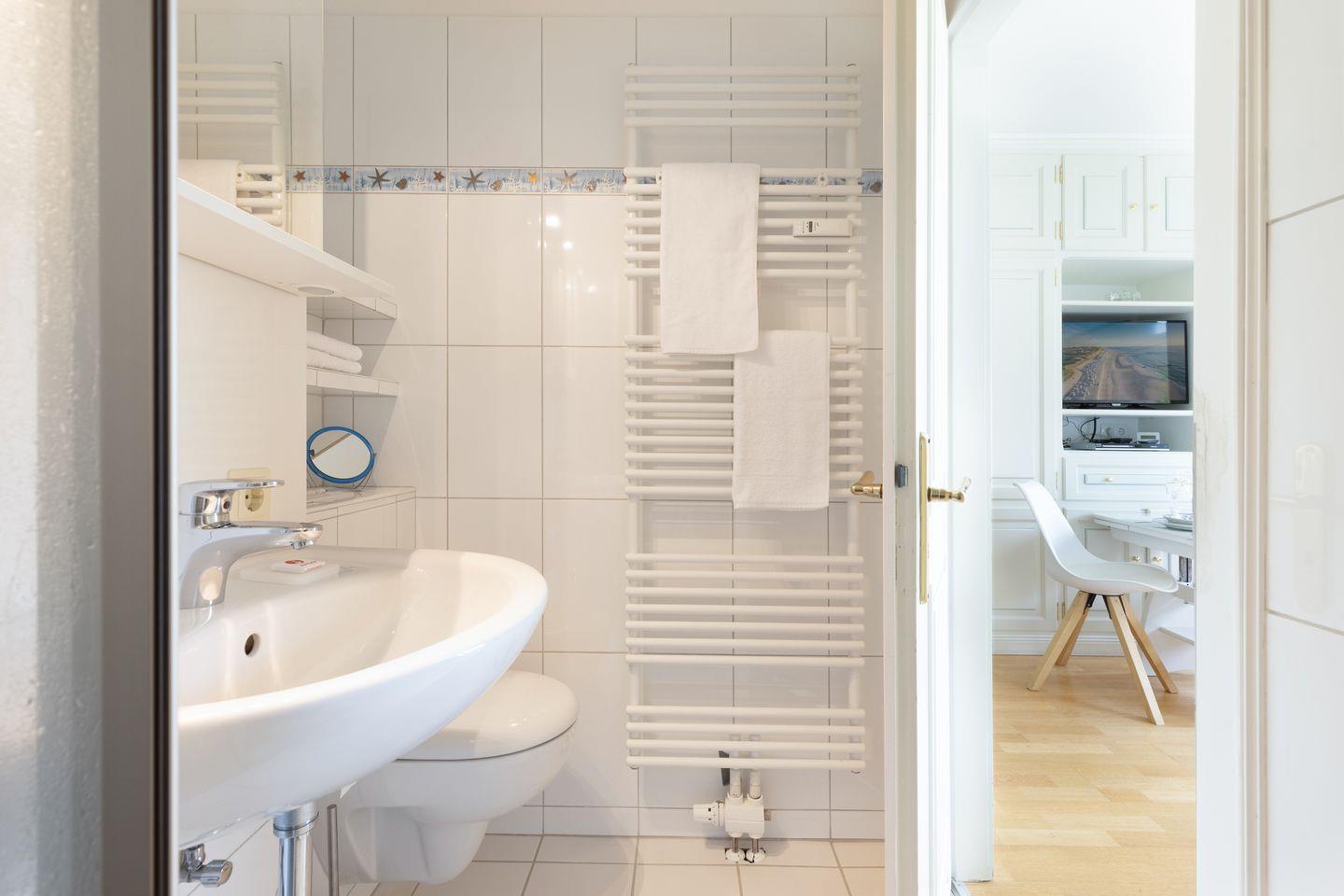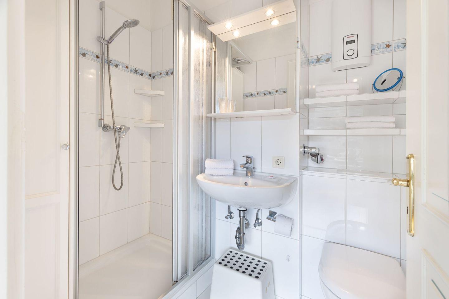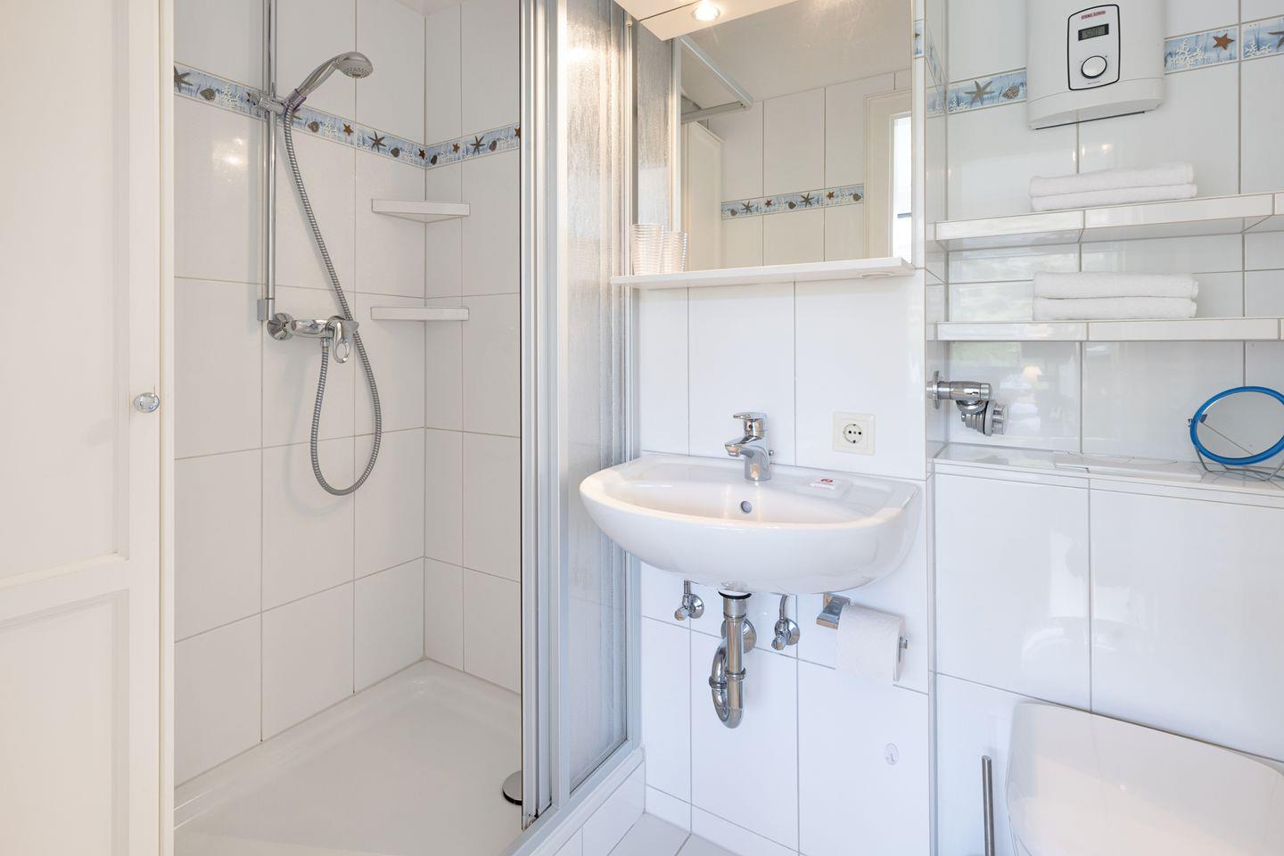 Das Badezimmer ist mit einer Dusche ausgestattet und bietet alles, was Sie für Ihr tägliches Wohlbefinden benötigen. Hier finden Sie auch einen Kosmetikspiegel sowie einen Haartrockner, damit Sie sich nach einem Tag an der frischen Luft entspannt auf den Abend vorbereiten können.