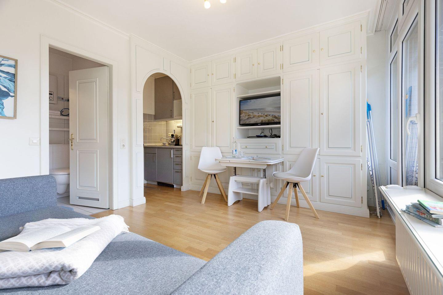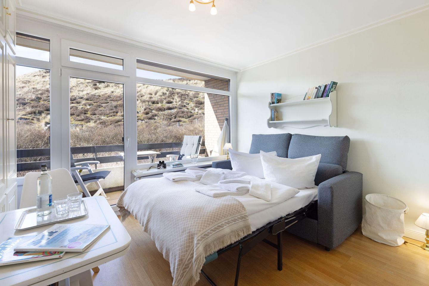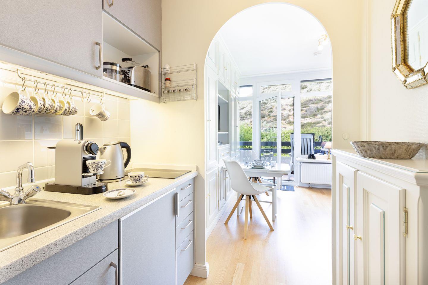 Die Dünenperle liegt im Hochparterre und erstreckt sich über 24 m² – ideal für romantische Auszeiten oder kleine Abenteuer mit Freunden. Sie bietet Schlafmöglichkeiten für bis zu zwei Personen, was sie besonders für Paare oder Alleinreisende attraktiv macht. Die Wohnung ist gemütlich eingerichtet und strahlt eine einladende Atmosphäre aus, die sofort zum Wohlfühlen einlädt.