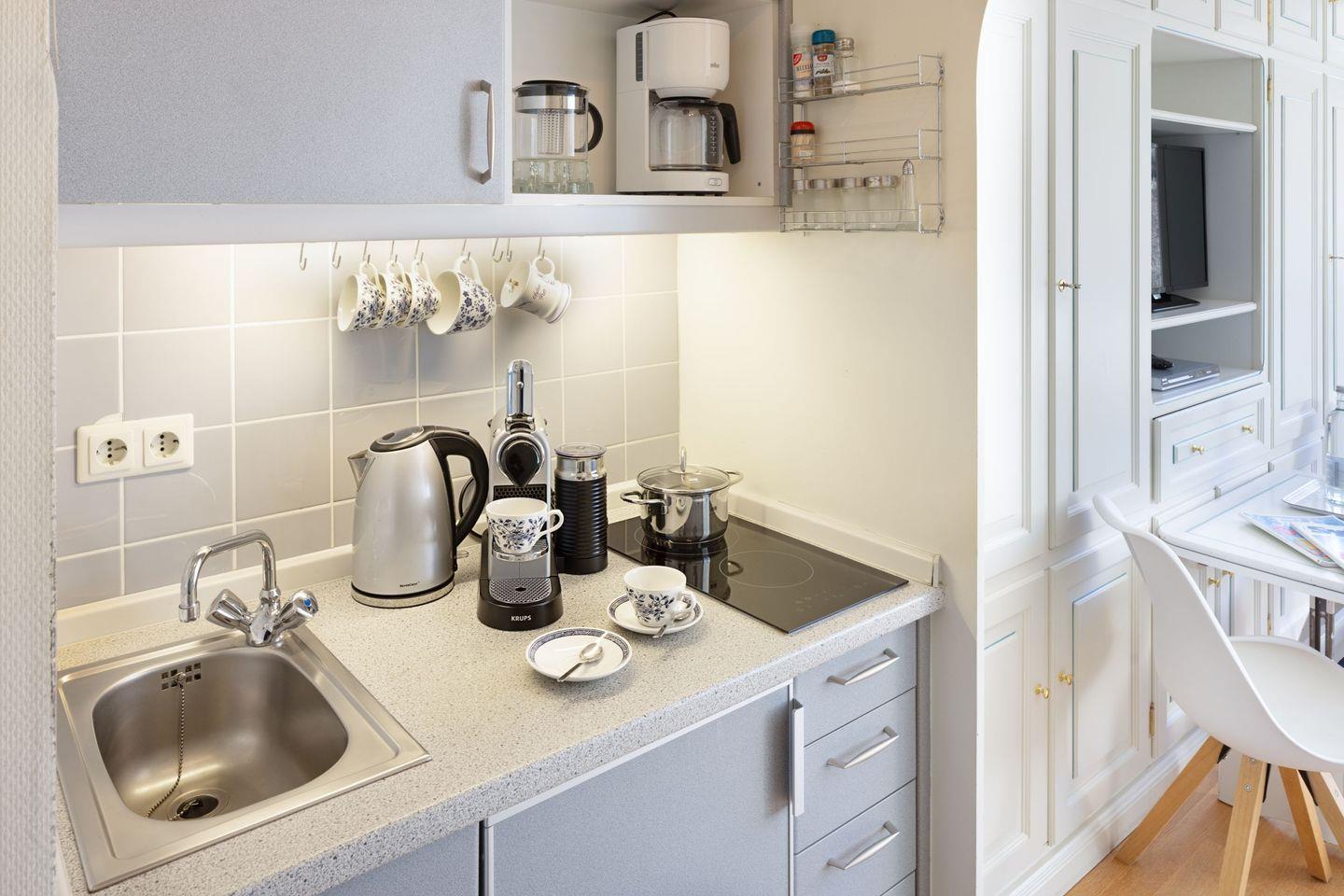Der Wohnbereich/Schlafbereich ist mit einem komfortablen Schlafsofa und einem Esstisch ausgestattet, ideal für entspannte Abende oder gemeinsames Essen. Die Küche verfügt über eine Kochnische mit einem 2-Platten-Herd, Kühlschrank und Gefrierfach, sowie nützlichem Küchenzubehör wie Wasserkocher, Toaster und Kaffeemaschine. Alle Kochutensilien und Geschirr sind vorhanden, so dass Sie ganz nach Ihrem Belieben kochen und backen können.
