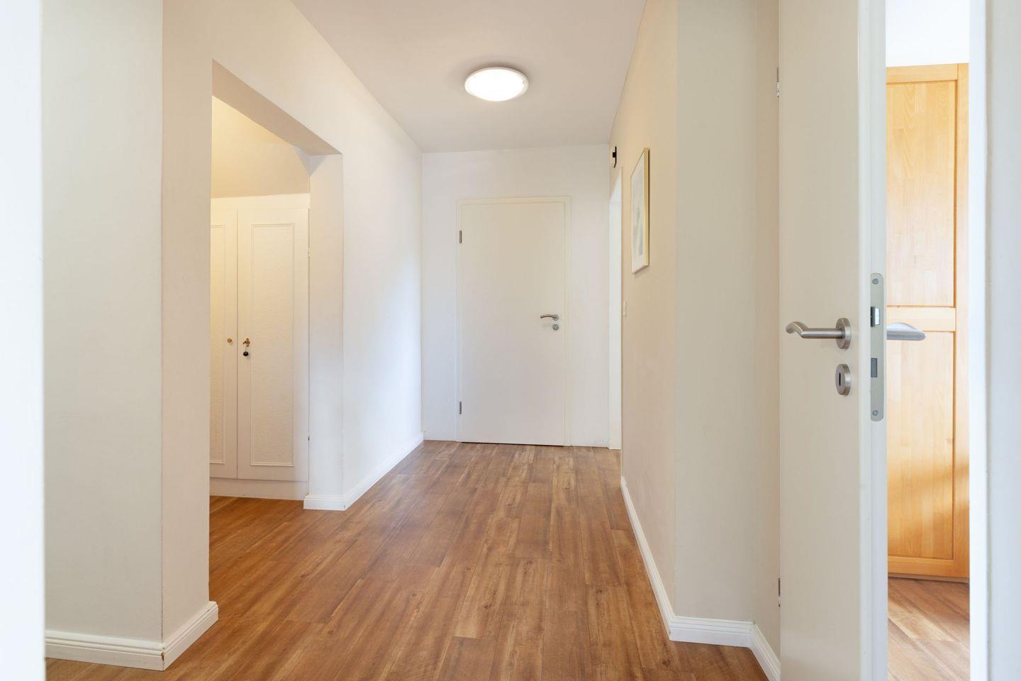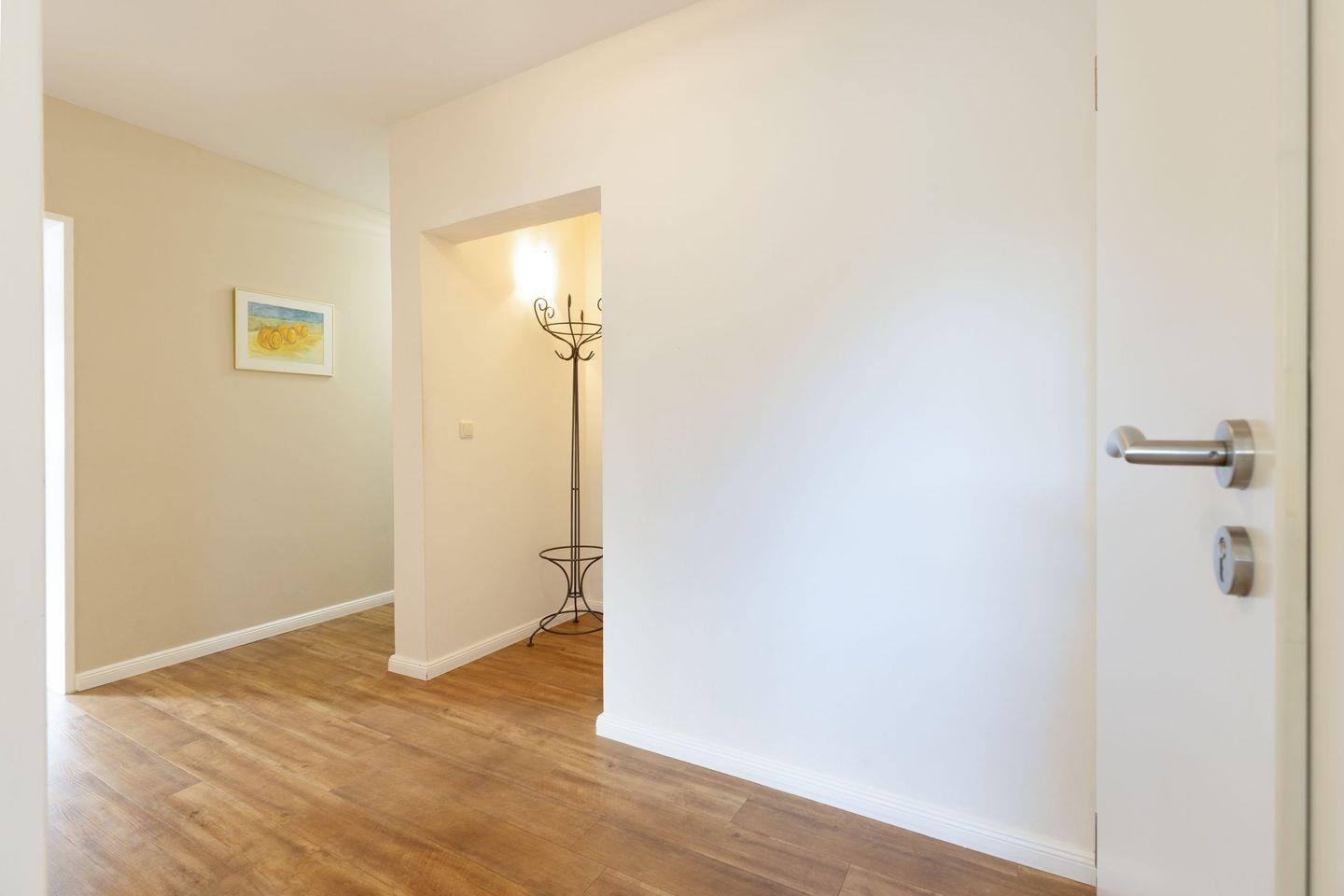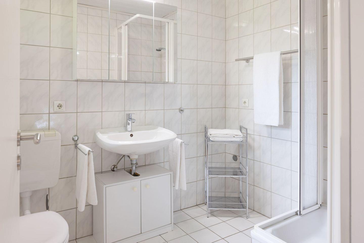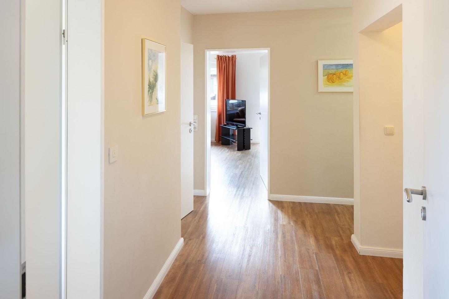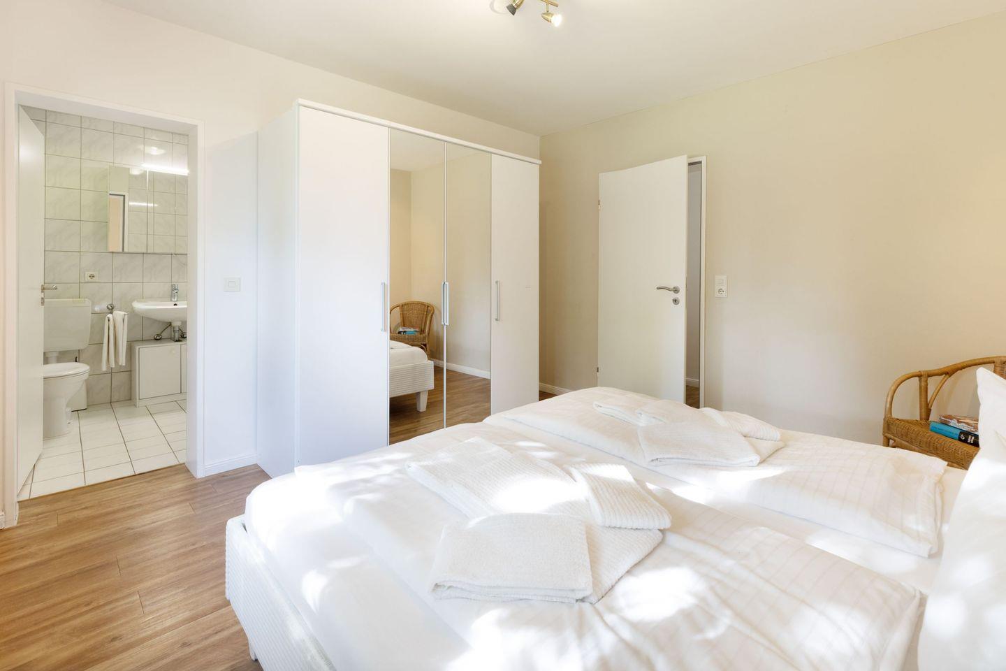 Die 70m² große modern eingerichtete Ferienwohnung hat ein Wohnzimmer, eine separate Küche mit Essplatz und zwei Schlafzimmer. In das Badezimmer gelangen Sie durch das Hauptschlafzimmer.