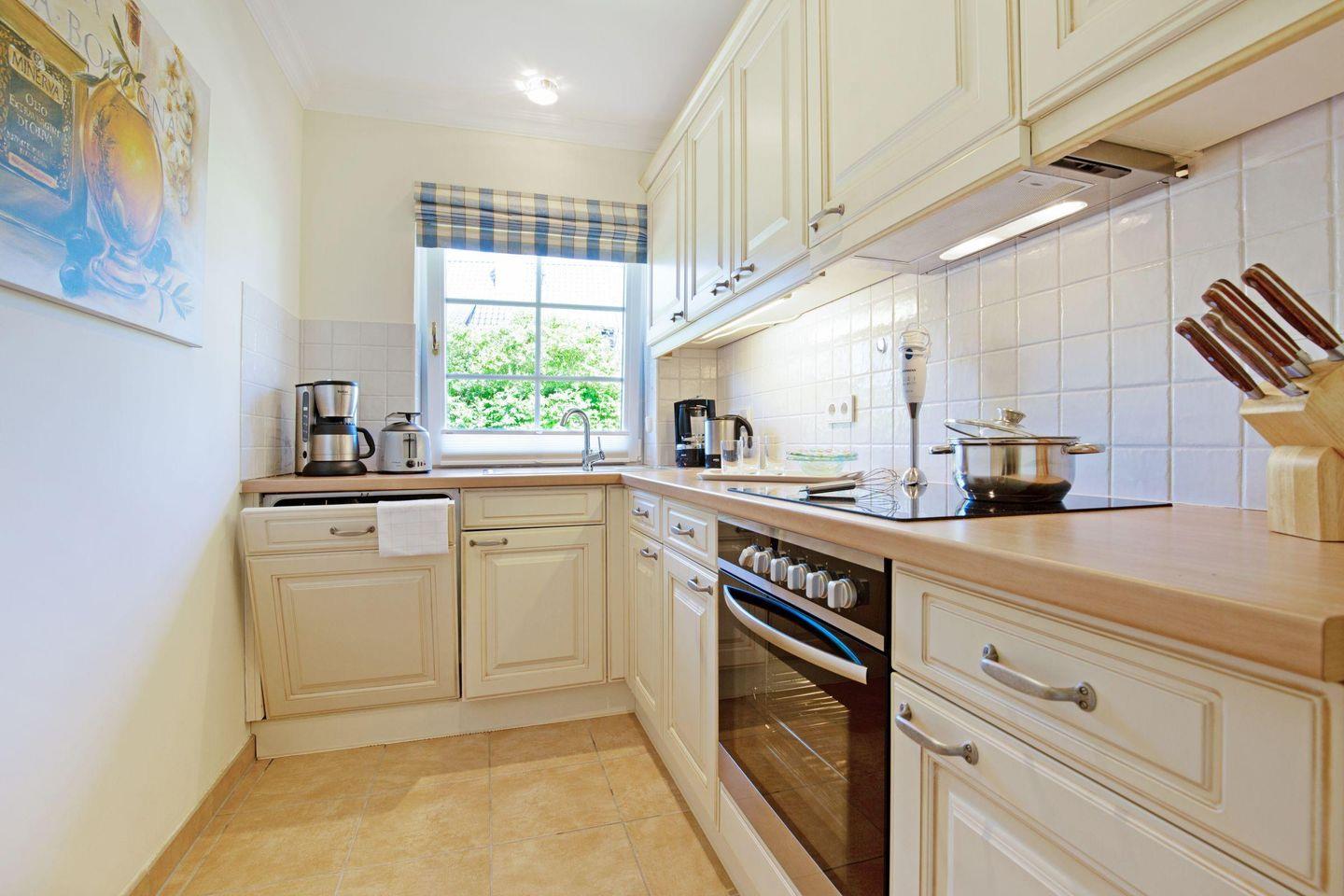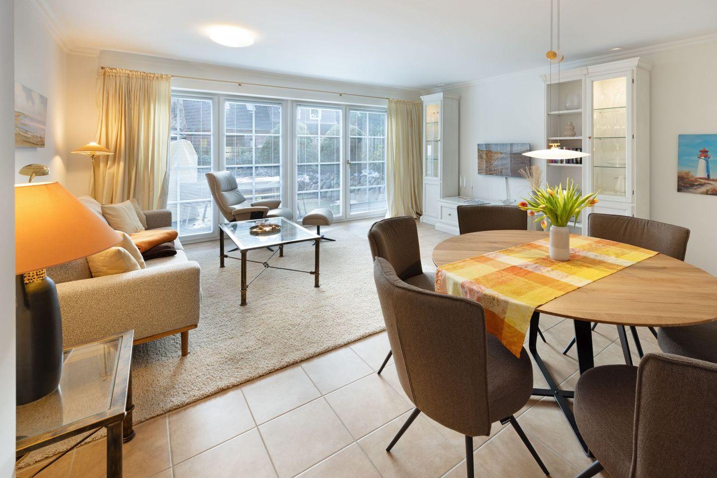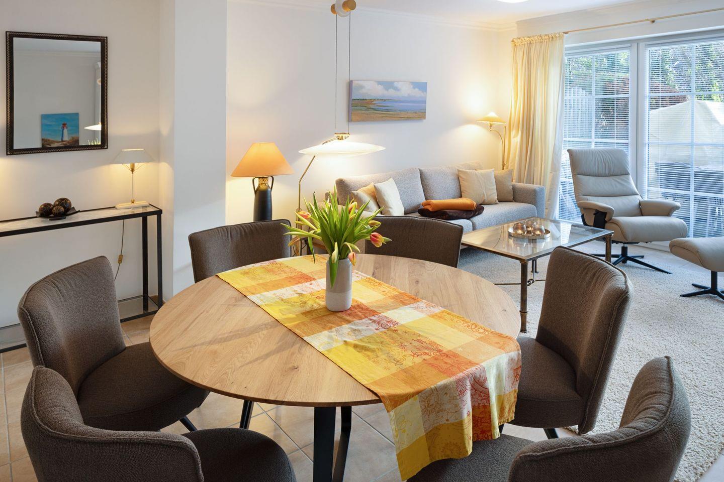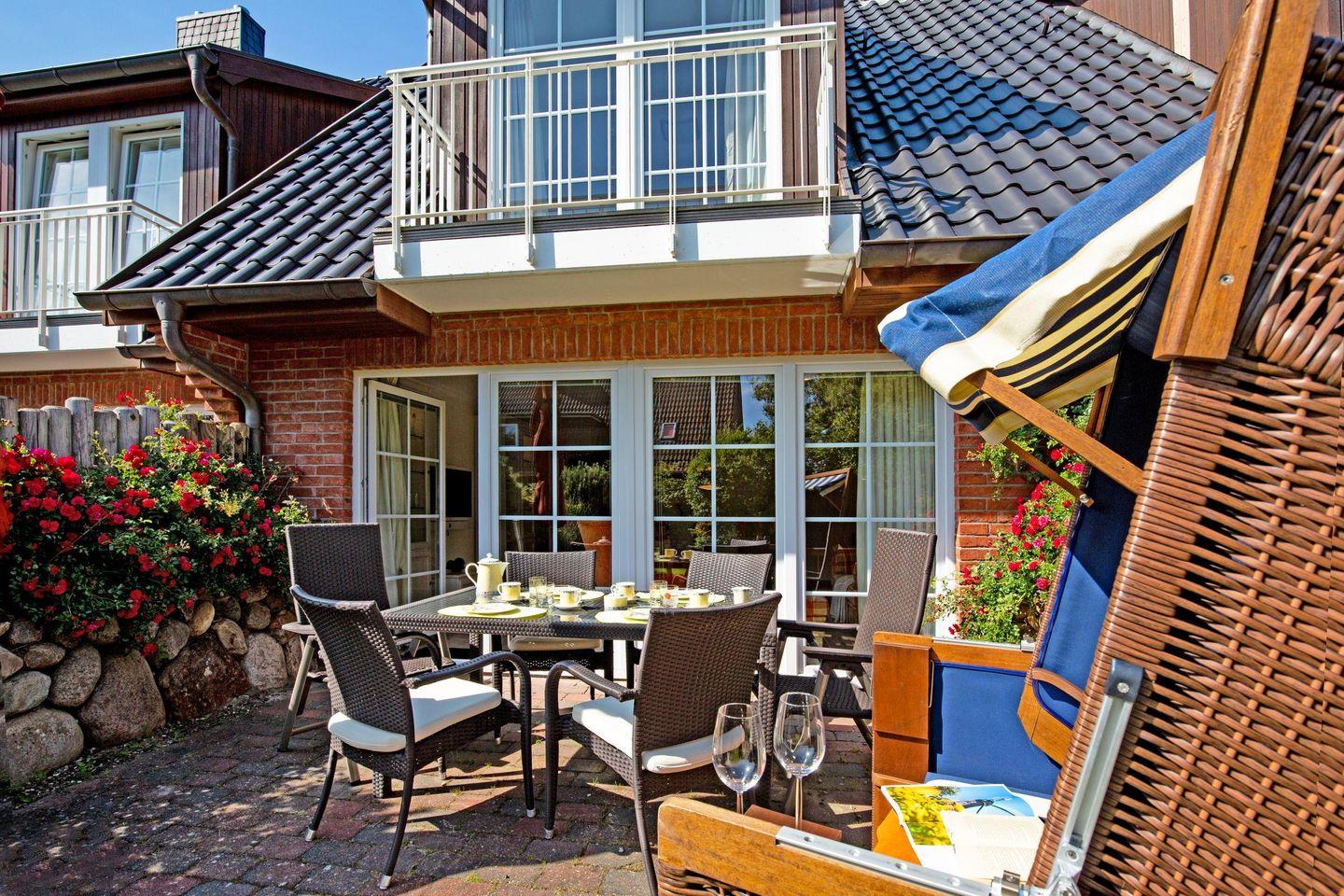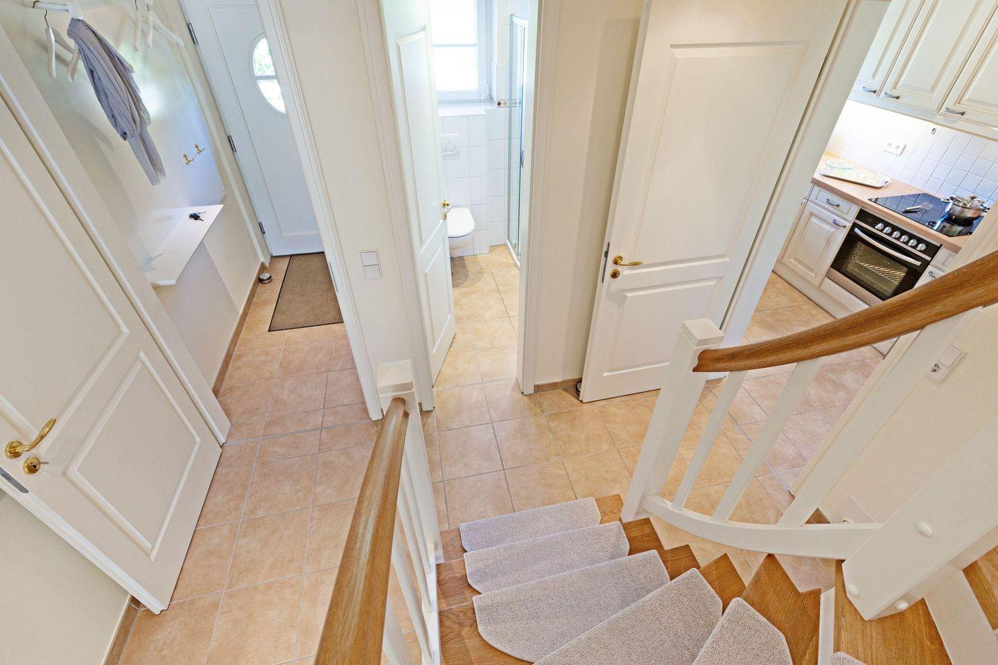 Im Erdgeschoss befindet sich die voll ausgestattete Küche, die eine entspannte Selbstversorgung ermöglicht. Ebenfalls im Erdgeschoss liegen ein Duschbad sowie der gemütliche Wohn- und Essbereich mit direktem Zugang zur privaten Terrasse. Hier können Sie sonnige Stunden im Strandkorb oder auf den bequemen Gartenmöbeln verbringen und dabei die frische Nordseeluft genießen.
