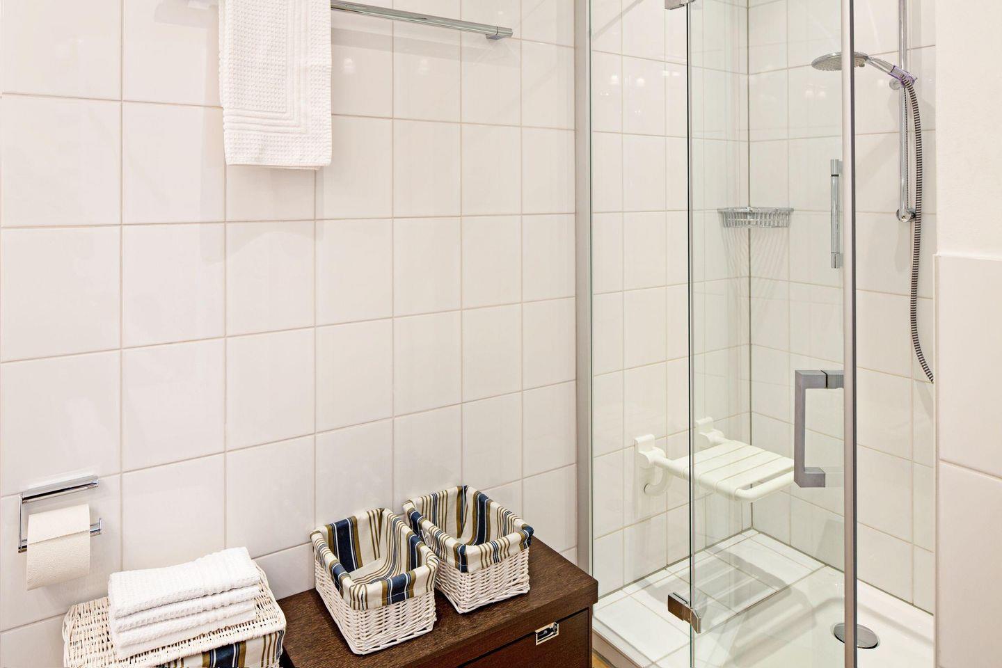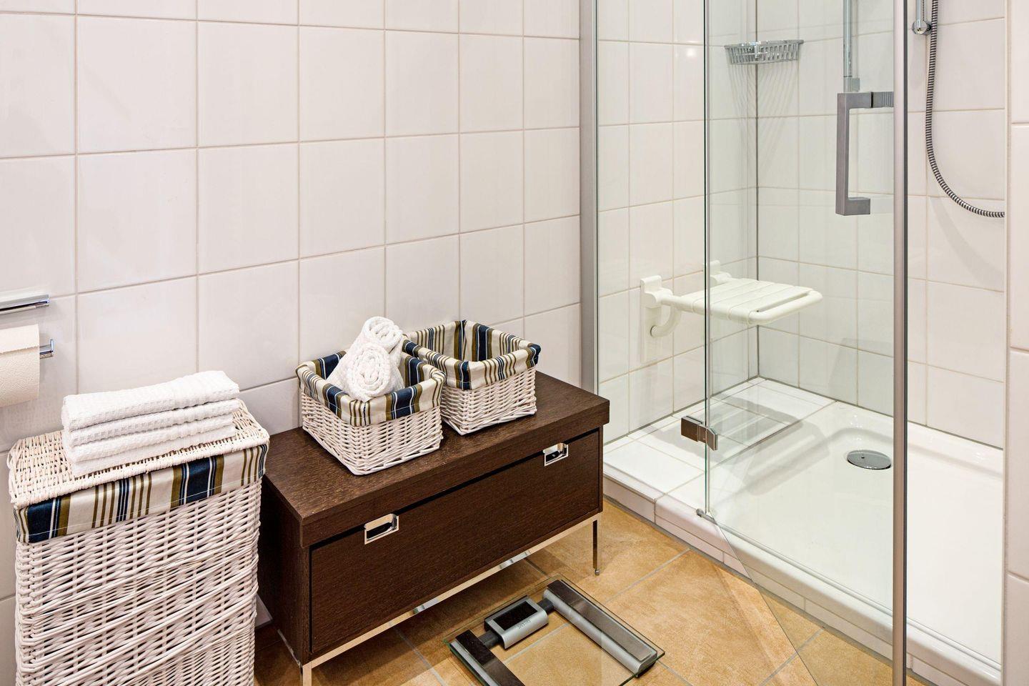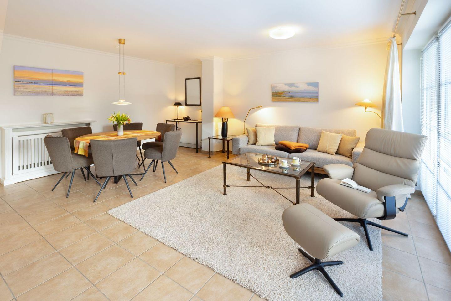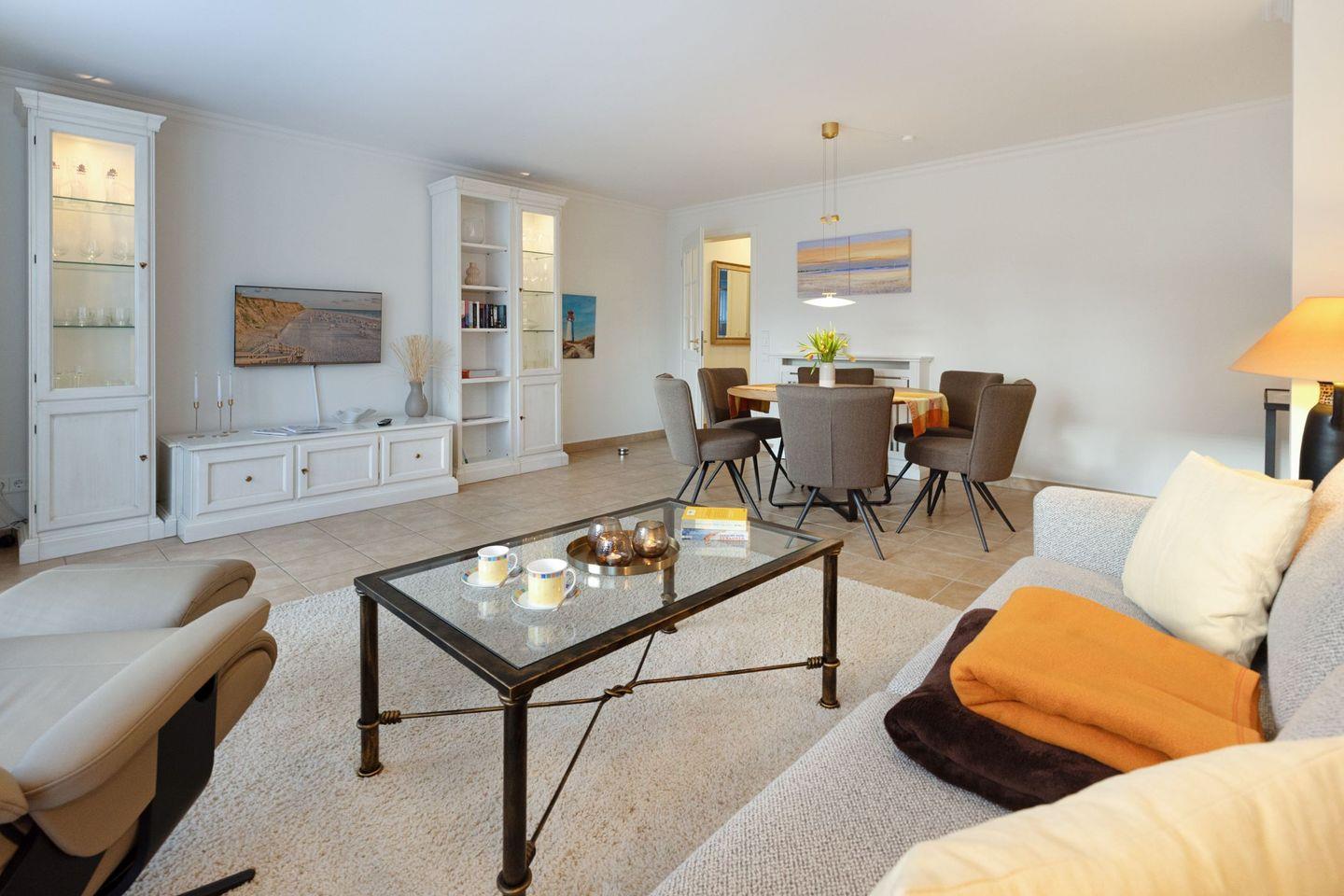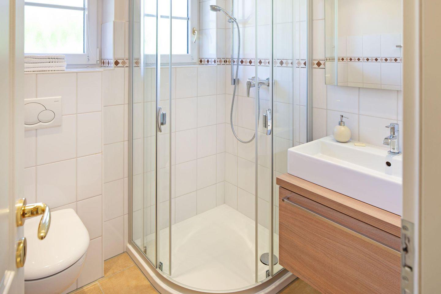 Im Erdgeschoss befindet sich die voll ausgestattete Küche, die eine entspannte Selbstversorgung ermöglicht. Ebenfalls im Erdgeschoss liegen ein Duschbad sowie der gemütliche Wohn- und Essbereich mit direktem Zugang zur privaten Terrasse. Hier können Sie sonnige Stunden im Strandkorb oder auf den bequemen Gartenmöbeln verbringen und dabei die frische Nordseeluft genießen.