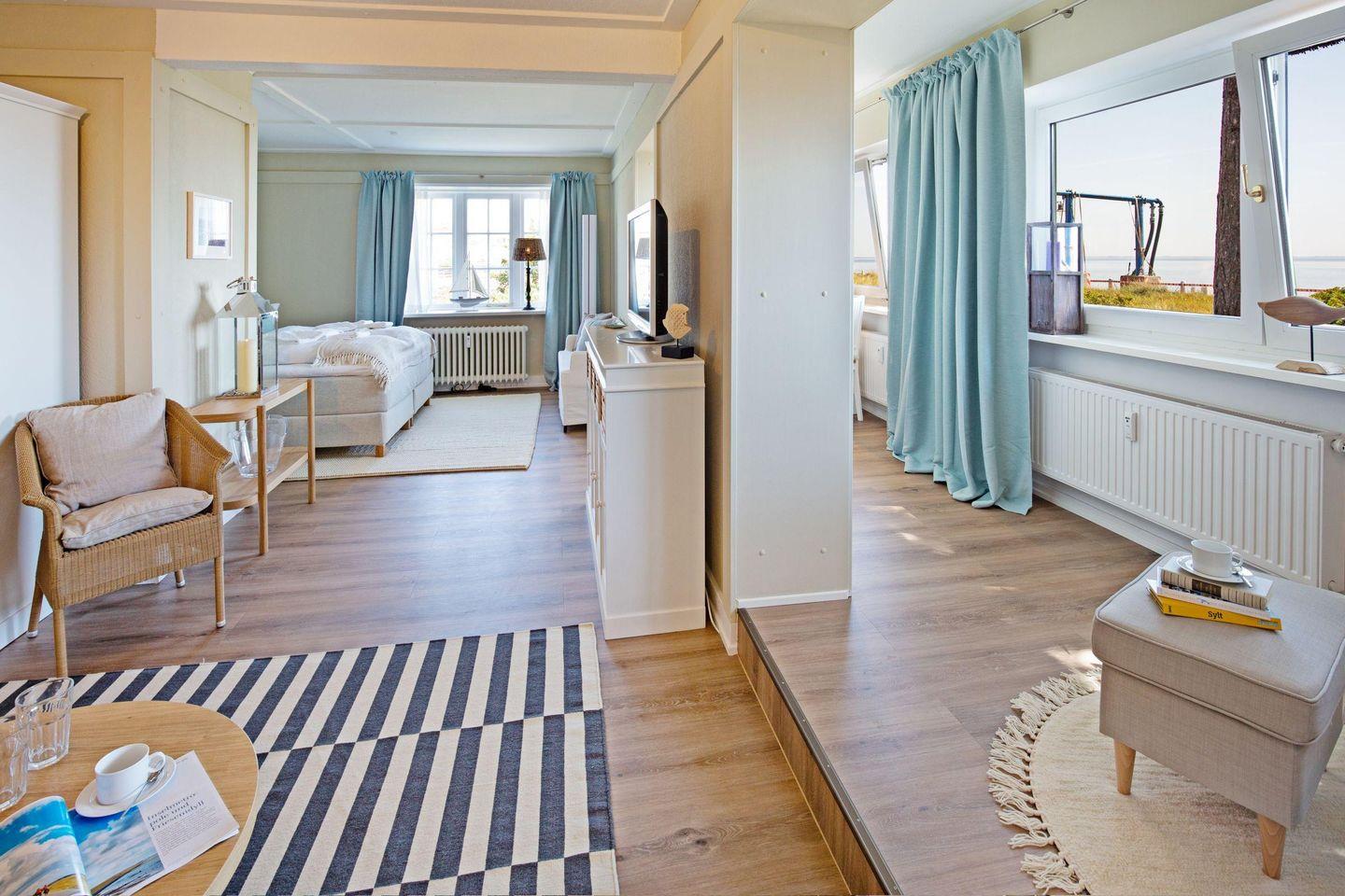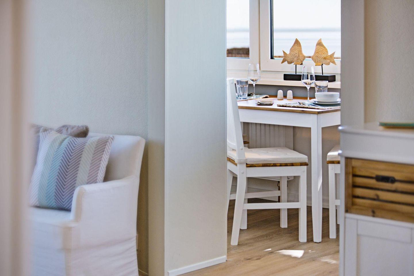 Willkommen im Appartement "Strandauster" unter Reet im Frischwassertal direkt am Wattenmeer. Das Ferienappartement im Erdgeschoß für bis zu 4 Personen besticht durch seine offene Struktur. Wohnzimmer, Küche und das erste Schlafzimmer mit Doppelbett gehen ineinander über. Ergänzt wird das Appartement mit einem zweiten separaten Schlafzimmer mit Doppelbett und ein Wannenbad.