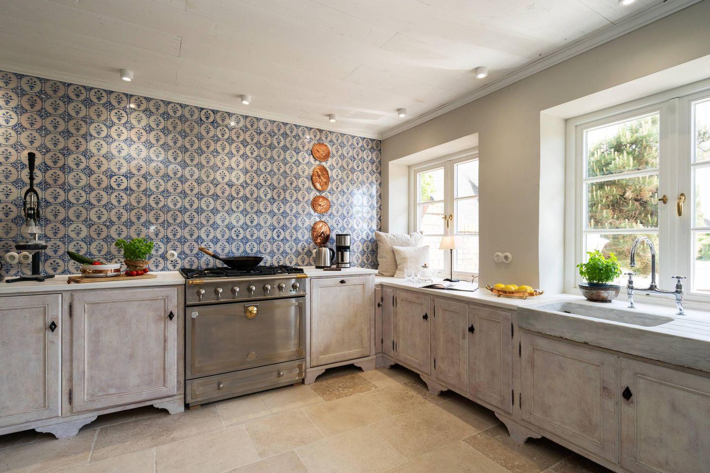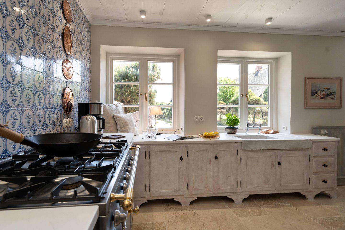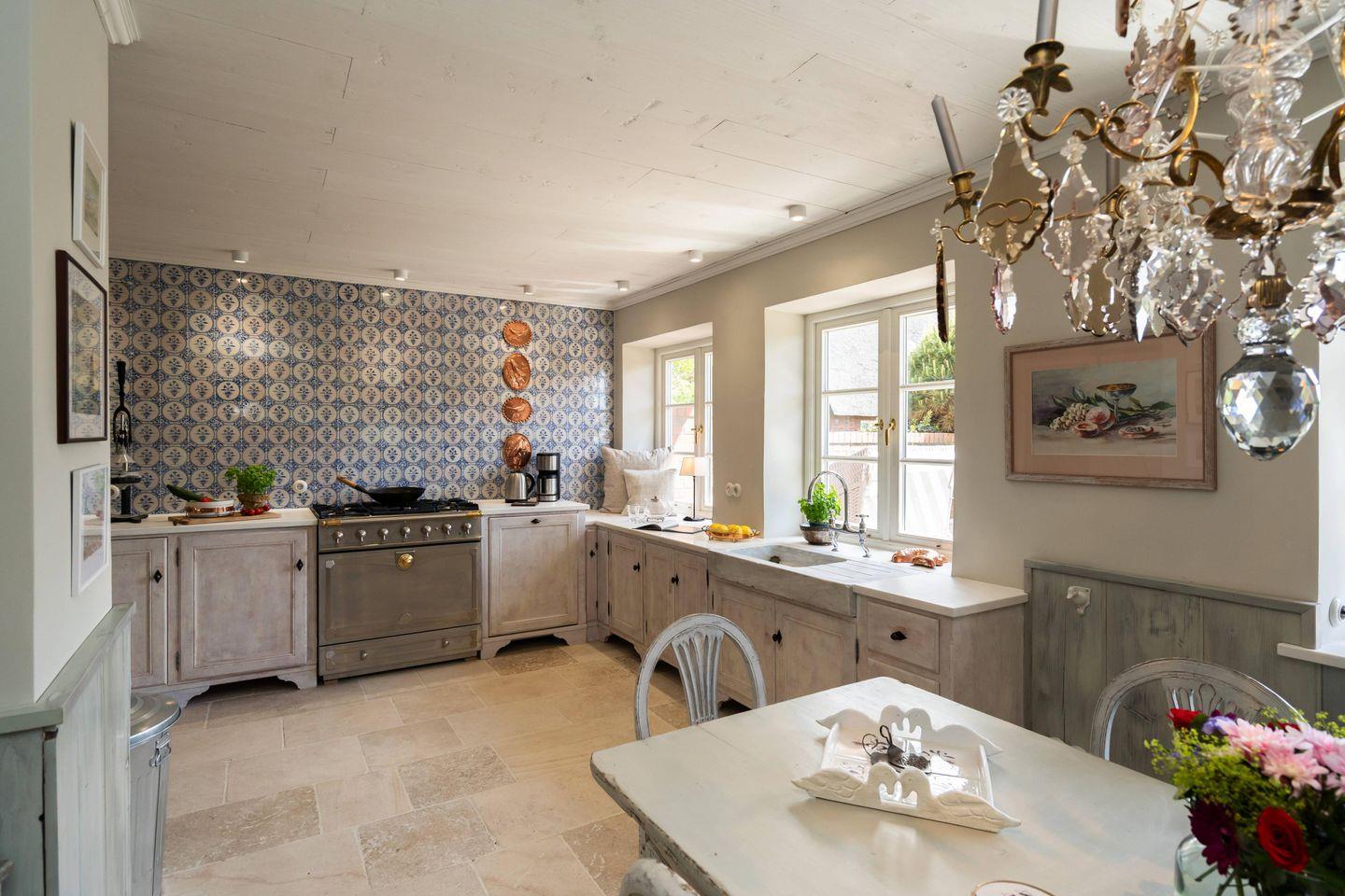 Der großzügige offene Küchen- und Essbereich mit gustavianischem Kronleuchter, einem charaktervollen La Cornue Ofen und zahlreichen hochwertigen Extras wie KitchenAid, Backzubehör, Fondue-Set oder Hummerbesteck lädt zu stilvollen Genussmomenten ein, während der separate Wohnbereich mit Kaminofen behagliche Abende voller Ruhe und Entspannung verspricht.