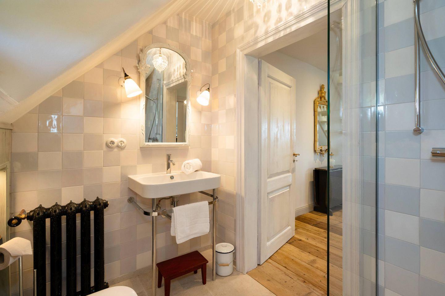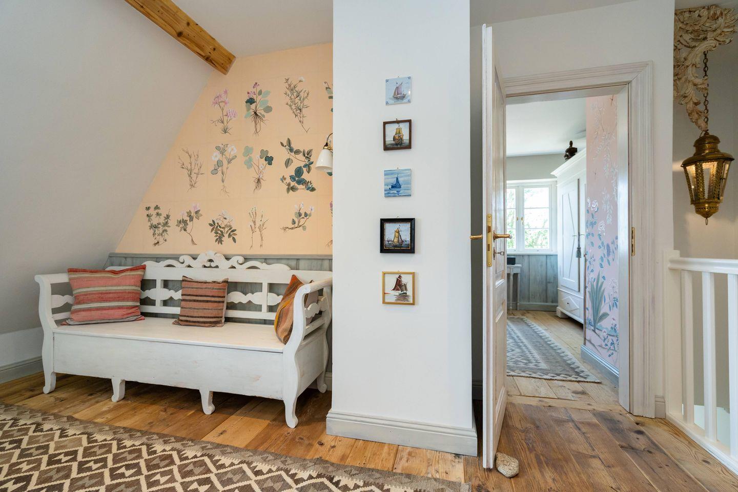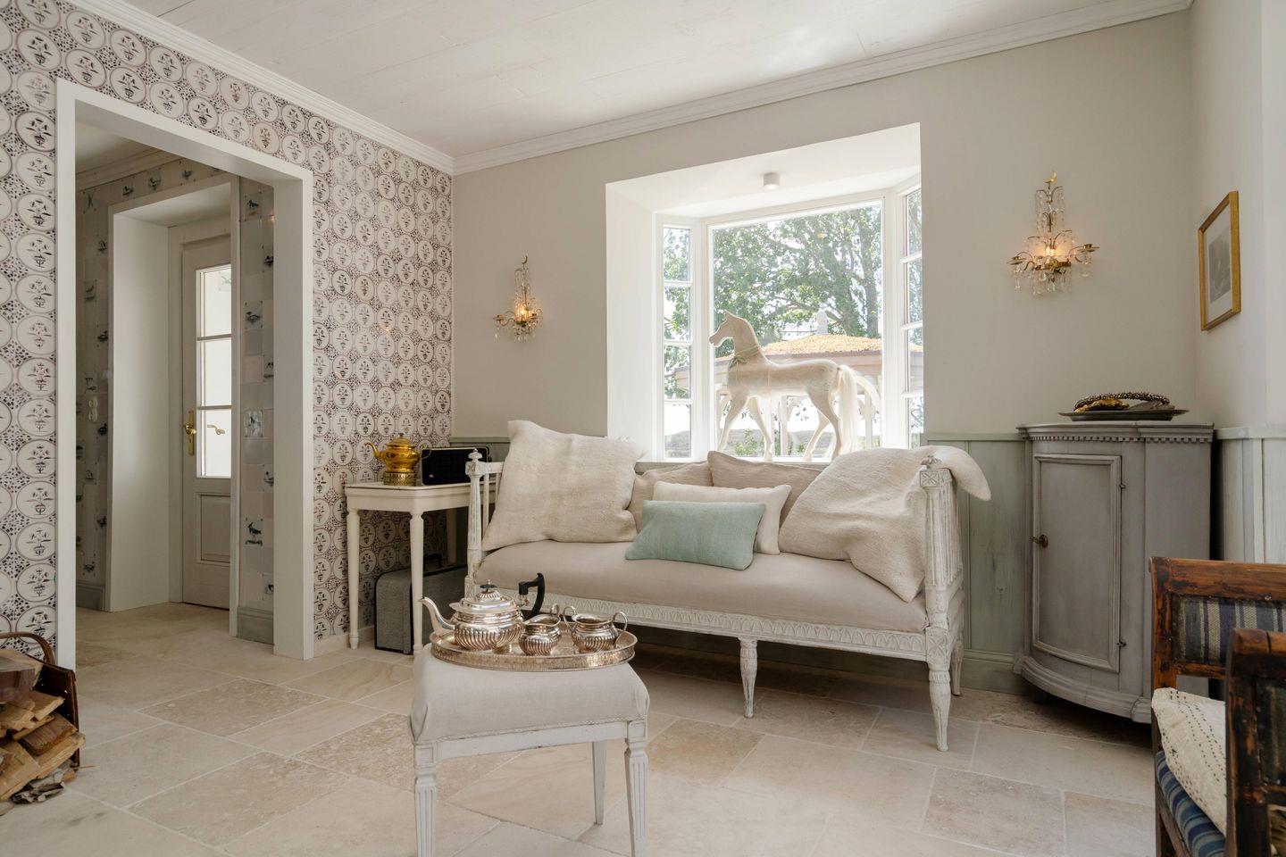 Der großzügige offene Küchen- und Essbereich mit gustavianischem Kronleuchter, einem charaktervollen La Cornue Ofen und zahlreichen hochwertigen Extras wie KitchenAid, Backzubehör, Fondue-Set oder Hummerbesteck lädt zu stilvollen Genussmomenten ein, während der separate Wohnbereich mit Kaminofen behagliche Abende voller Ruhe und Entspannung verspricht.