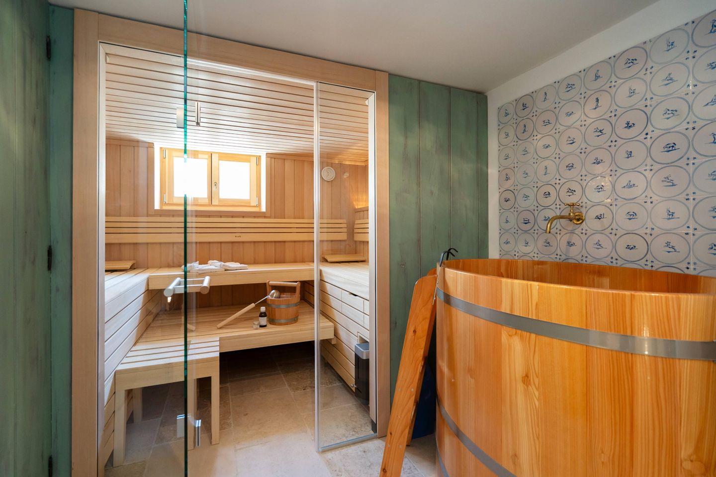 Für Wellness auf höchstem Niveau stehen eine finnische Sauna, ein Infrarotsitz und eine Eisbadtonne inhouse zur Verfügung. Das moderne Heimkino im Untergeschoss verbindet erstklassige Technik mit exklusivem Séparée-Flair – ideal für stimmungsvolle Filmabende. Ebenso im Untergeschoss befinden sich eine Waschmaschine und ein Trockner, die besonders bei längeren Aufenthalten zusätzlichen Komfort bieten.