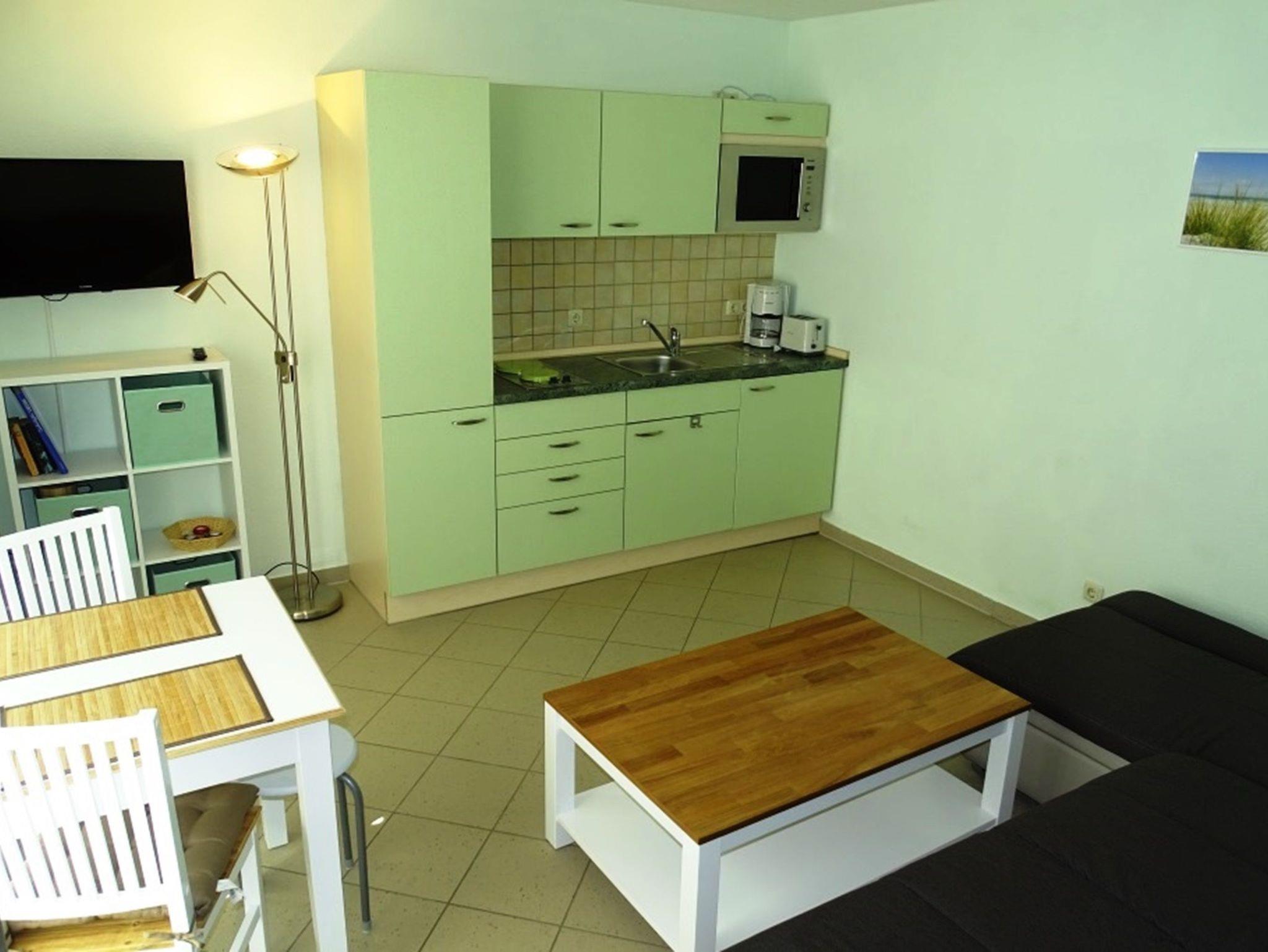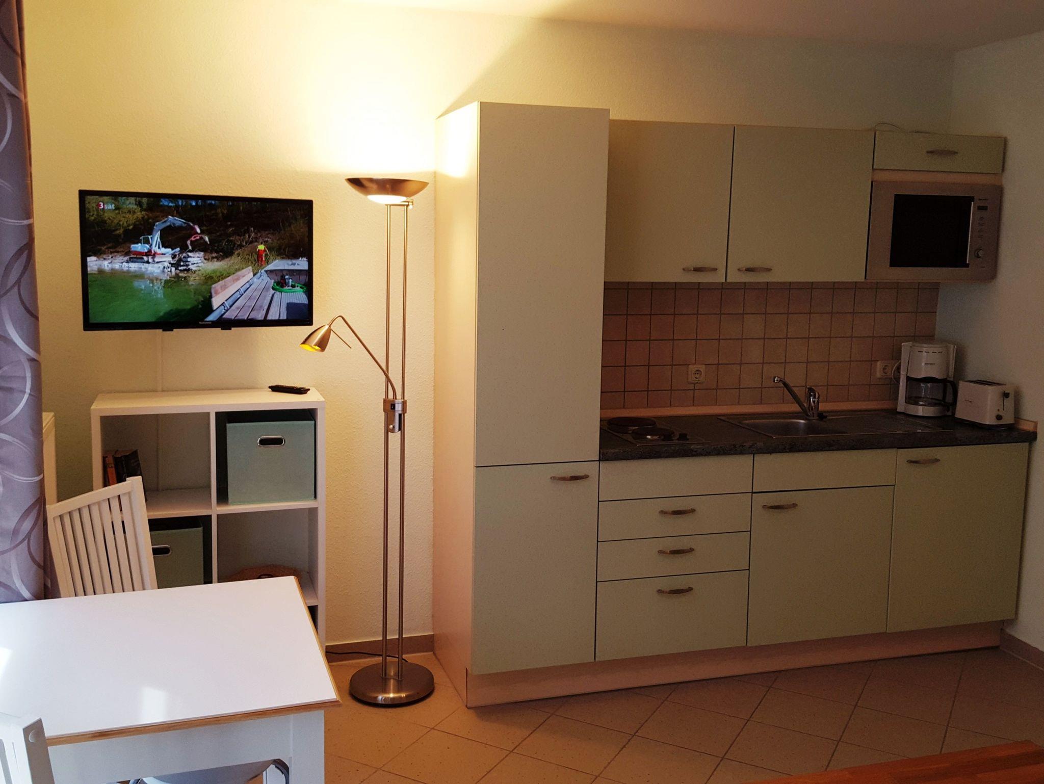 Die kleine Küchenzeile beinhaltet einen Kühlschrank mit Gefrierfach, ein zwei-Platten Kochfeld und eine Mikrowelle. Zur Ausstattung der Küche gehören selbstverständlich Kaffeemaschine, Toaster, Wasserkocher und Geschirr für bis zu 3 Personen dazu.