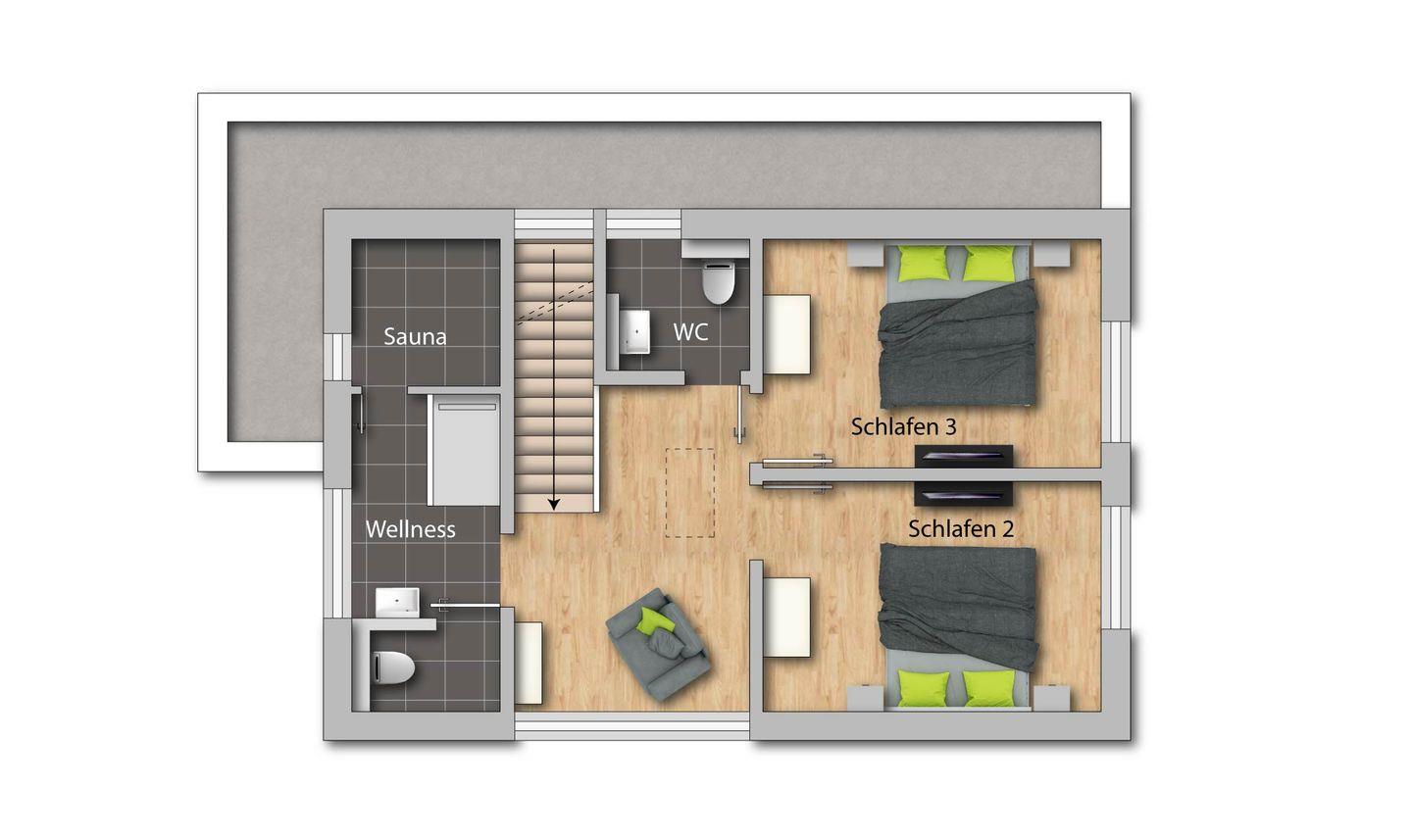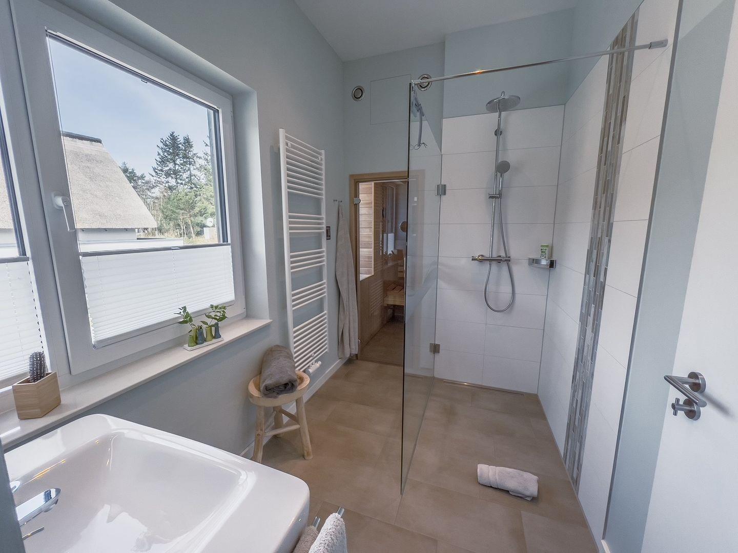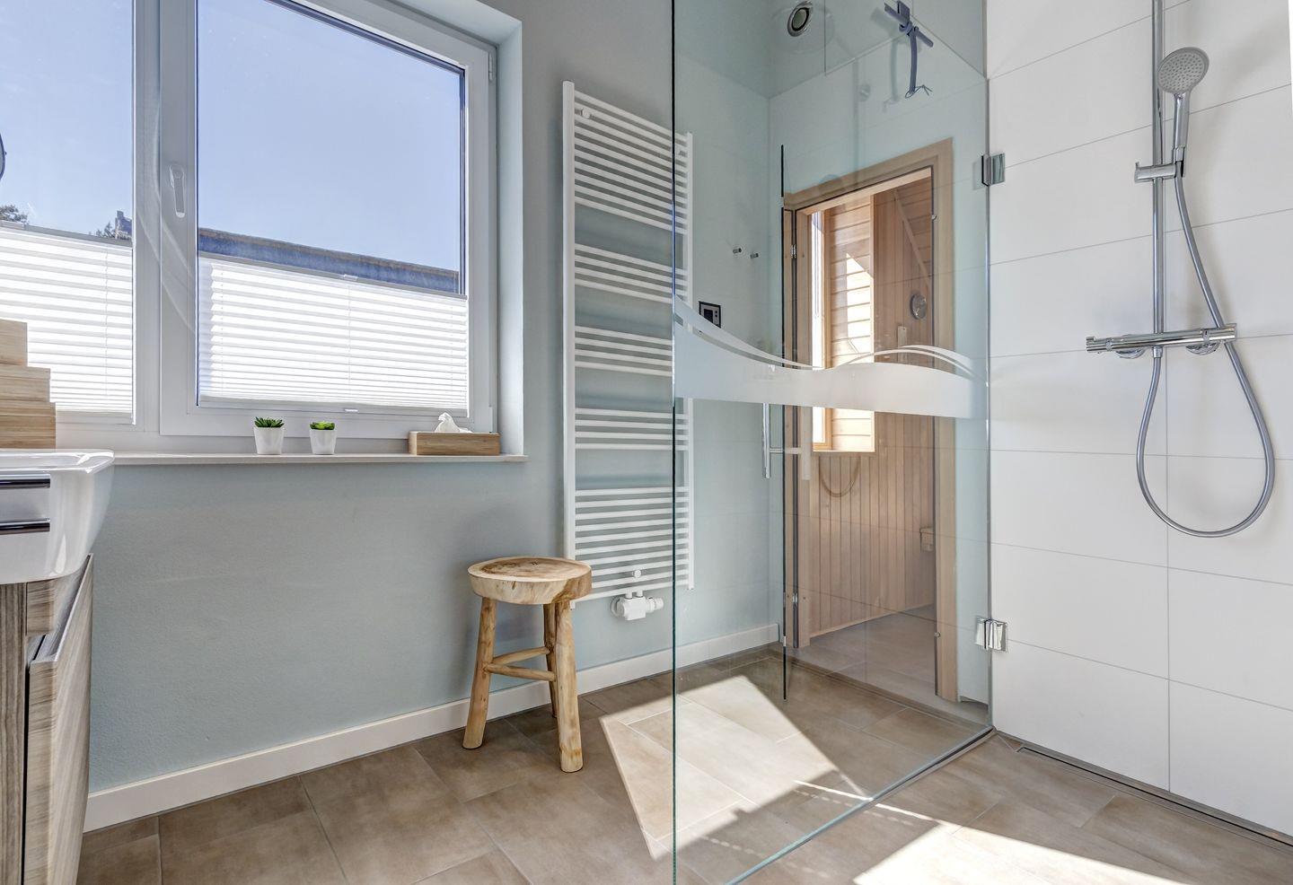 - Zwei exklusive Badezimmer mit Walk-In Regenschauerduschen, beleuchteten Wandspiegeln und Kosmetikspiegel, ausreichender Ablagefläche. Eines davon mit Sauna. Ein zusätzliches Gäste-WC ermöglicht auch sechs Personen genug Privatsphäre.