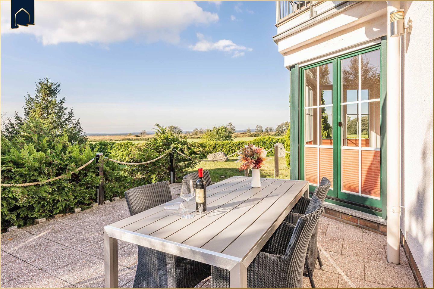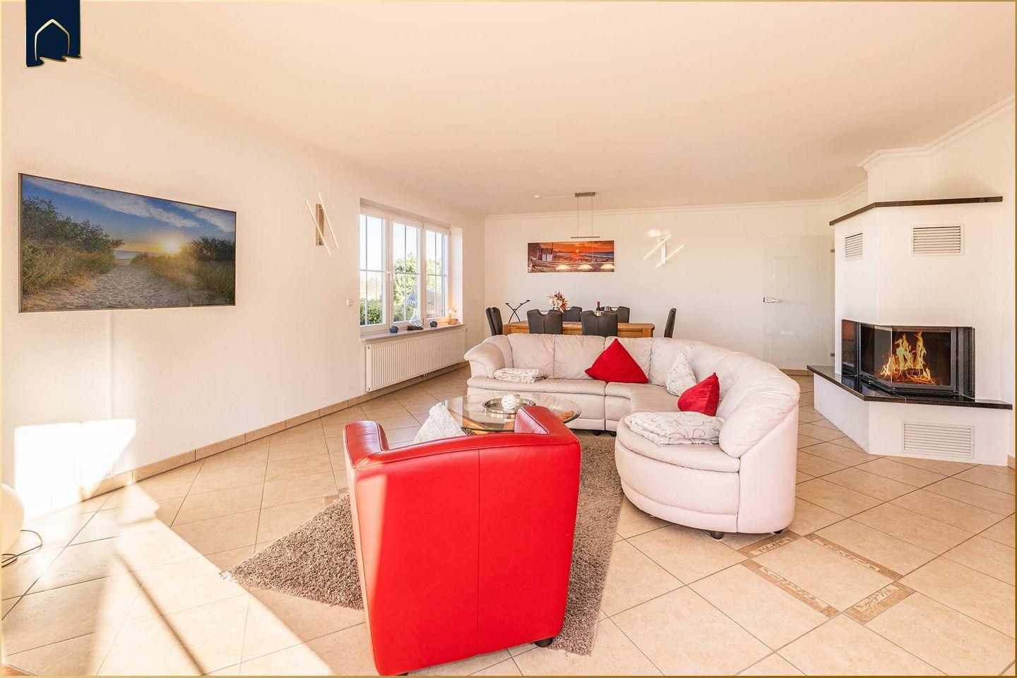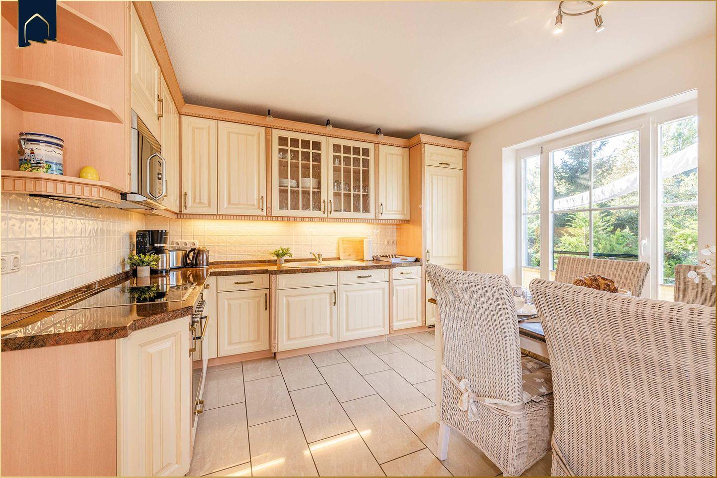 Die Ferienwohnung besticht durch ihr stilvolles Interieur mit viel Liebe zum Detail und einem herrlichen Blick auf das Achterwasser. Der offen gestaltete Wohn- und Essbereich überzeugt mit einem gemütlichen Kamin, einer komfortablen Sofa-Ecke sowie moderner Unterhaltungstechnik (2 große Kabel-TVs, WLAN, CD-Player, Radio). Die voll ausgestattete Küche im Landhausstil bietet alles, was Hobbyköche brauchen – vom Ceranherd über Backofen und Spülmaschine bis zur Kaffeemaschine und Mikrowelle.