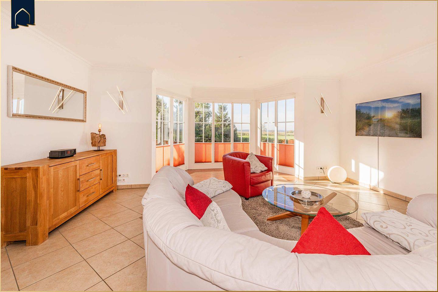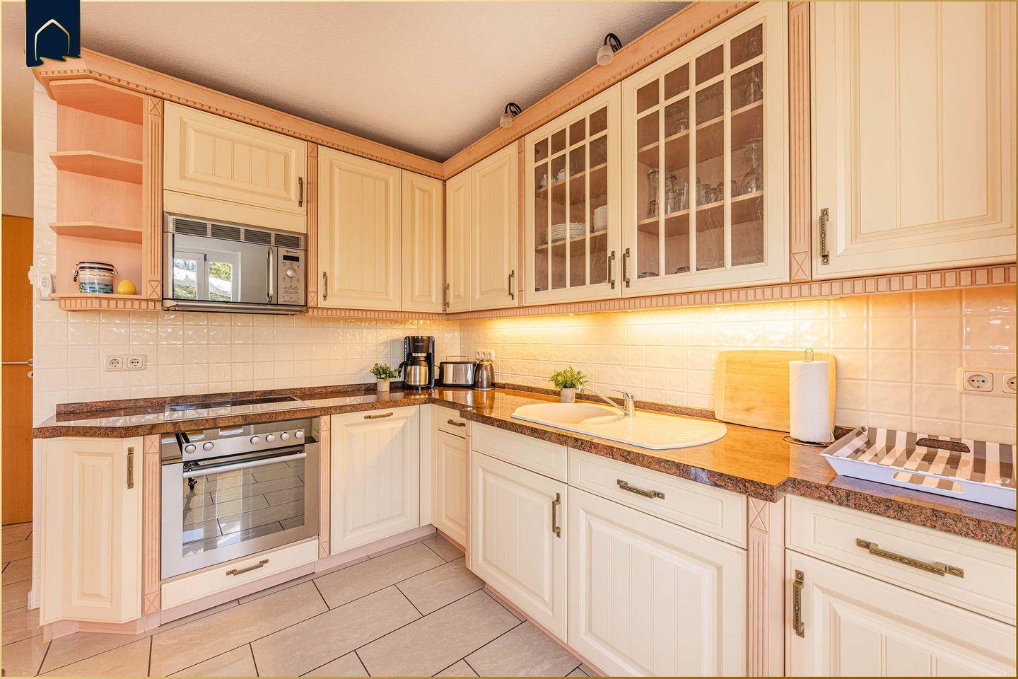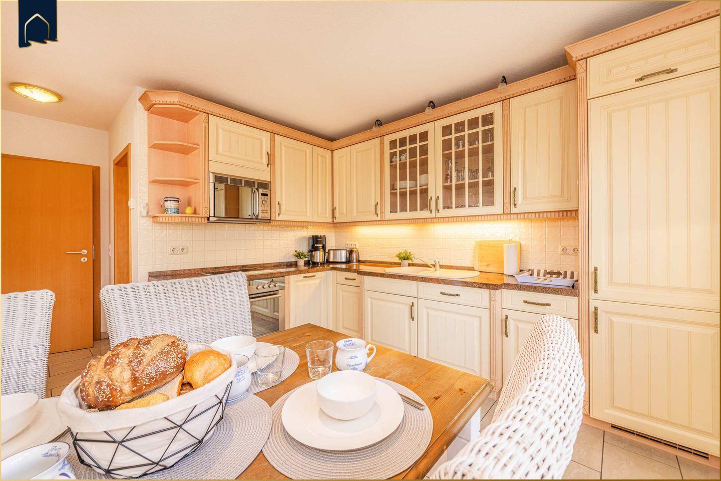 Die Ferienwohnung besticht durch ihr stilvolles Interieur mit viel Liebe zum Detail und einem herrlichen Blick auf das Achterwasser. Der offen gestaltete Wohn- und Essbereich überzeugt mit einem gemütlichen Kamin, einer komfortablen Sofa-Ecke sowie moderner Unterhaltungstechnik (2 große Kabel-TVs, WLAN, CD-Player, Radio). Die voll ausgestattete Küche im Landhausstil bietet alles, was Hobbyköche brauchen – vom Ceranherd über Backofen und Spülmaschine bis zur Kaffeemaschine und Mikrowelle.