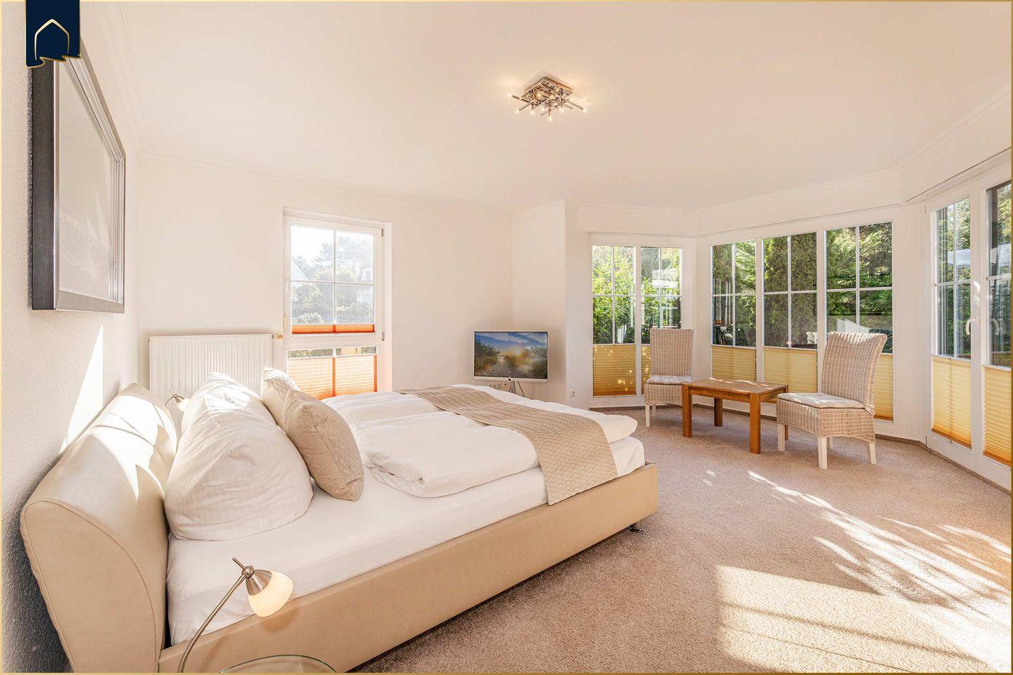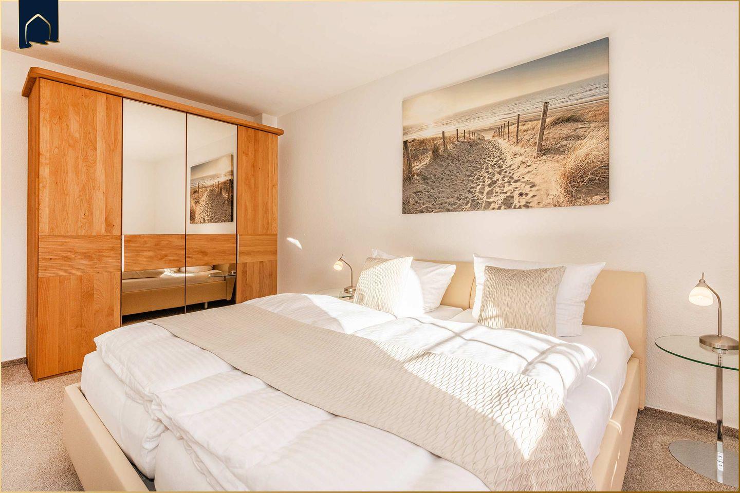 Zwei geschmackvoll eingerichtete Schlafzimmer mit Doppelbetten garantieren erholsamen Schlaf. Bei Bedarf bieten hochwertige Zustellbetten Platz für zwei weitere Personen. Das große Badezimmer verwöhnt mit Badewanne, separater Dusche und Fußbodenheizung. Zusätzlich steht ein separates Gäste-WC zur Verfügung. Für entspannte Wellness-Momente sorgt die Gemeinschaftssauna mit Panoramablick und Ruheraum – ideal nach langen Spaziergängen am Strand.