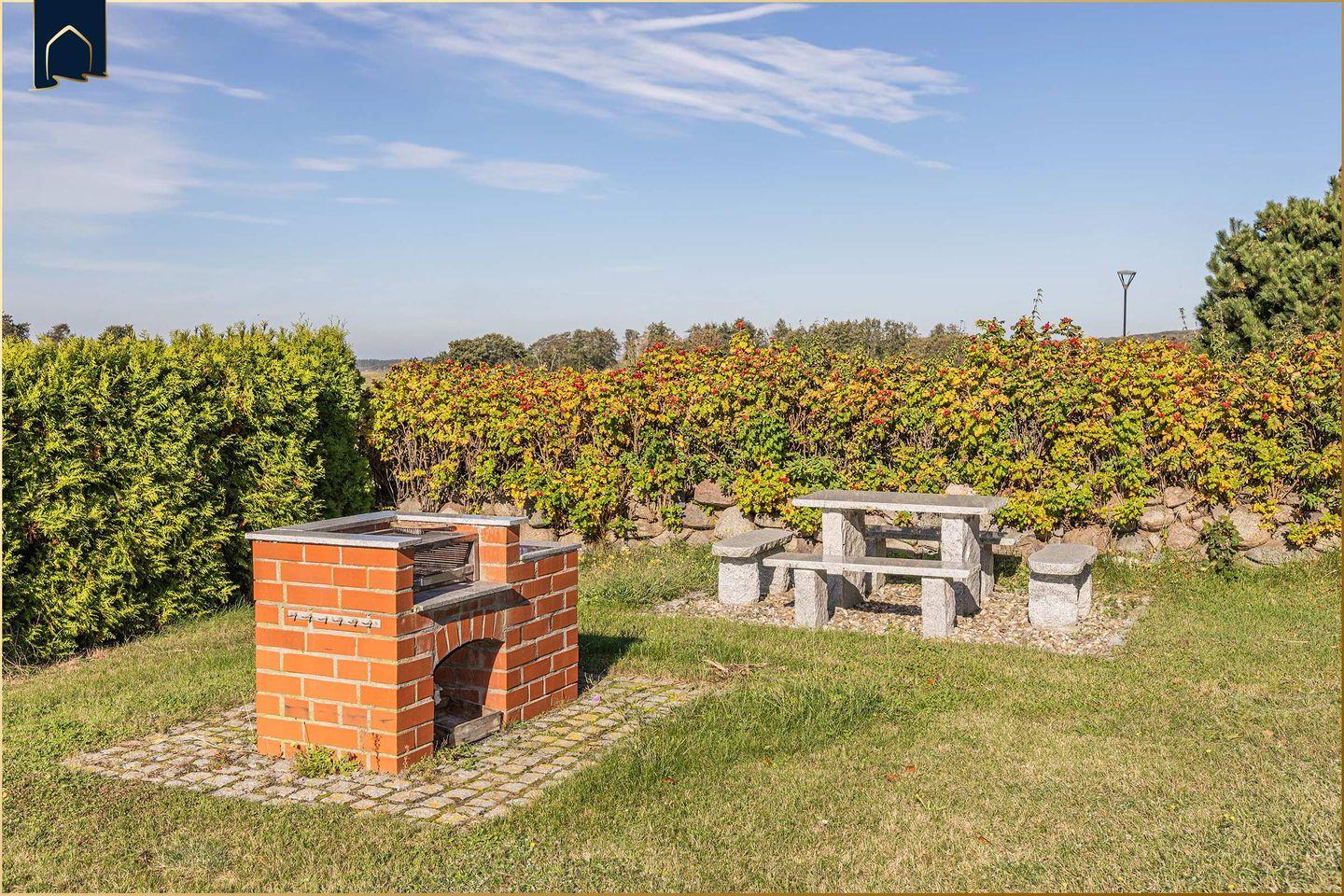 Besonders reizvoll ist die große Gartenterrasse mit Strandkorb, Grillplatz und Blick ins Grüne – der perfekte Ort für sommerliche Abende und gemütliche Stunden. Nur wenige Fahrminuten trennen Sie vom feinsandigen Ostseestrand oder den malerischen Ufern des Achterwassers. In der direkten Umgebung verlaufen zahlreiche Rad- und Wanderwege durch den Naturpark Usedom – ideal für Aktivurlauber und Naturliebhaber. Einkaufsmöglichkeiten, Restaurants und öffentliche Verkehrsmittel sind in kurzer Entfernung erreichbar. Ein weiteres Extra: Der kostenfreie Shuttle innerhalb der Bernsteinbäder bringt Sie bequem zu Sehenswürdigkeiten, Einkaufsmöglichkeiten oder zum nächsten Strandzugang. Für Kinder ist das nahe gelegene Karls Erlebnis-Dorf ein echtes Highlight. Auch für Hundebesitzer ist die Umgebung ideal: Spazierwege starten direkt vor der Tür.