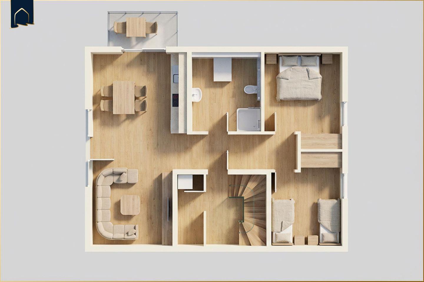Im Inneren erwartet Sie ein stilvoll eingerichtetes Zuhause mit zwei gemütlichen Schlafzimmern, einem modernen Badezimmer mit Dusche sowie einem hellen Wohn- und Essbereich. Die Fußbodenheizung sorgt für angenehme Wärme, und große Fenster lassen viel Tageslicht herein. Der Zugang zur möblierten Terrasse mit Gartenlaube bietet zusätzlich Privatsphäre und Erholung im Grünen.