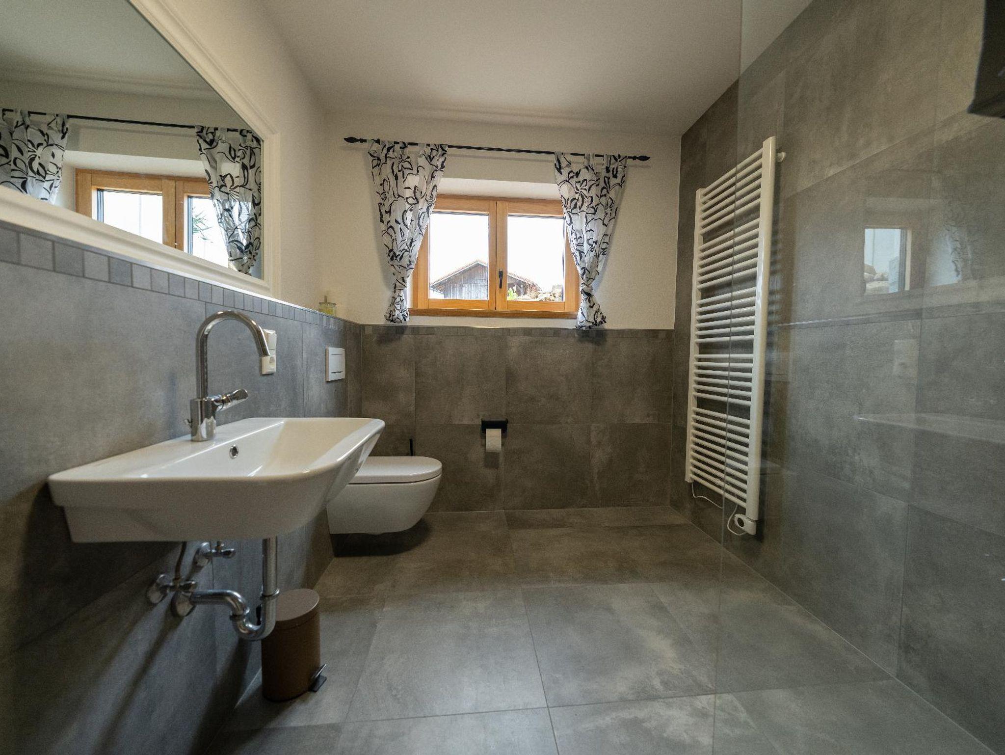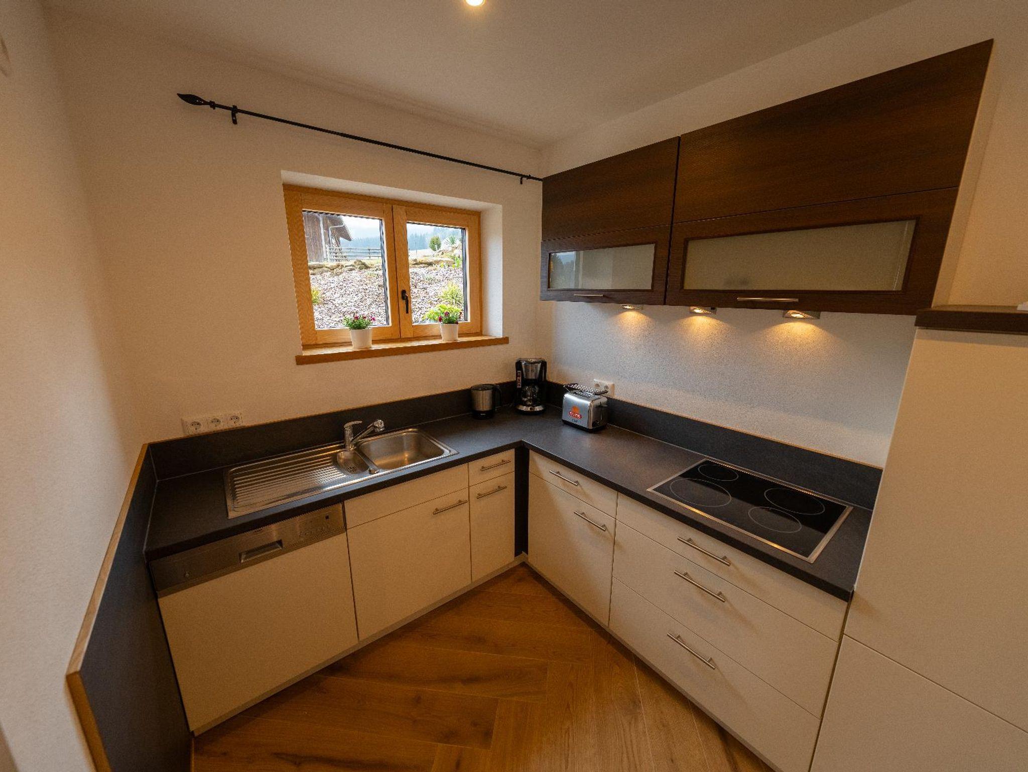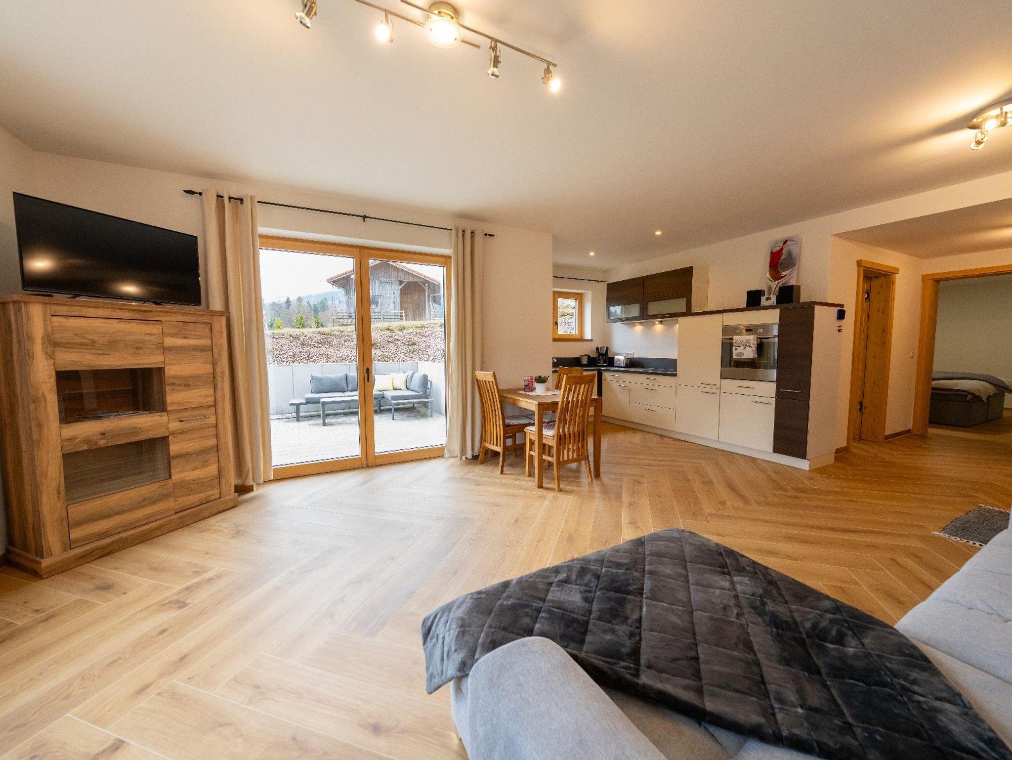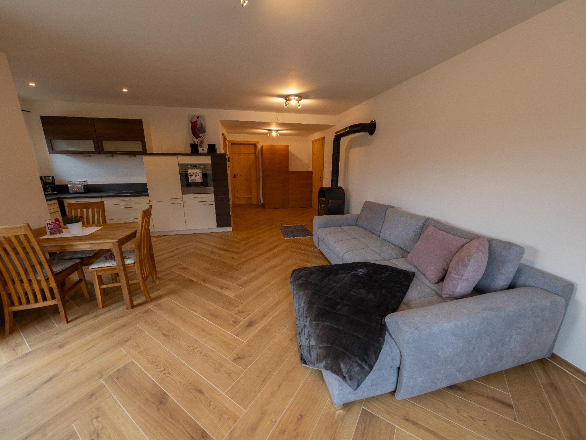 Die Ferienwohnung liegt im Erdgeschoss und bietet auf 65 Quadratmetern Platz für bis zu 3 Personen. Sie verfügt über einen offenen Wohn- und Essbereich, ein Badezimmer sowie ein separates Schlafzimmer. Im großzügigen Wohnraum befindet sich ein Kaminofen und eine Couch, die als Schlafcouch genutzt werden kann, ein Sat-TV sowie ein Essbereich. Die anschließende, offene Küche ist mit Spülmaschine, Kühl- und Gefrierschrank, Backofen, Herd, Toaster, Kaffeemaschine und Wasserkocher voll ausgestattet. Das Tageslichtbad verfügt über eine ebenerdige Regendusche, Waschbecken, WC und Handtuchtrockner. Das separate Schlafzimmer umfasst ein gemütliches Bockspringbett. Zur Ferienwohnung gehört eine eigene Terrasse, auf der Sie entspannen und den Ausblick genießen können, sowie ein PKW-Stellplatz. Außerdem kann ein Fitnessraum mit separater Dusche genutzt werden. Bettwäsche und Handtücher sowie WLAN stehen kostenfrei zur Verfügung.
