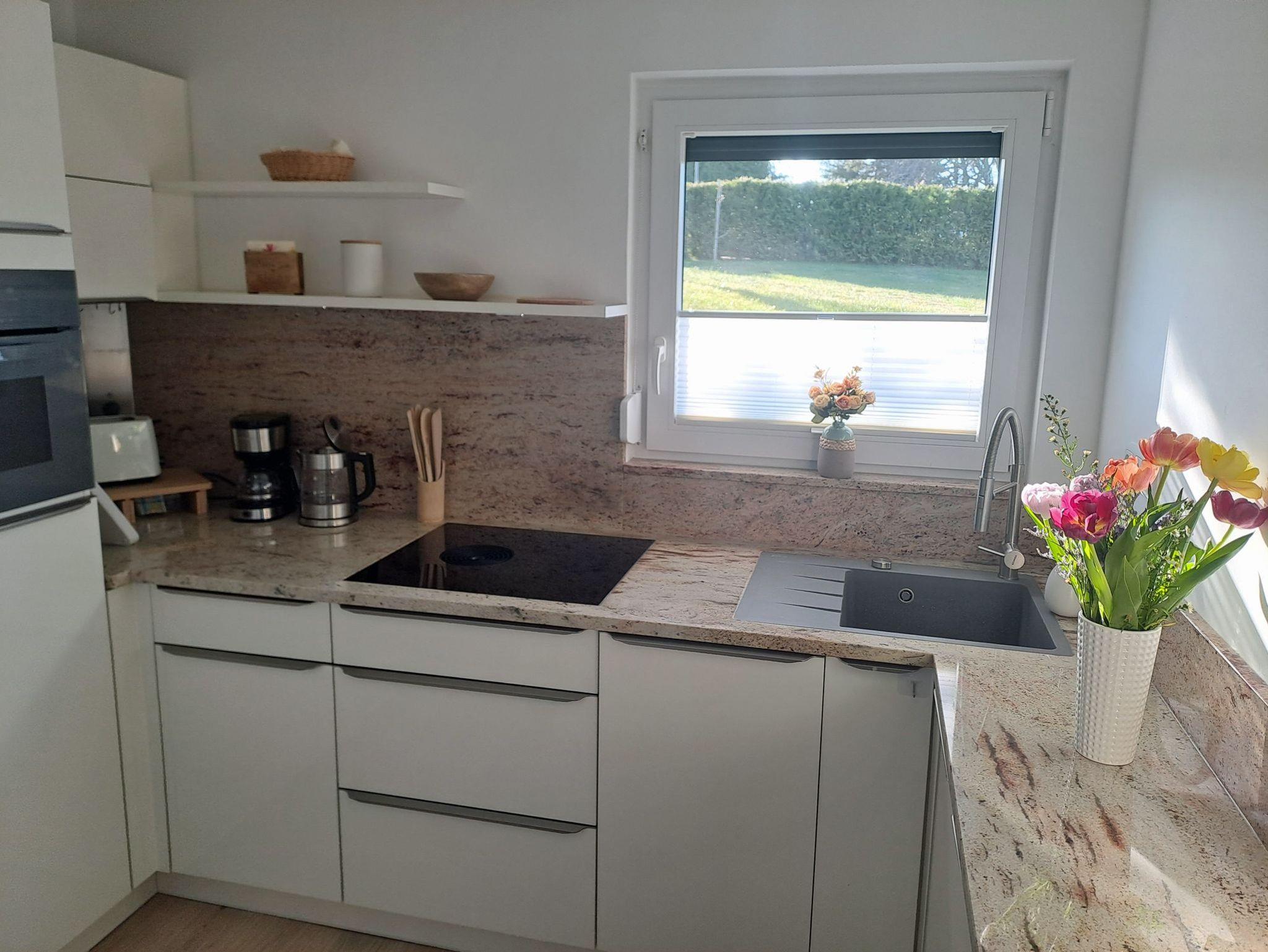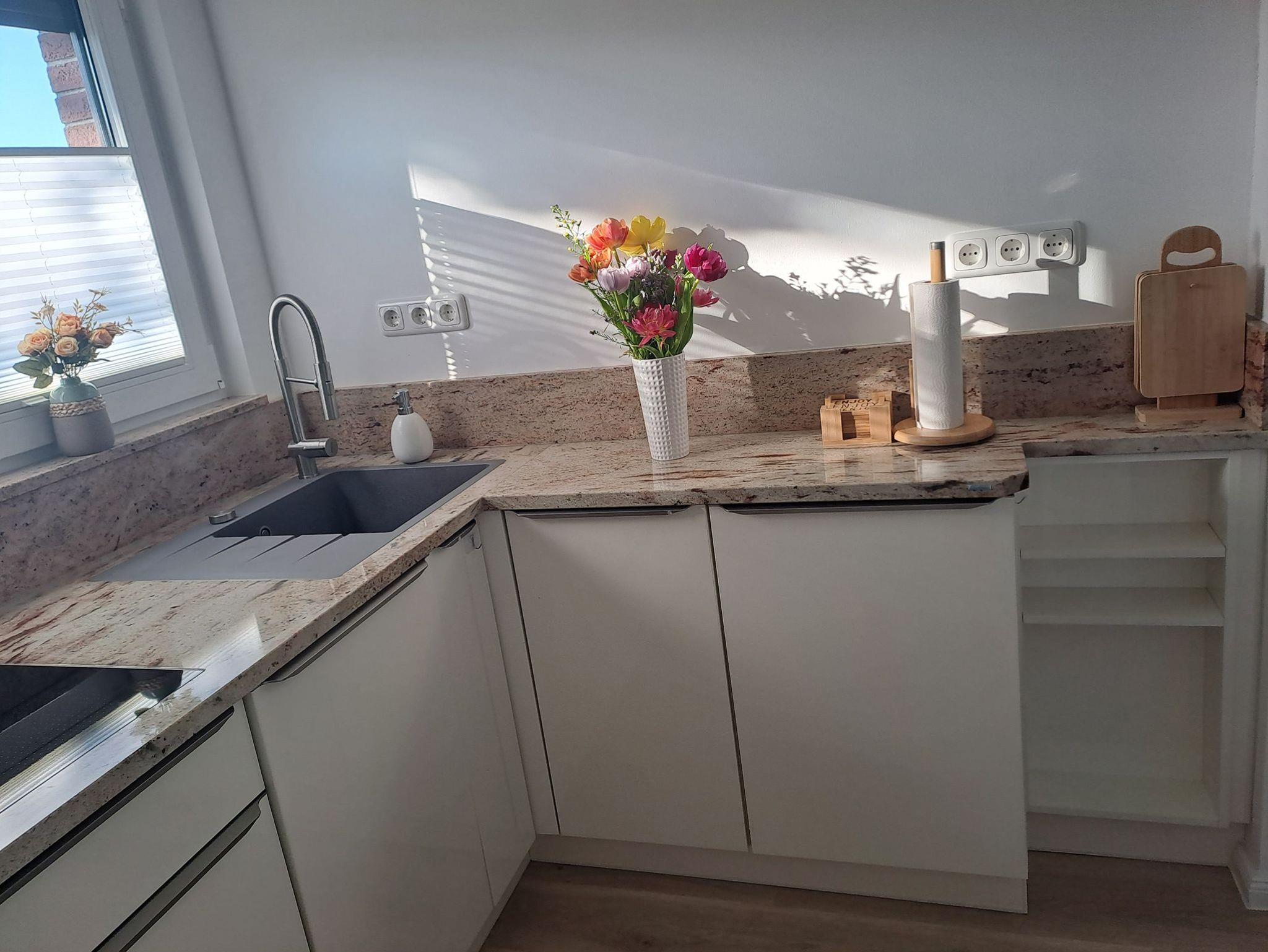 • Die separate Küche ist hochwertig mit Induktionsherd, Kühlschrank, großem Tiefkühlschrank, Miele-Geschirrspüler, Mini-Backofen mit integrieter Mikrowelle und verfügt über diverse Küchenutensilien.