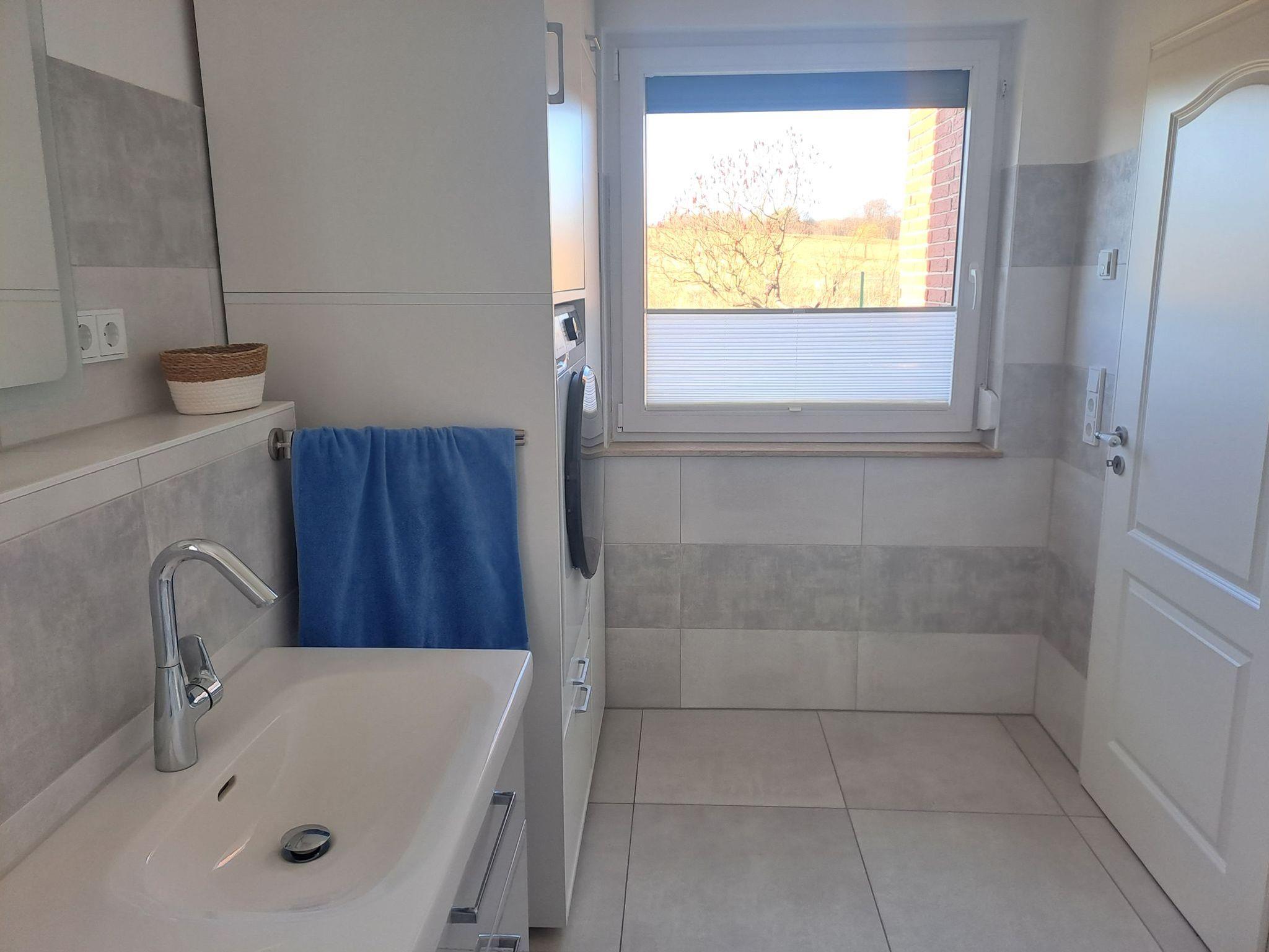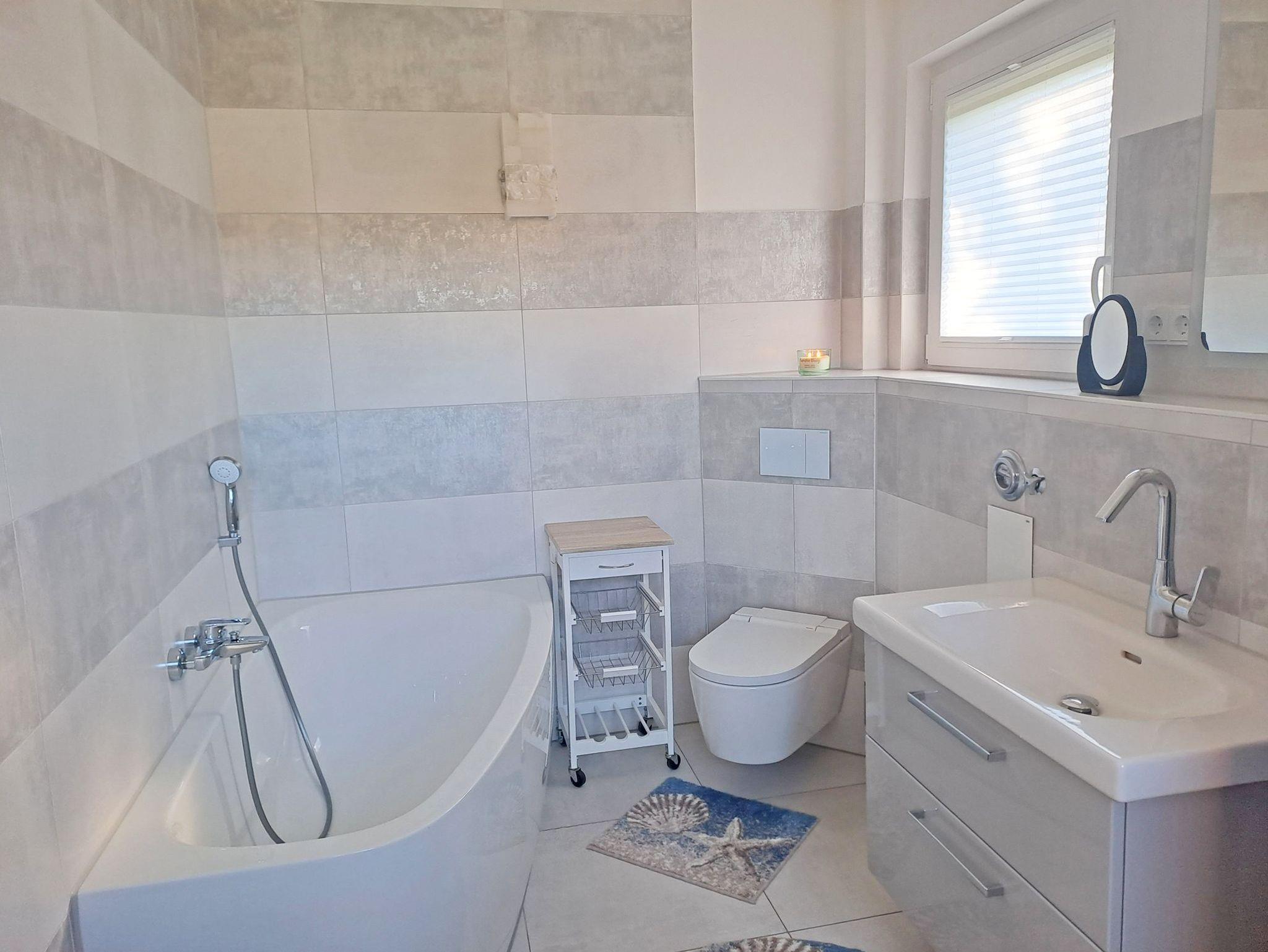 • Das Tageslichtbad bietet eine Badewanne mit Duschmöglichkeit, Waschtisch, Toilette, Waschtrockner und Fön.