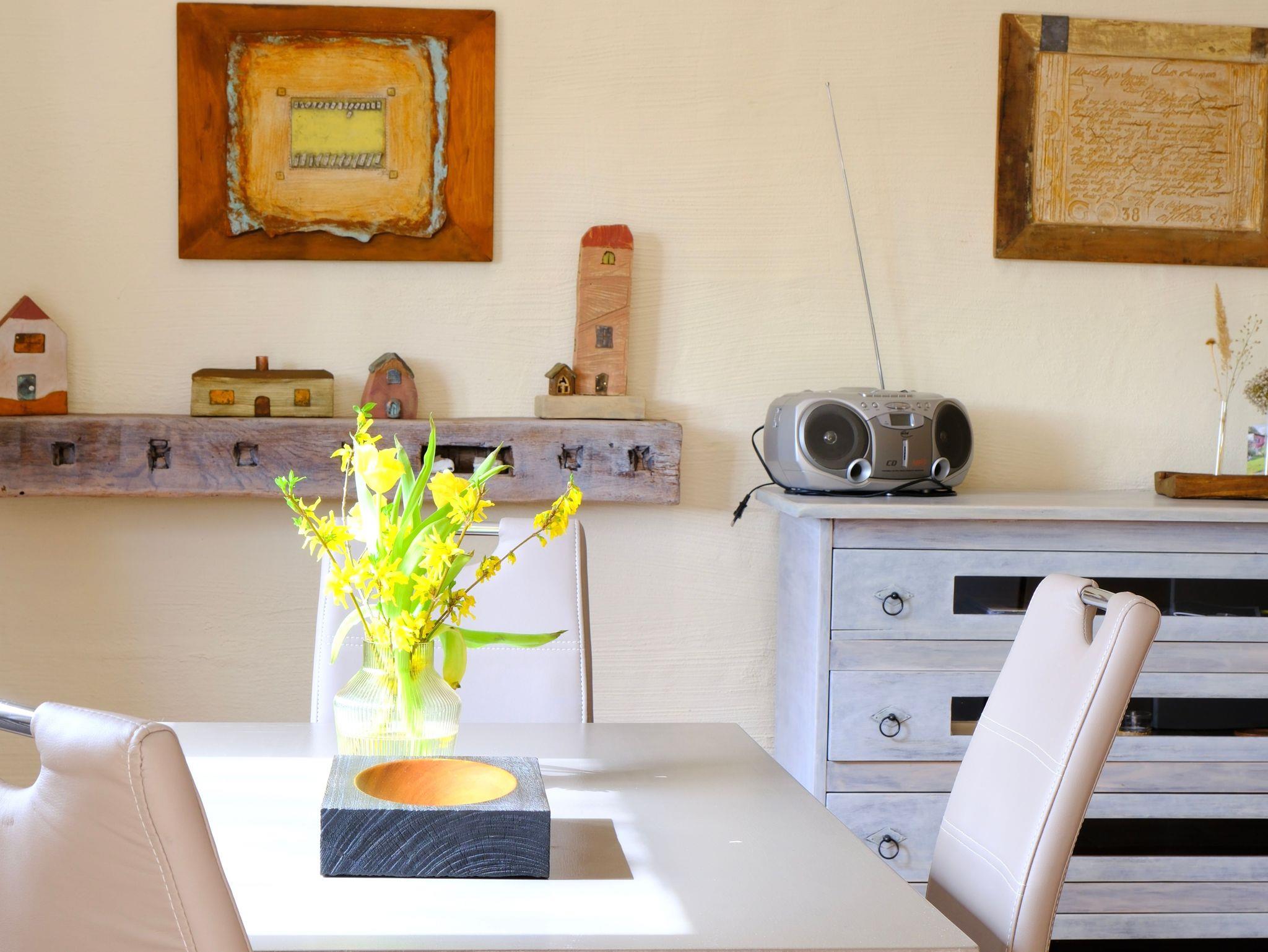 Zu jeder Wohnung gehört eine Außenterrasse mit Gartenmöbeln, Sonnenschirm und Grillmöglichkeit. Darüber hinaus finden Sie bei uns einen großen Natur- und Nutzgarten, in dem Sie neben vielfältig angelegten Beeten auch noch Wegrandblumen und Heilpflanzen sowie verschiedene Ruhezonen mit Sitzgruppen und Liegen zum Entspannen finden. Manchmal ganz offensichtlich, bisweilen recht versteckt können Sie im Garten Kunstobjekte des Hausherren entdecken und bei Gefallen käuflich erwerben.