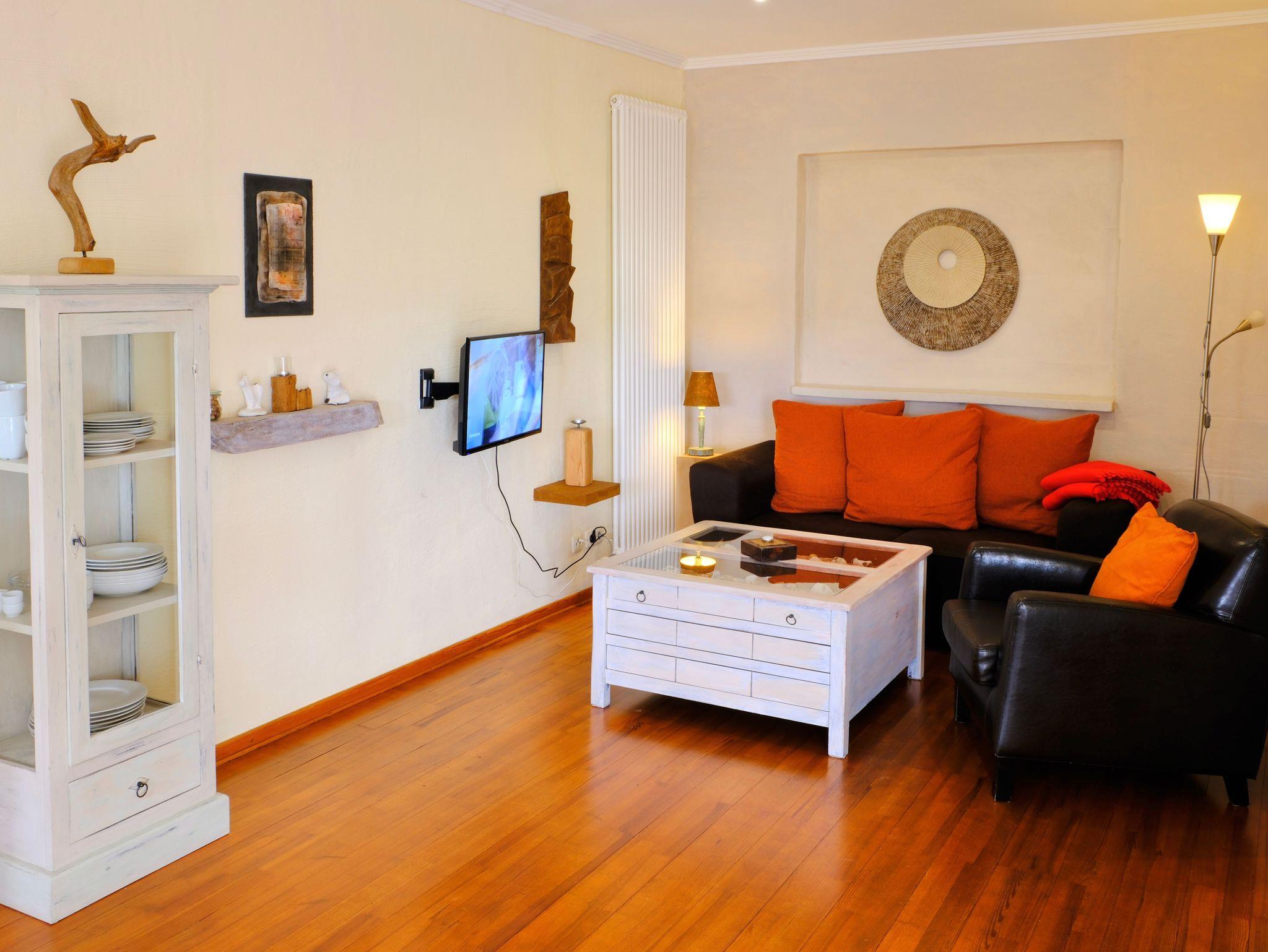 Wohnbereich mit gemütlicher Couch und Sessel, Fernseher (SAT-TV/Radio), CD-Player, vom Wohnzimmer durch Leichtbauwand getrennter Schlafbereich mit Doppelbett (2 x 0,90 m x 2 m), Kleiderschrank, Spiegel, Essecke, komplett ausgestattete Küchenzeile mit 2-Platten-Kochfeld, Mikrowelle mit Grill- und Heißluftfunktion, Geschirrspülmaschine und Kühlschrank mit Eisfach, geräumiges Bad mit großer Dusche, WC, Heizung, Haartrockner und Kosmetikspiegel, Südost-Terrasse mit modernem Mobiliar