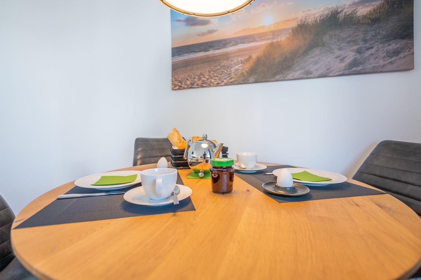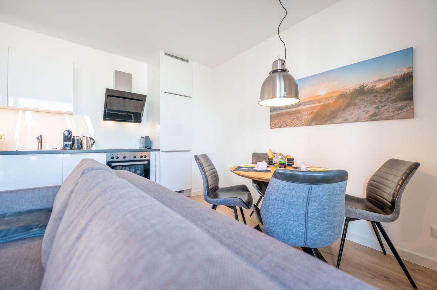 Im modern ausgestatteten, lichtdurchfluteten Wohn-/Esszimmer erwarten Sie eine gemütliche Sitzecke mit einem Samsung Flat-TV (59 Zoll) und ein optisch getrennter Essbereich.