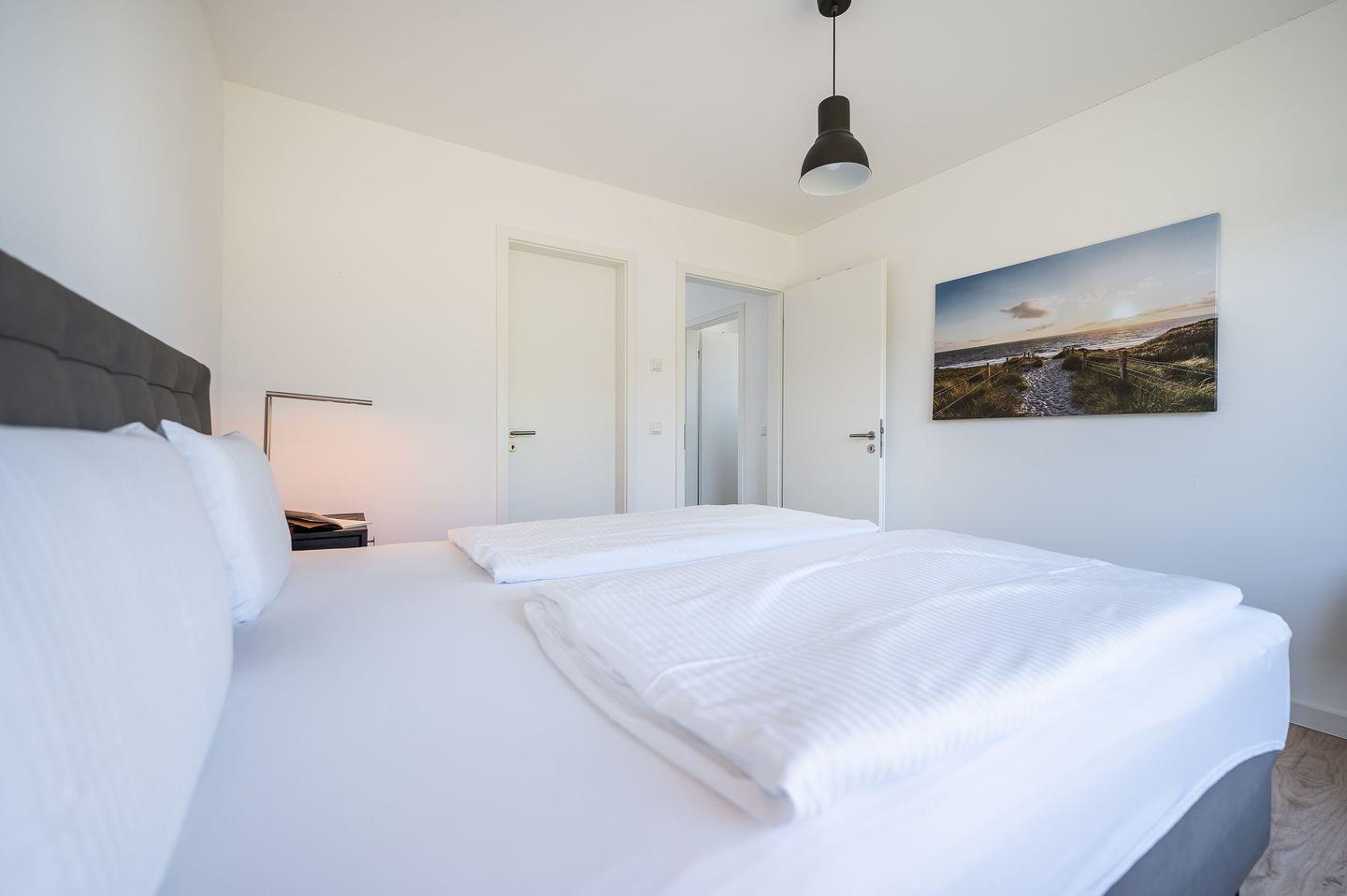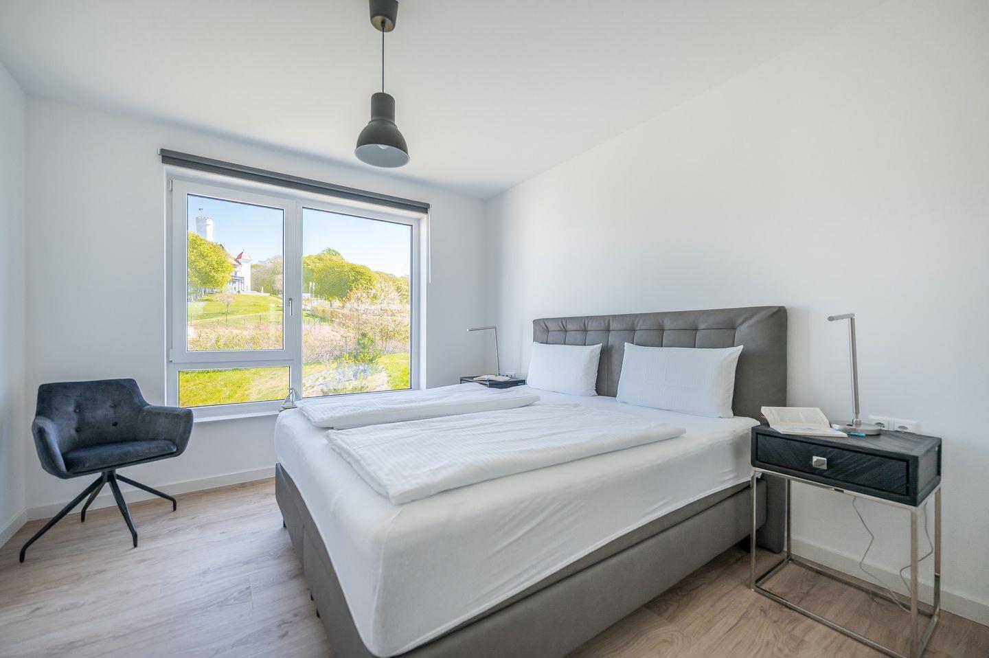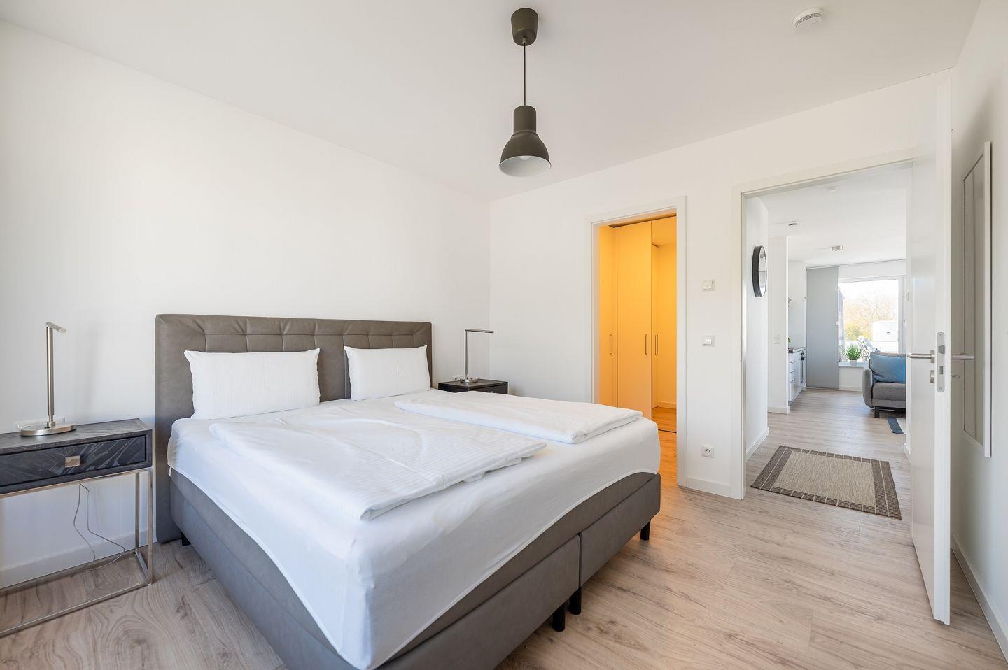 Die Wohnfläche von ca. 67 qm ist ideal genutzt. Hier kann man sich zuhause im Urlaub fühlen. Da wir wissen, wie wichtig guter Schlaf für einen perfekten Urlaub ist, finden Sie in dem gemütlichen Schlafzimmern ein hochwertiges Boxspringbett, so dass jeder Tag mit positiver Energie für die Erkundung der schönen Insel Rügen beginnen kann. Der vom Schlafzimmer aus begehbare Ankleidebereich ist definitiv ein zusätzliches Highlight und bietet ausreichend Platz für Ihre Urlaubs-Garderobe.