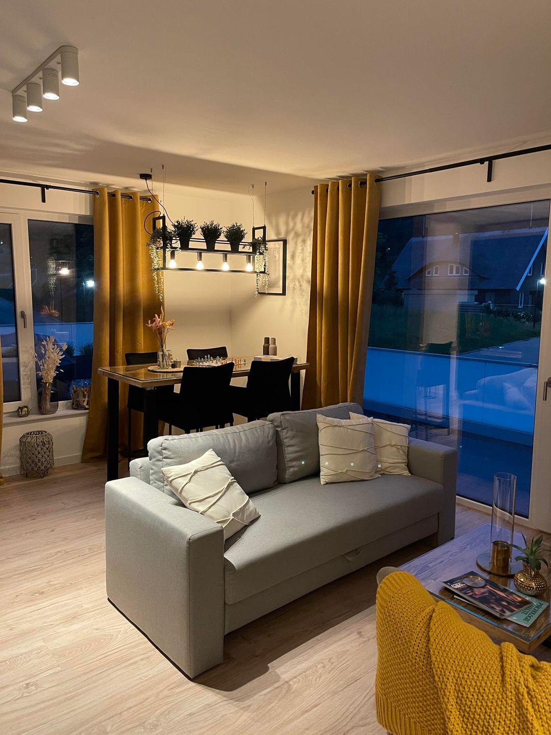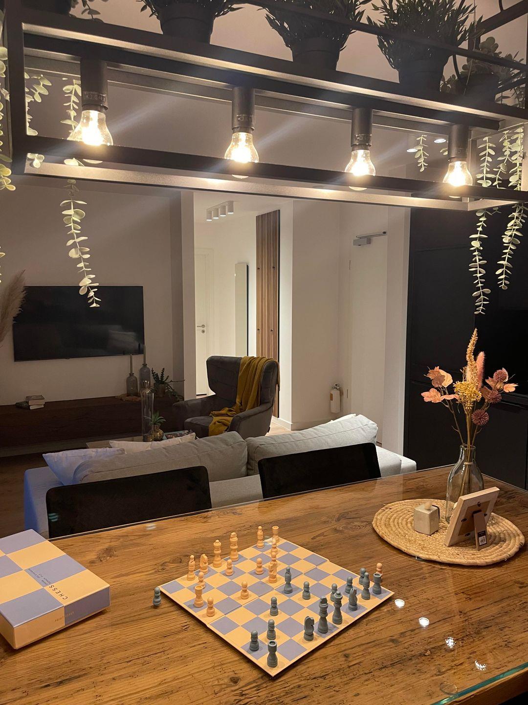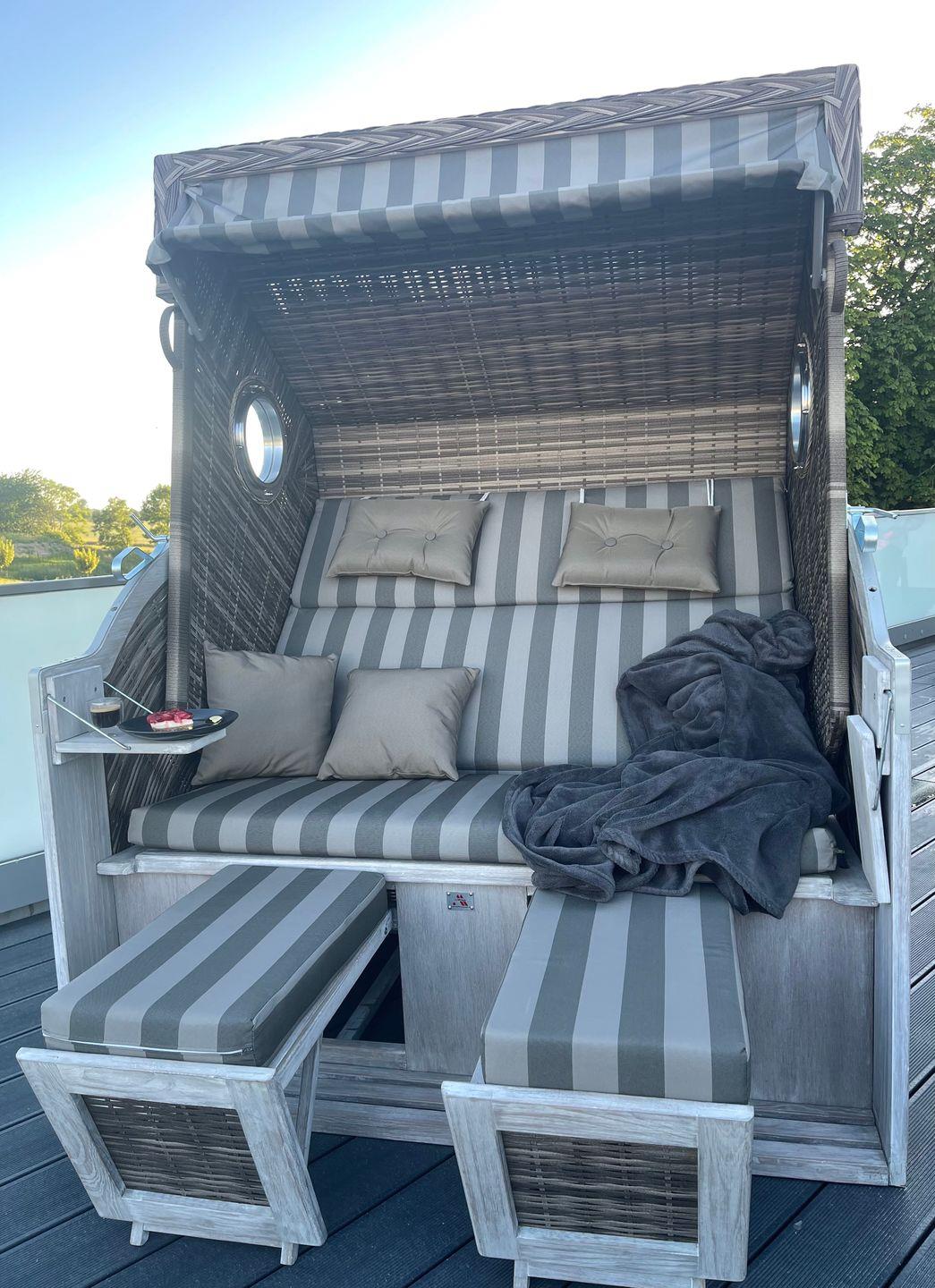 Der offene Wohn- und Essbereich ist lichtdurchflutet und stilvoll eingerichtet – perfekt für entspannte Stunden. Die bodentiefen Fenster führen dich direkt auf die 45?m² große Dachterrasse mit Sitzmöbeln und Strandkorb. Die offene Küche ist komplett ausgestattet und ideal für gesellige Kochabende.
