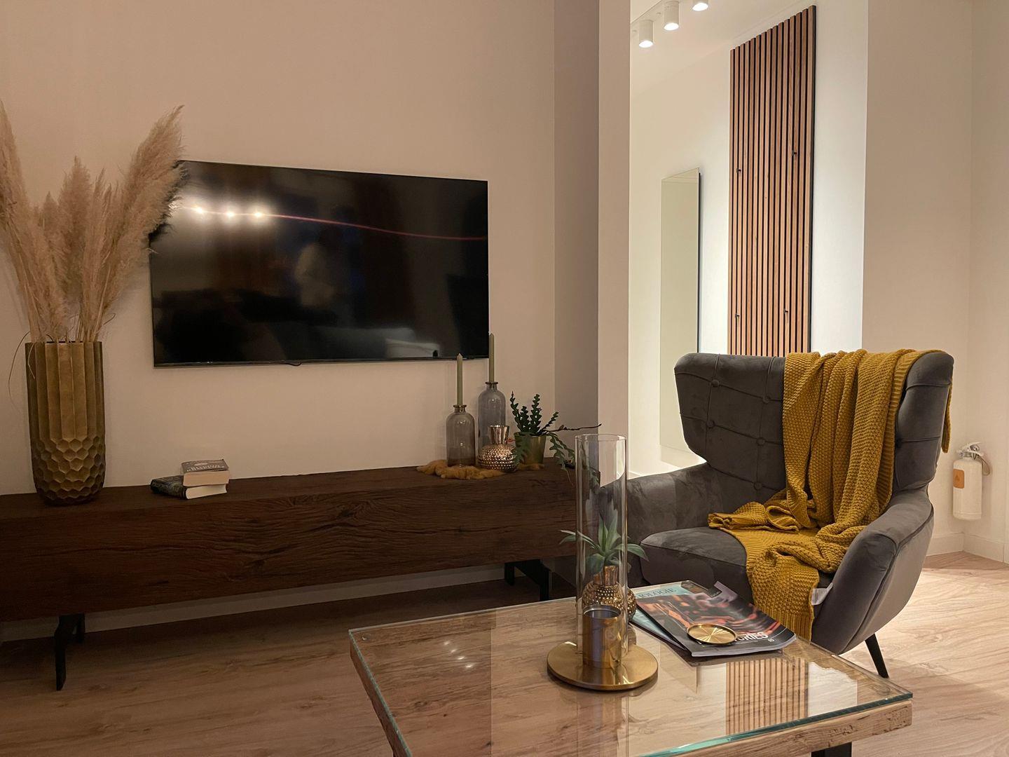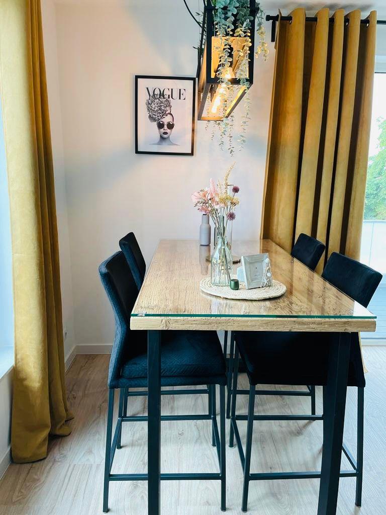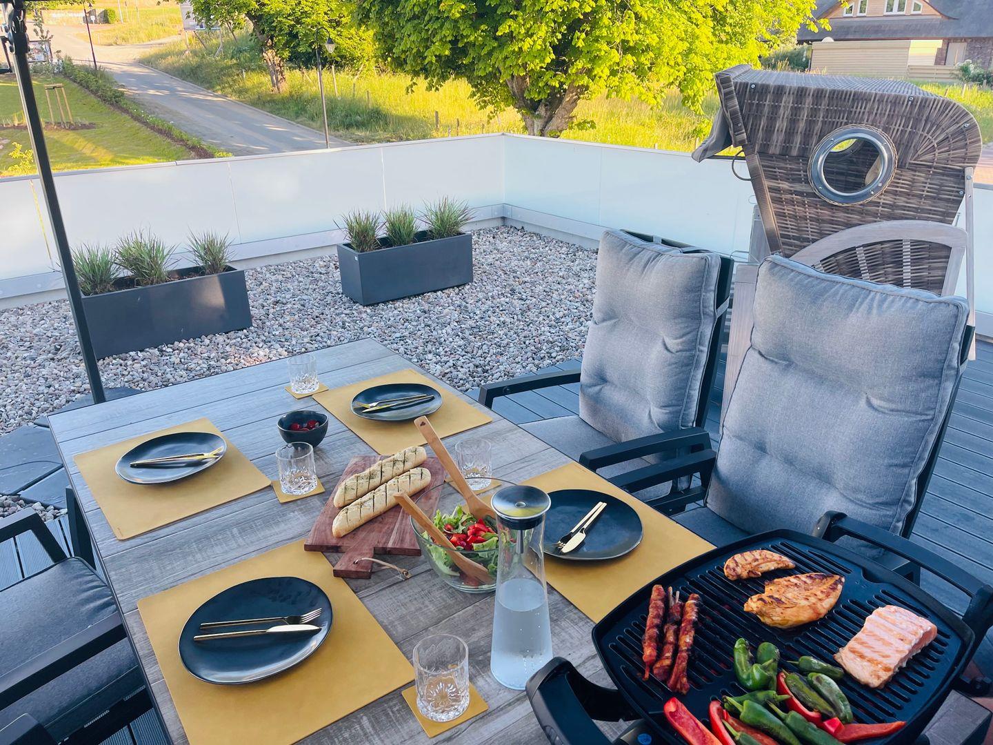 Der offene Wohn- und Essbereich ist lichtdurchflutet und stilvoll eingerichtet – perfekt für entspannte Stunden. Die bodentiefen Fenster führen dich direkt auf die 45?m² große Dachterrasse mit Sitzmöbeln und Strandkorb. Die offene Küche ist komplett ausgestattet und ideal für gesellige Kochabende.