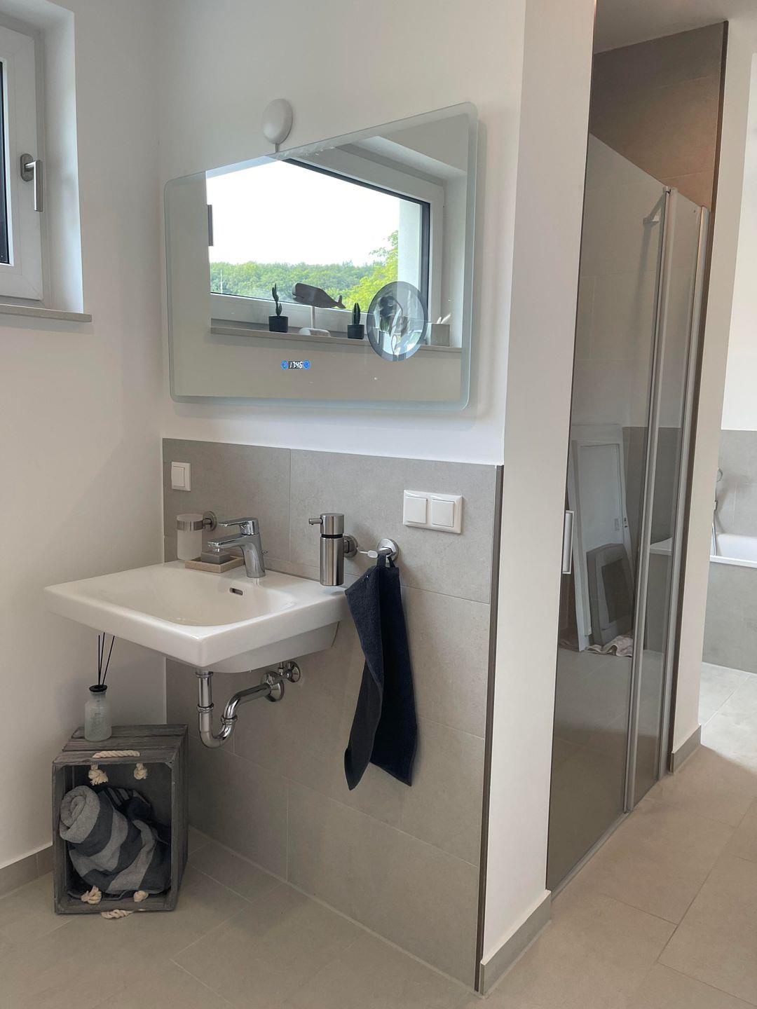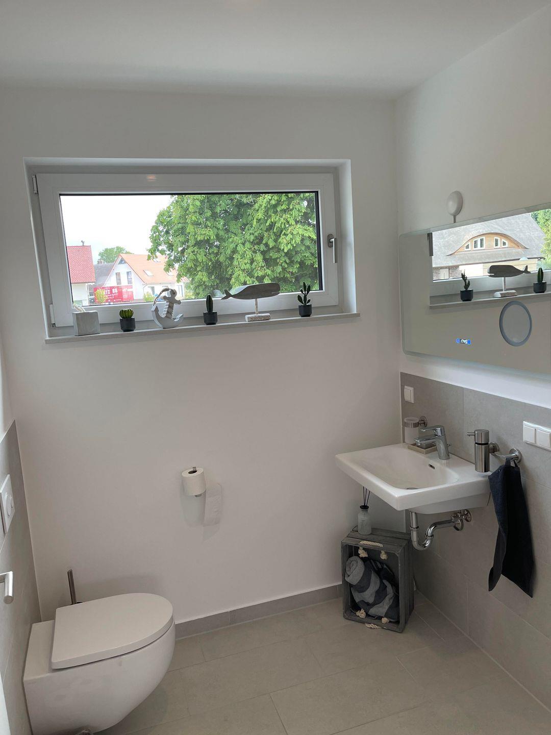 Im großzügigen Bad erwarten dich eine bodengleiche Dusche und eine komfortable Badewanne. Föhn, Kosmetikspiegel und viel Tageslicht sorgen für ein entspanntes Spa-Gefühl – ideal nach einem Ausflug entlang der Steilküste.