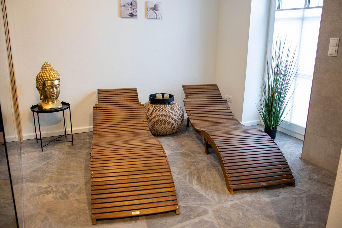 Im Souterrain findet ihr euren privaten Wellnessbereich. Euch erwartet eine großzügige Saunasuite, eine Dusche und Liegen zum Ausruhen. Der Lichthof mit großer Glasfront bringt Tageslicht in den Raum. Nach einem aktiven Tag in der Natur entspannt ihr hier in ruhiger Umgebung. Ein weiteres Badezimmer mit bodengleicher Dusche befindet sich im Obergeschoss.