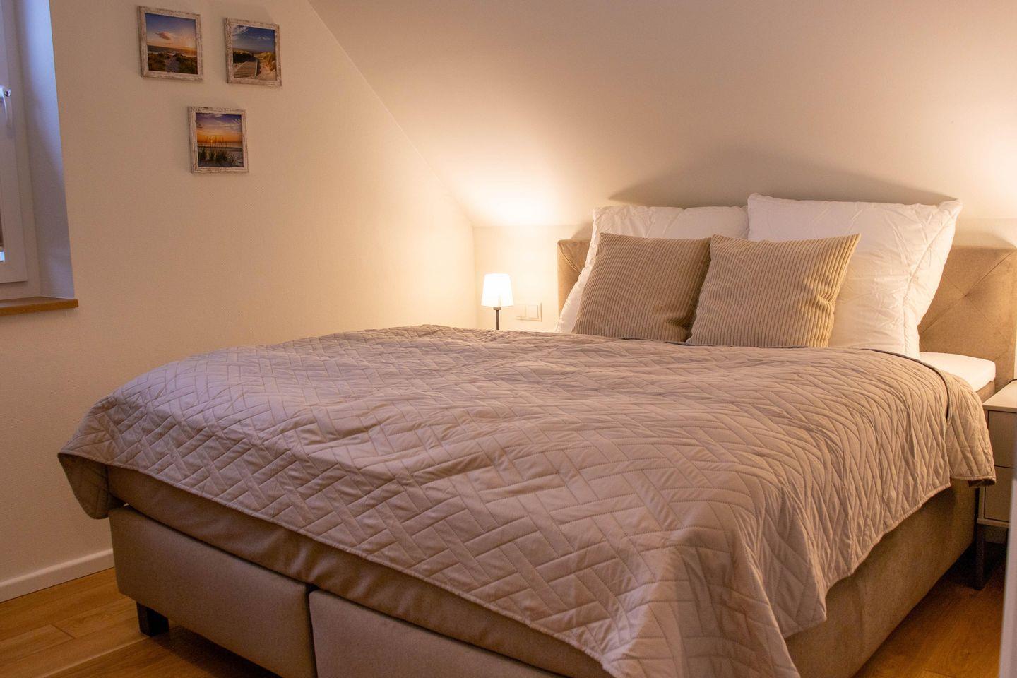 Drei Schlafzimmer mit komfortablen Boxspringbetten sorgen für erholsame Nächte. Zwei Zimmer liegen im Obergeschoss, ein weiteres im Souterrain. Alle Schlafzimmer sind mit TV ausgestattet. Verdunkelungsplissees unterstützen eure Nachtruhe.