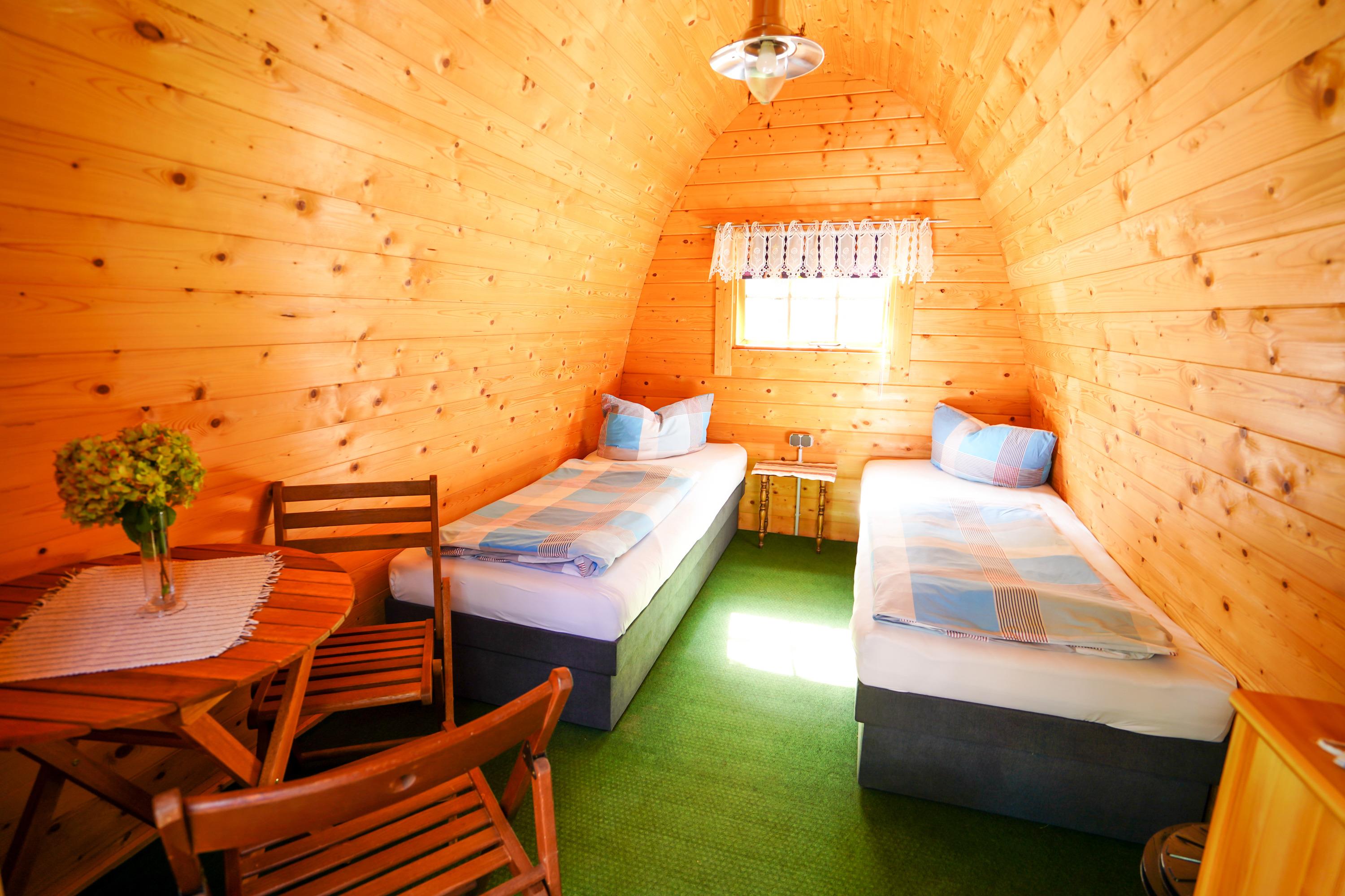 Zwei bequeme Betten reichen um den müden Körper auszuruhen. Kaffee und Brötchen zum Frühstück gibt es morgens an der Rezeption . Abends kann man den kleinen Grillplatz vor dem Häuschen nutzen. Ein Wasserkocher und etwas Geschirr gehören zur Ausstattung. Bettwäsche ist inklusive. Die Sanitärhäuser sind nur einige Schritte entfernt.