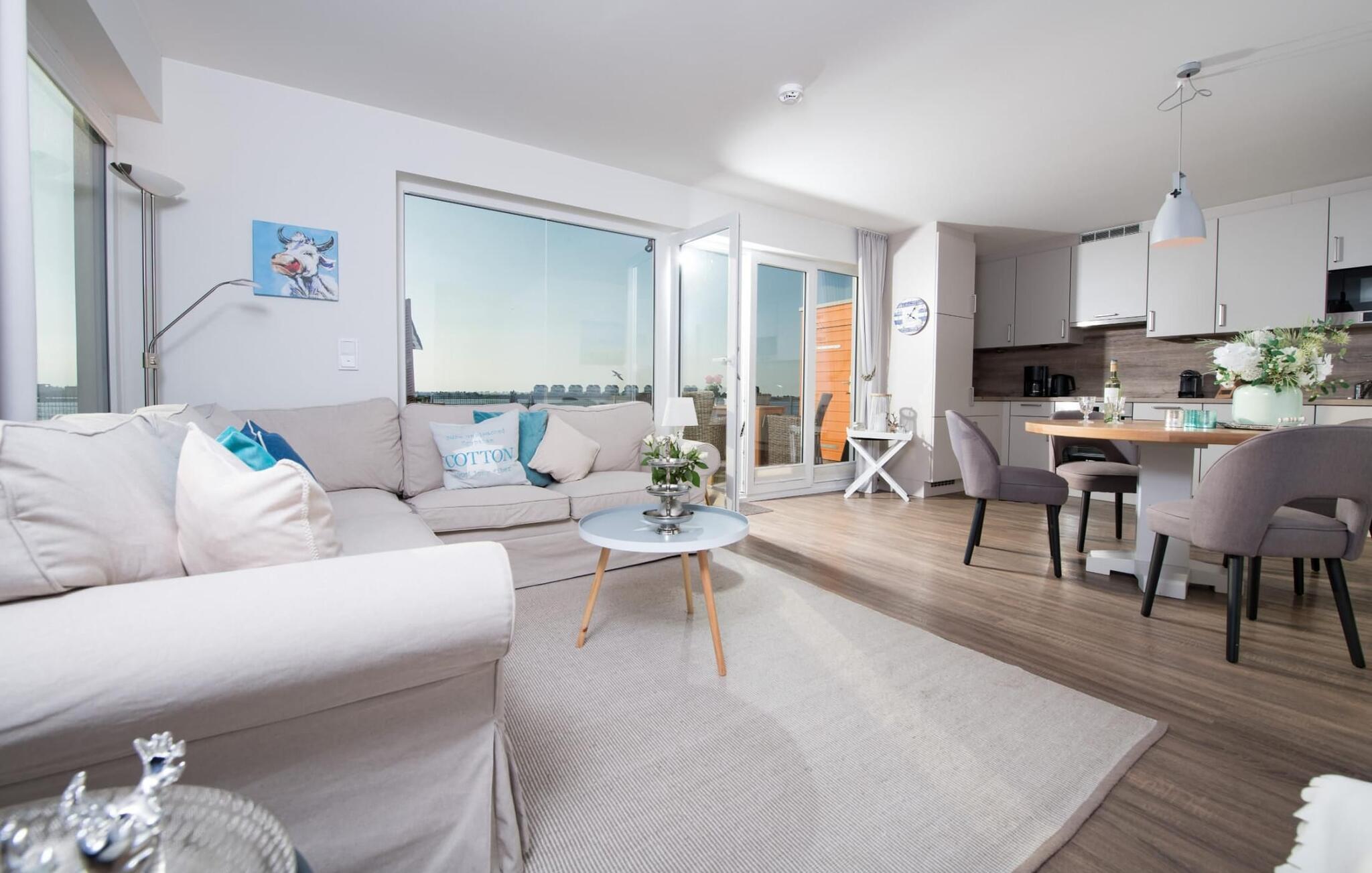 Lichtdurchflutet mit bodentiefer Fensterfront gestaltet sich der einladende Wohn- und Essbereich des Ferienobjekts mit traumhaften Wasserblick und
