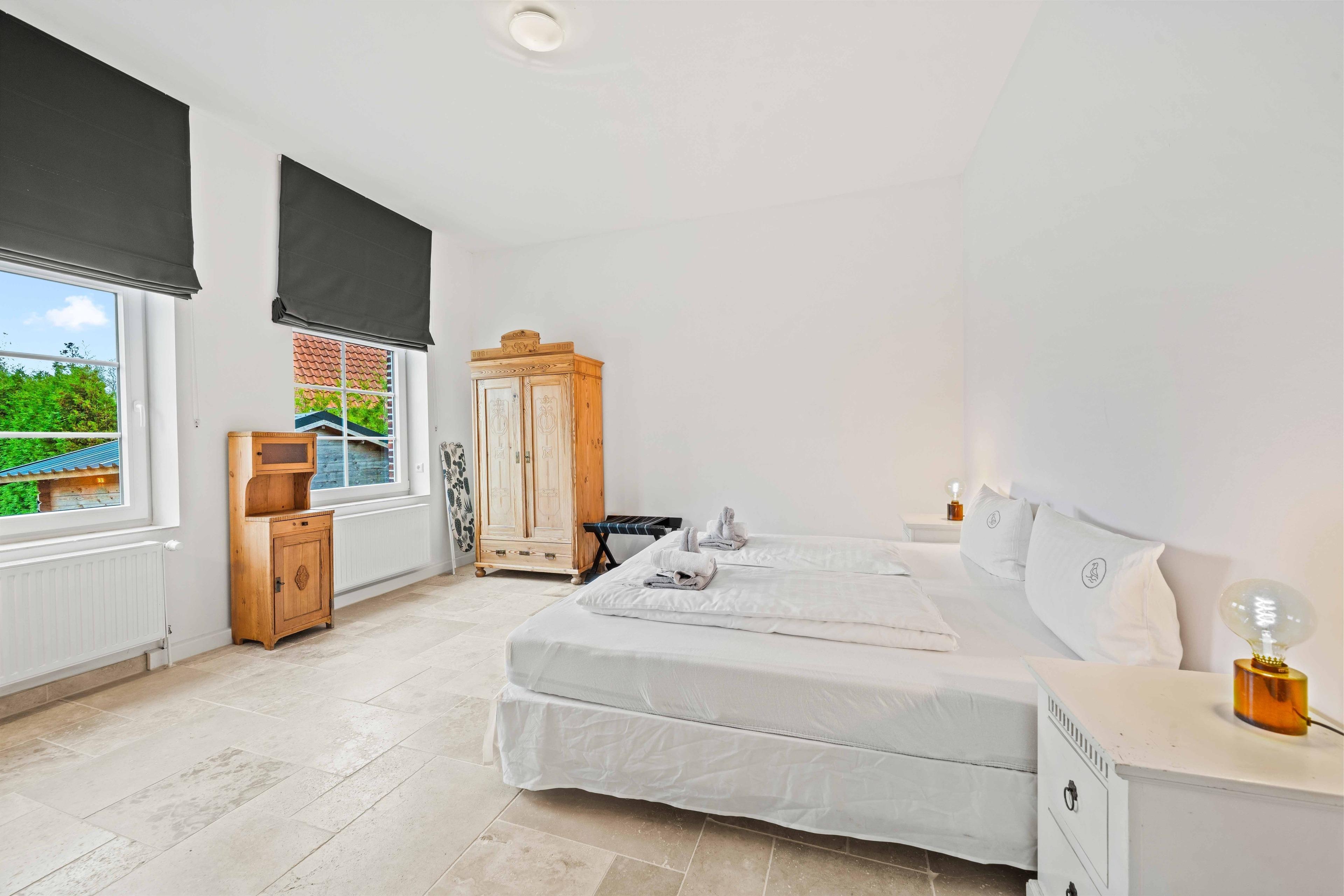 Inmitten der malerischen ostfriesischen Landschaft, im ruhigen Warfendorf Loquard, erwartet Sie das „Schmuckstück an der Nordsee“ – ein stilvolles Ferienhaus, das historische Atmosphäre mit modernem Wohnkomfort verbindet. Das großzügige Domizil befindet sich in einem ehemaligen Gulfhof, der mit viel Liebe zum Detail aufwändig saniert wurde. Hier treffen traditionelle Architektur und modernes Interieur aufeinander, wobei alte Holzbalken erhalten wurden, die das Ferienhaus besonders wohnlich und gemütlich machen. Auf 140qm Wohnfläche finden Familien und Freundesgruppen reichlich Platz zum Entspannen, denn das Haus verfügt über vier einladende Schlafzimmer, jedes davon mit einem komfortablen Doppelbett und TV ausgestattet. Zwei moderne Badezimmer sorgen für ausreichend Privatsphäre: Während eines der Bäder neben einer ebenerdigen Dusche auch eine freistehende Badewanne bietet, überzeugt das zweite Bad ebenfalls mit einer ebenerdigen Dusche und hochwertiger Ausstattung. Das Herzstück der Ferienwohnung ist der große Wohnbereich mit gemütlicher Sofaecke. Etwas abgetrennt finden Sie die voll ausgestattete, hochwertige Küche mit geräumigem Esstisch. Im Außenbereich erwartet Sie vor dem Haus eine möbilierte Terrasse, sowie eine Grün- und Steinfläche, auf der getobt oder gespielt werden kann. Auch vierbeinige Familienmitglieder sind hier herzlich willkommen.