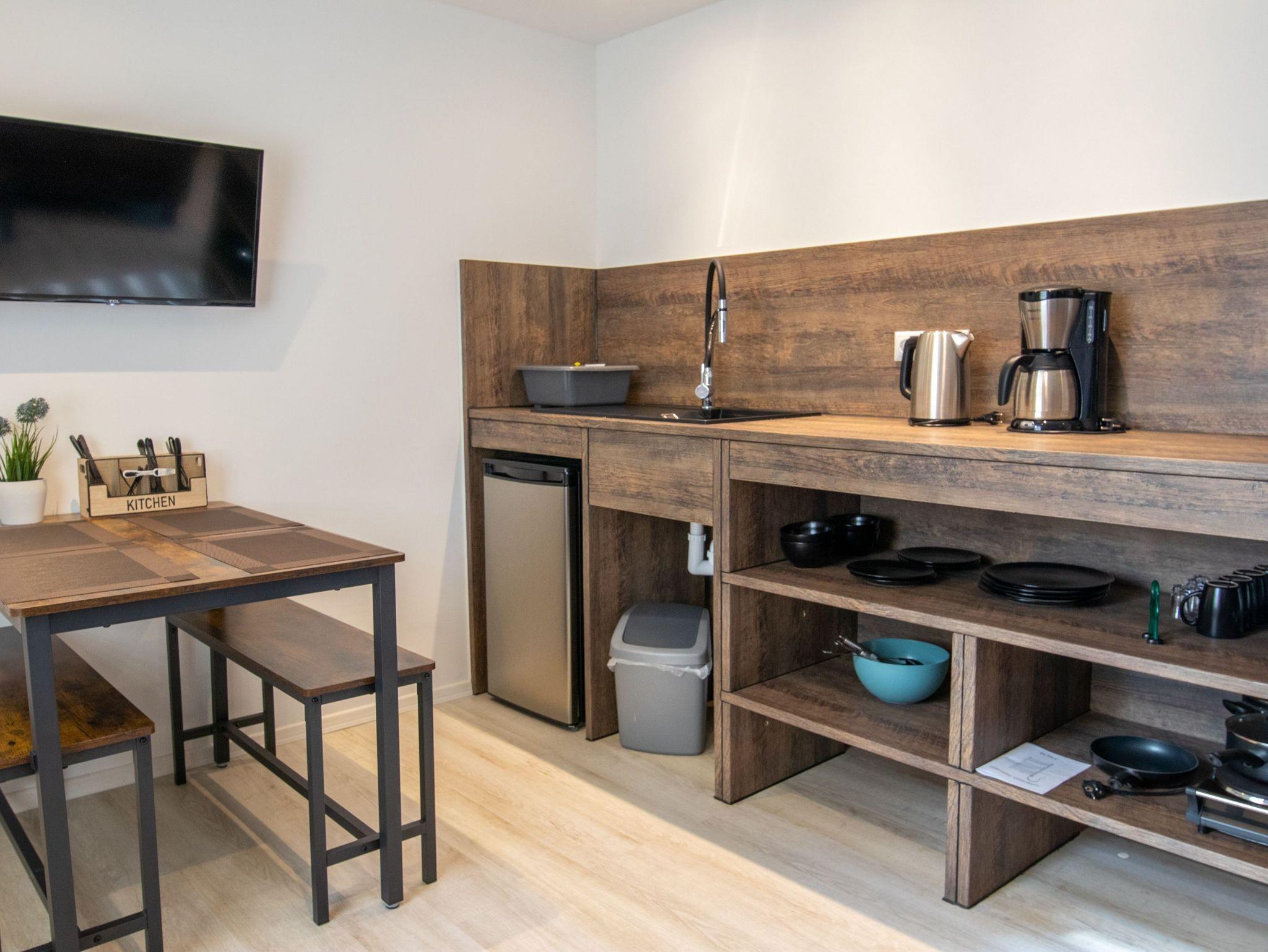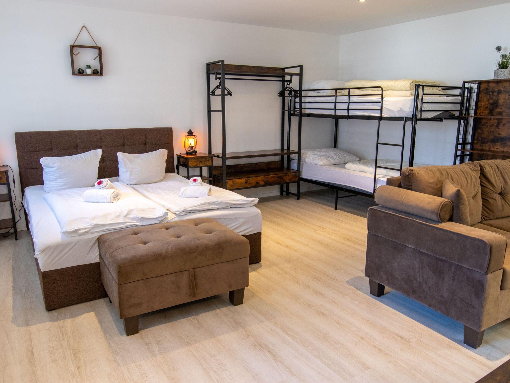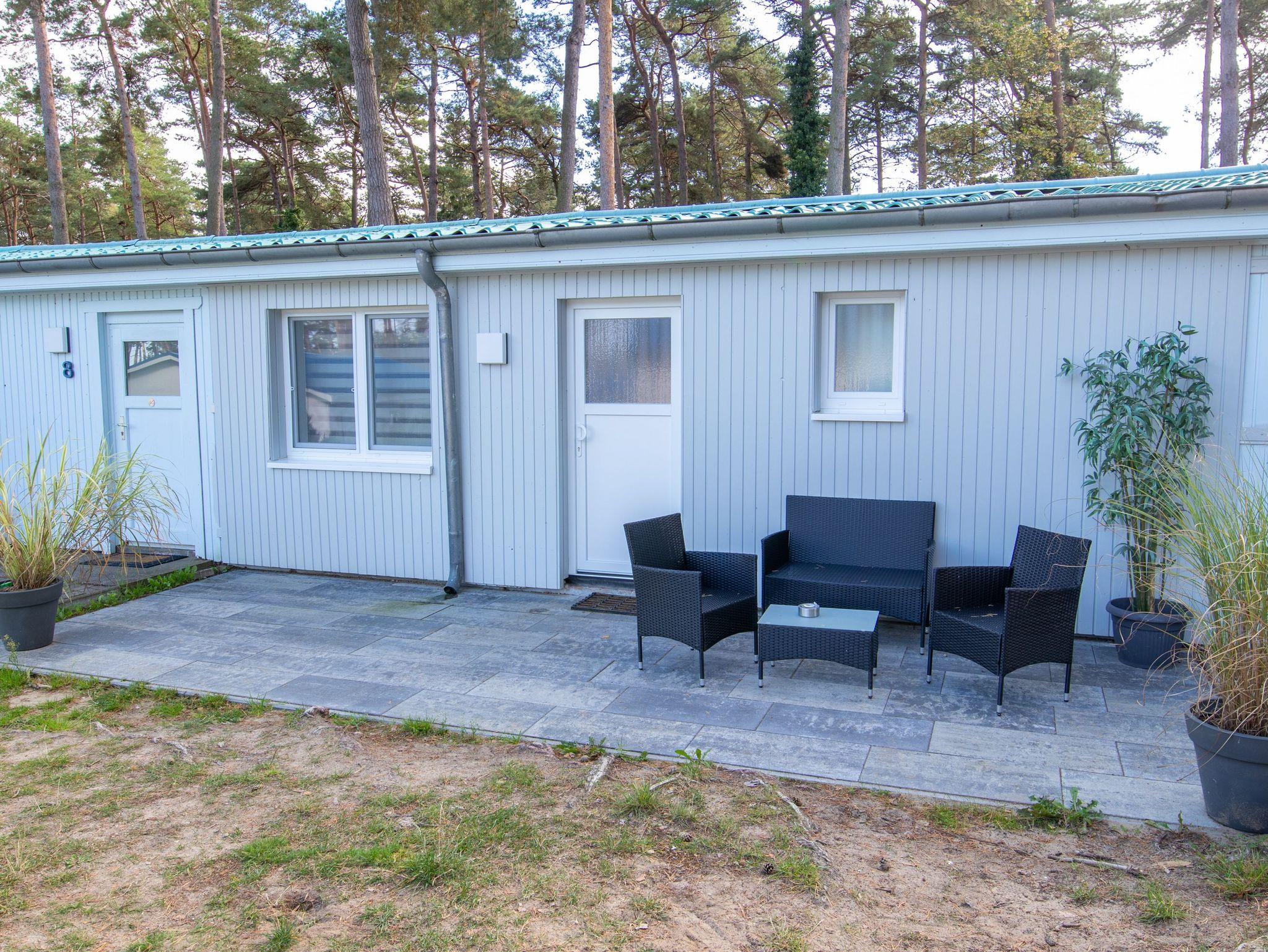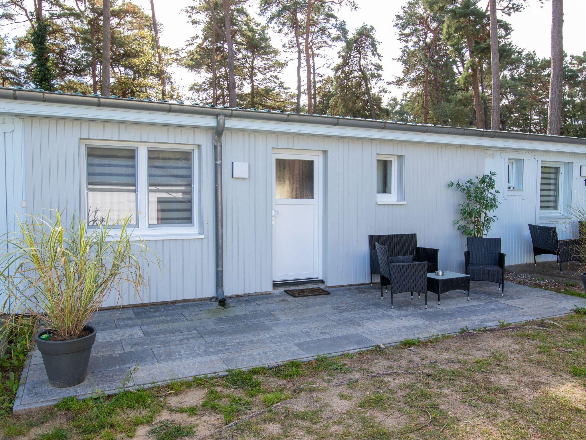 Die ca. 30 m² große Ferienwohnung befindet sich in einem einzeln stehenden Reihenhaus mit Terrasse mit Blick zum Wald. Sie verfügt über ein großes Wohnzimmer und ein Bad. Das Wohnzimmer ist mit einer modernen Couch, einem TV, einem Esstisch und einer Küchenzeile mit Kühlschrank eingerichtet. Im Wohnzimmer befindet sich ein gemütliches Doppelbett (180x200) mit Kleiderschrank und einem Etagenbett (90x200). Das freundliche Tageslichtbad hat eine Dusche und ein WC. Zum Entspannen und Sonne tanken lädt die Terrasse ein. Sie ist vom Wohnzimmer aus begehbar. Vierbeiner und Kinder sind herzlich willkommen. Kinderbett, Hochstuhl, Wäschepaket sowie ein Parkplatz sind inklusive.