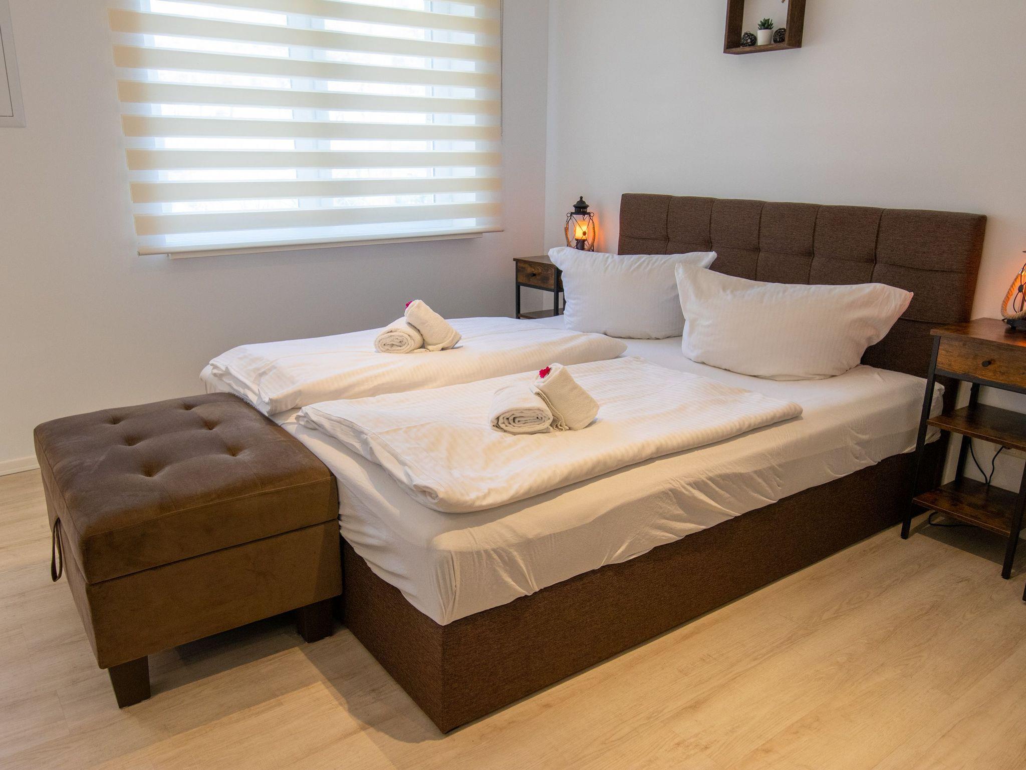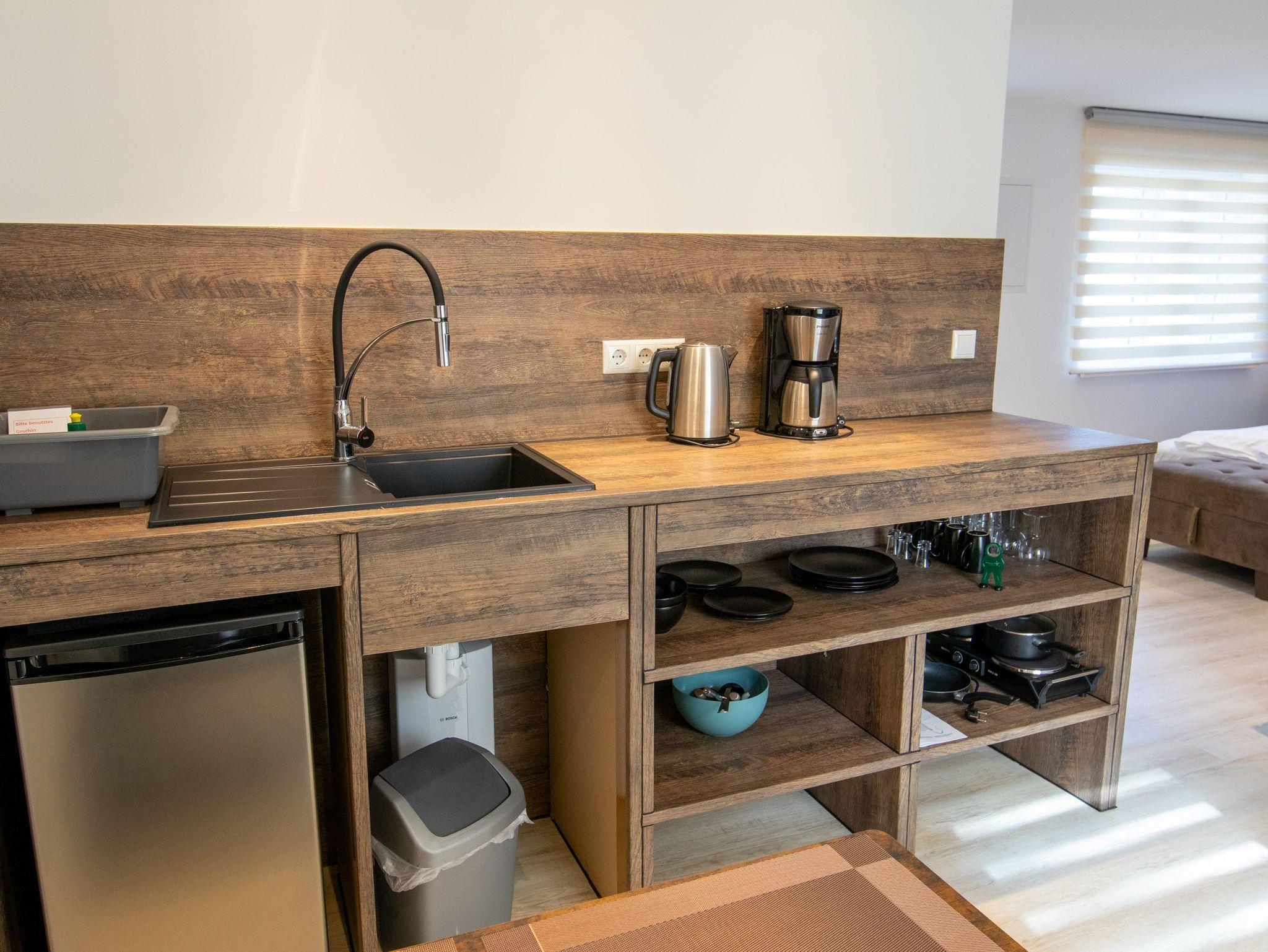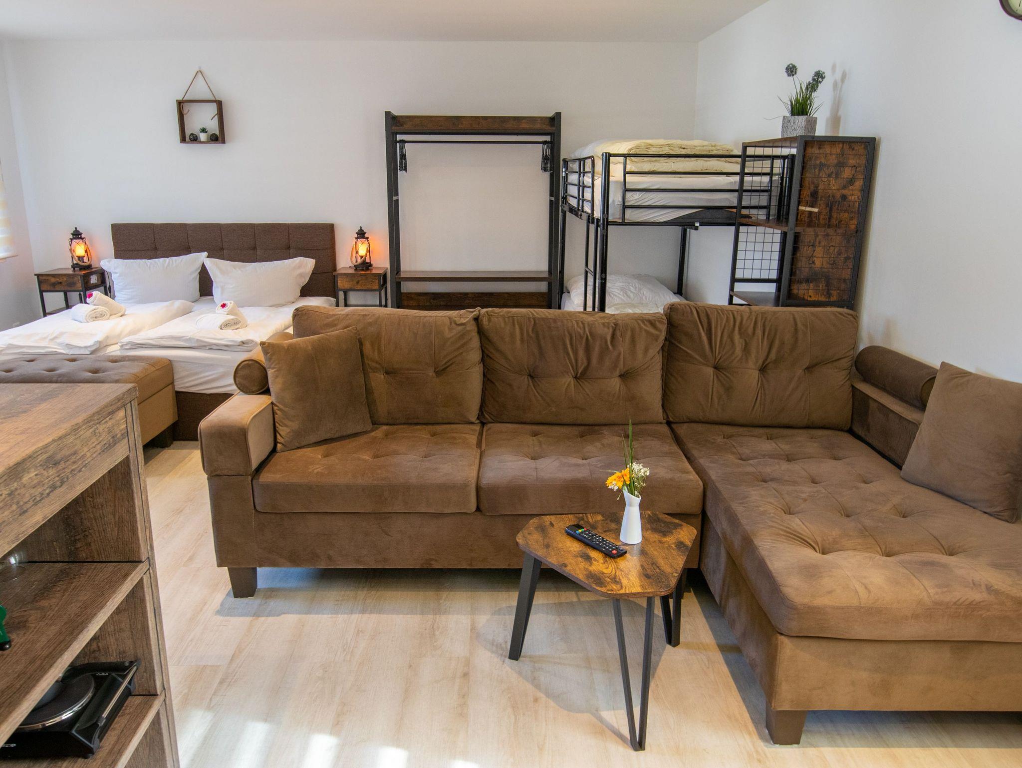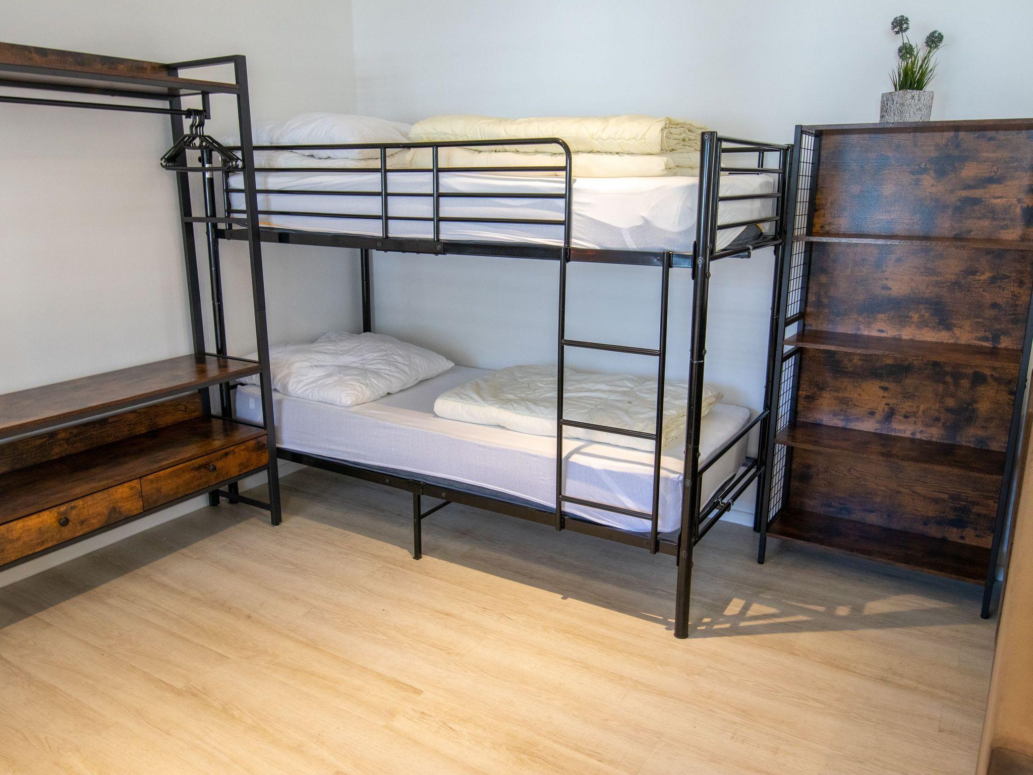 Die ca. 30 m² große Ferienwohnung befindet sich in einem einzeln stehenden Reihenhaus mit Terrasse mit Blick zum Wald. Sie verfügt über ein großes Wohnzimmer und ein Bad. Das Wohnzimmer ist mit einer modernen Couch, einem TV, einem Esstisch und einer Küchenzeile mit Kühlschrank eingerichtet. Im Wohnzimmer befindet sich ein gemütliches Doppelbett (180x200) mit Kleiderschrank und einem Etagenbett (90x200). Das freundliche Tageslichtbad hat eine Dusche und ein WC. Zum Entspannen und Sonne tanken lädt die Terrasse ein. Sie ist vom Wohnzimmer aus begehbar. Vierbeiner und Kinder sind herzlich willkommen. Kinderbett, Hochstuhl, Wäschepaket sowie ein Parkplatz sind inklusive.
