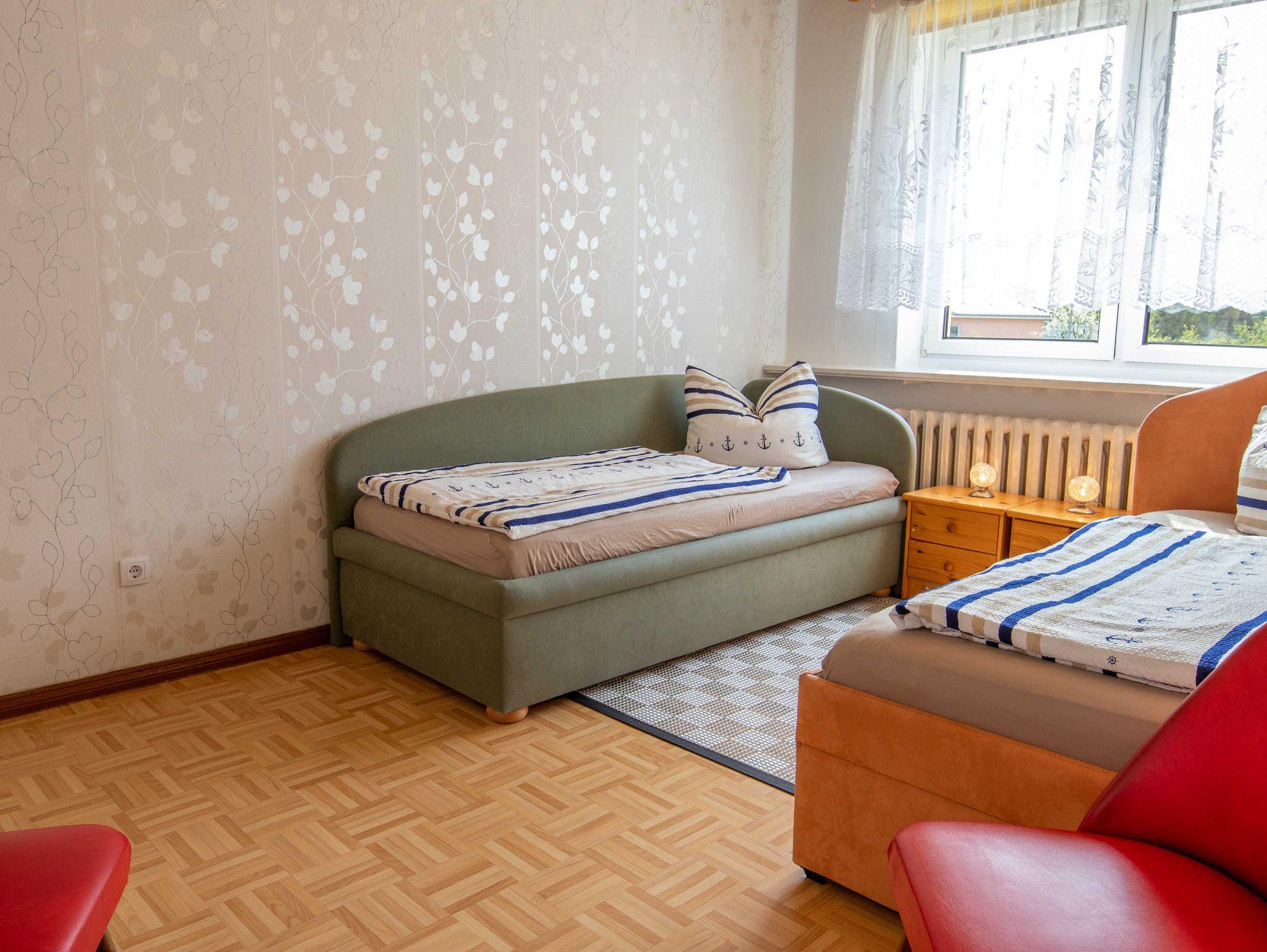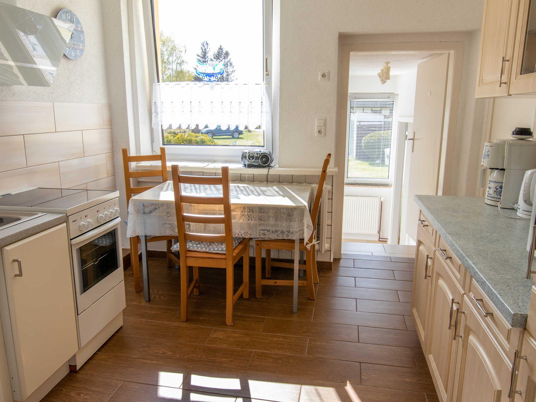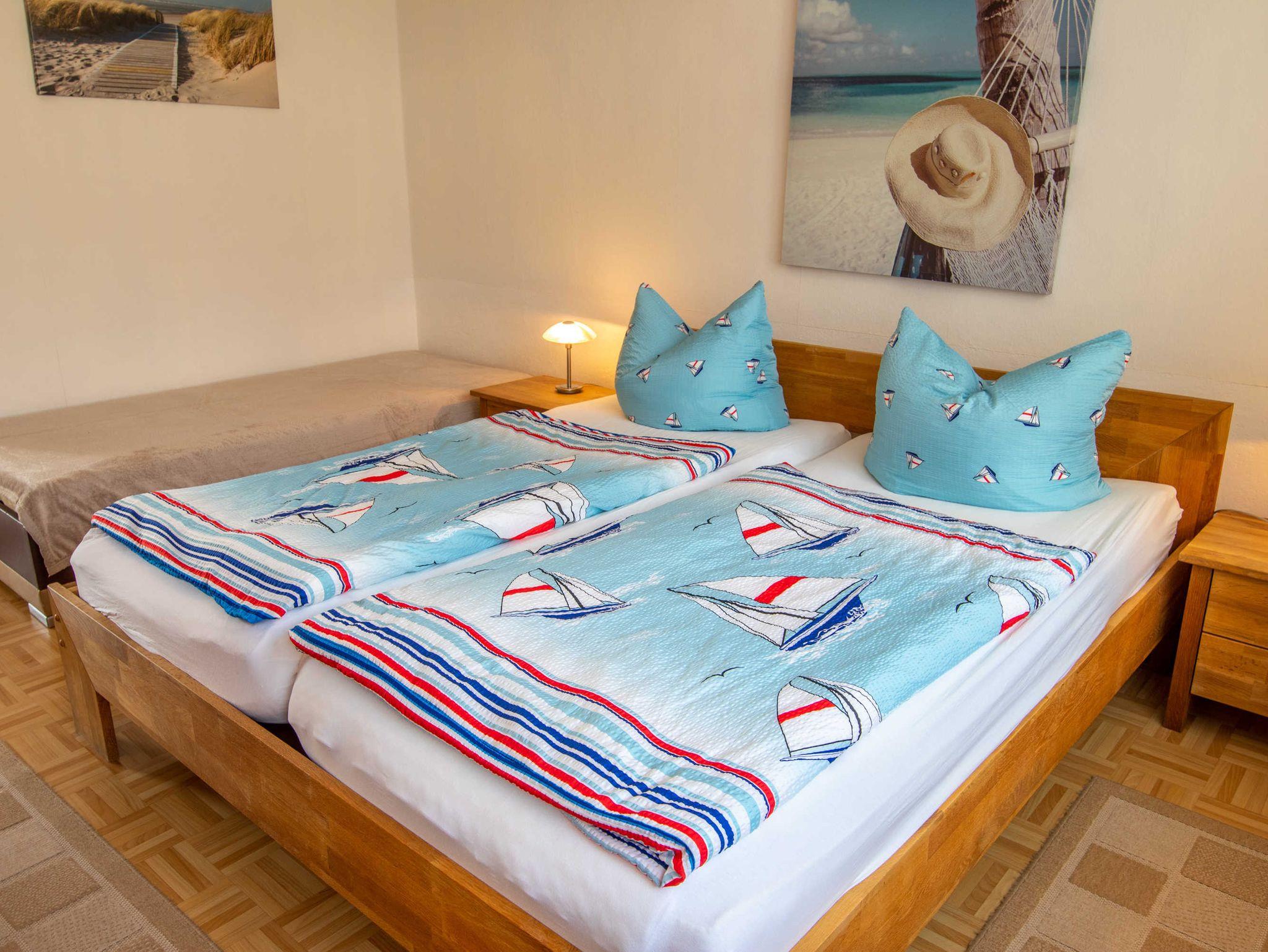 Die Ferienwohnung verfügt über einen Wohnraum mit Sitzecke und TV, ein Schlafzimmer mit Doppelbett und Einzelbett, ein Kinderzimmer mit zwei Einzelbetten, ein Küche mit Gasherd und Sitzmöglichkeit sowie ein Bad mit Dusche und WC.