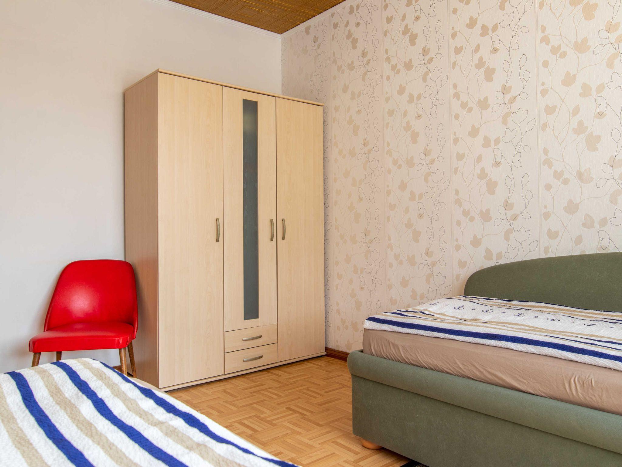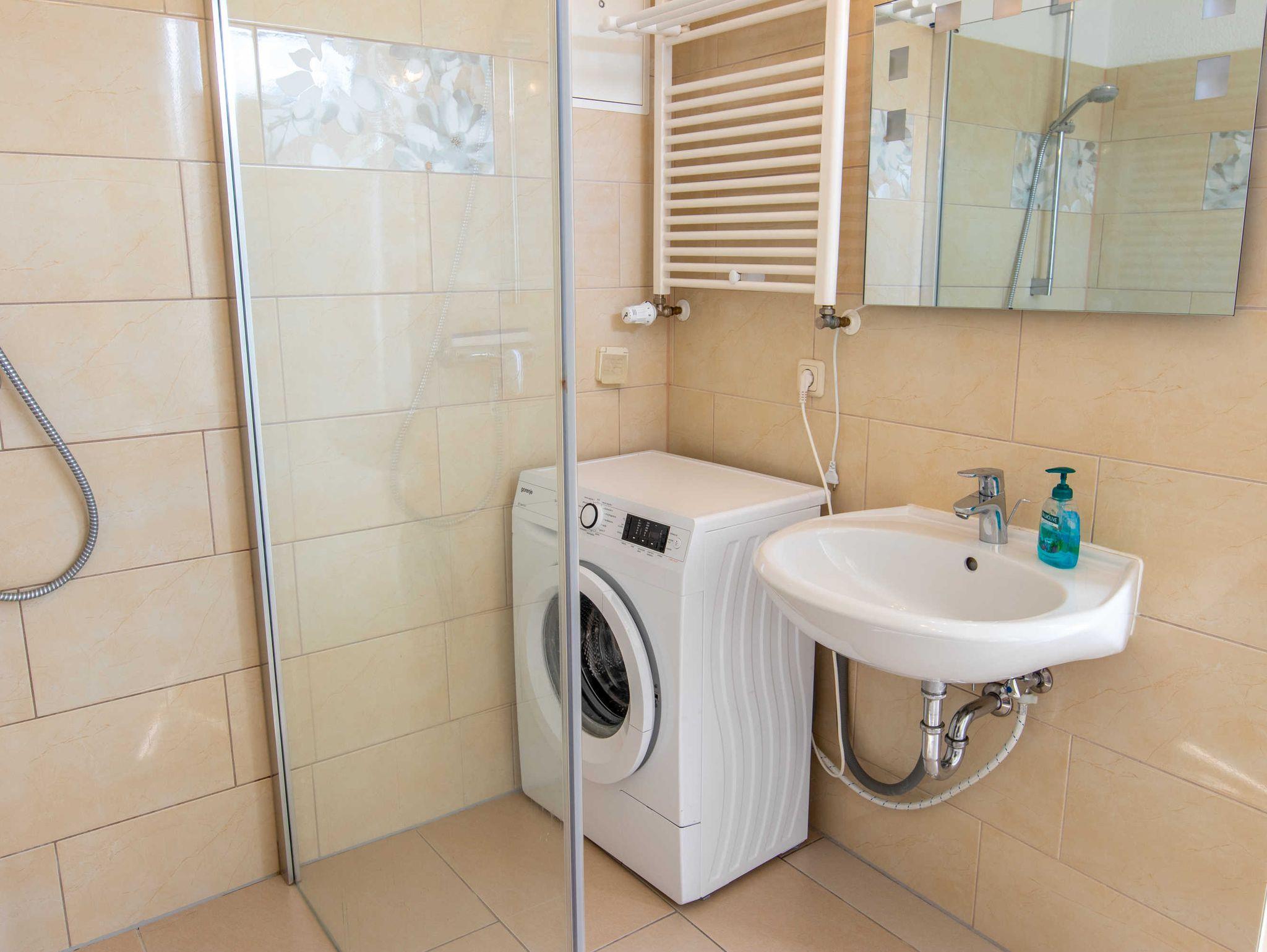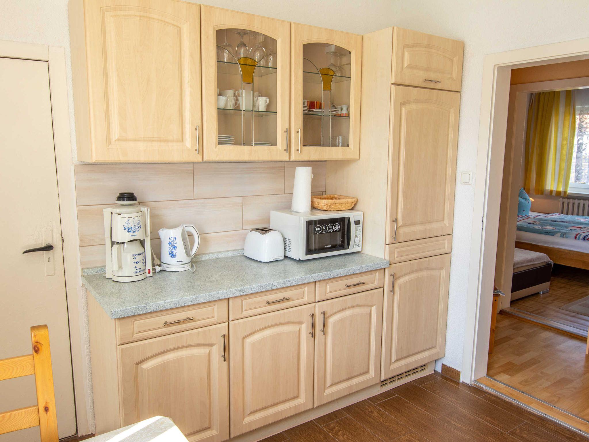 Die Ferienwohnung verfügt über einen Wohnraum mit Sitzecke und TV, ein Schlafzimmer mit Doppelbett und Einzelbett, ein Kinderzimmer mit zwei Einzelbetten, ein Küche mit Gasherd und Sitzmöglichkeit sowie ein Bad mit Dusche und WC.