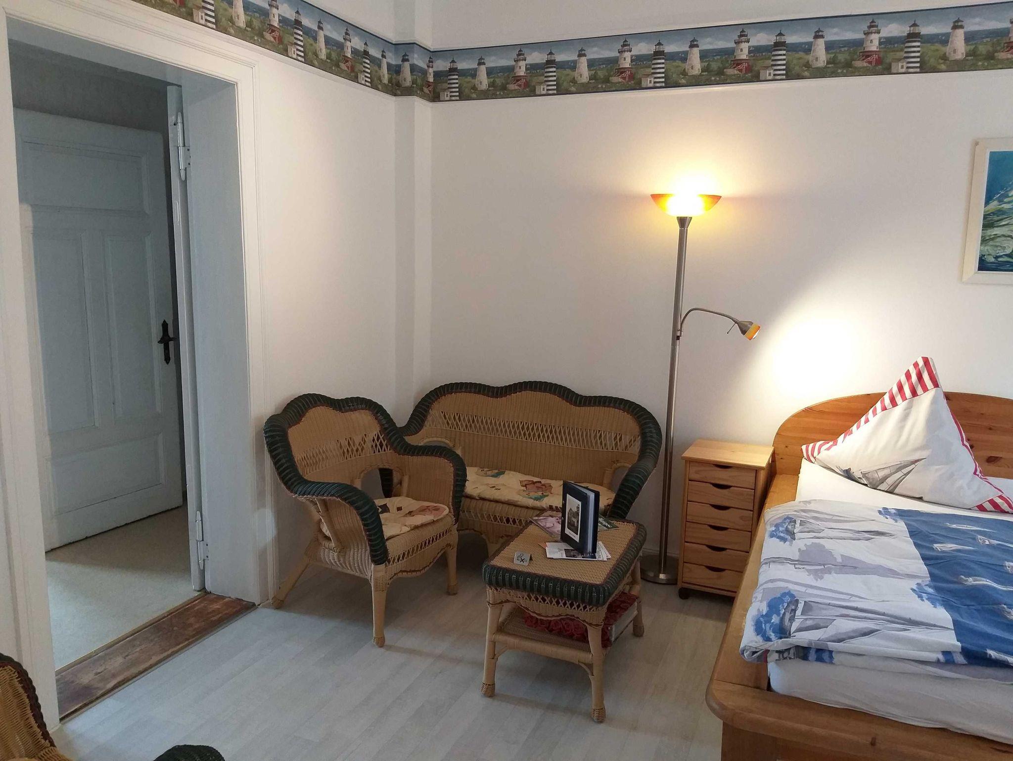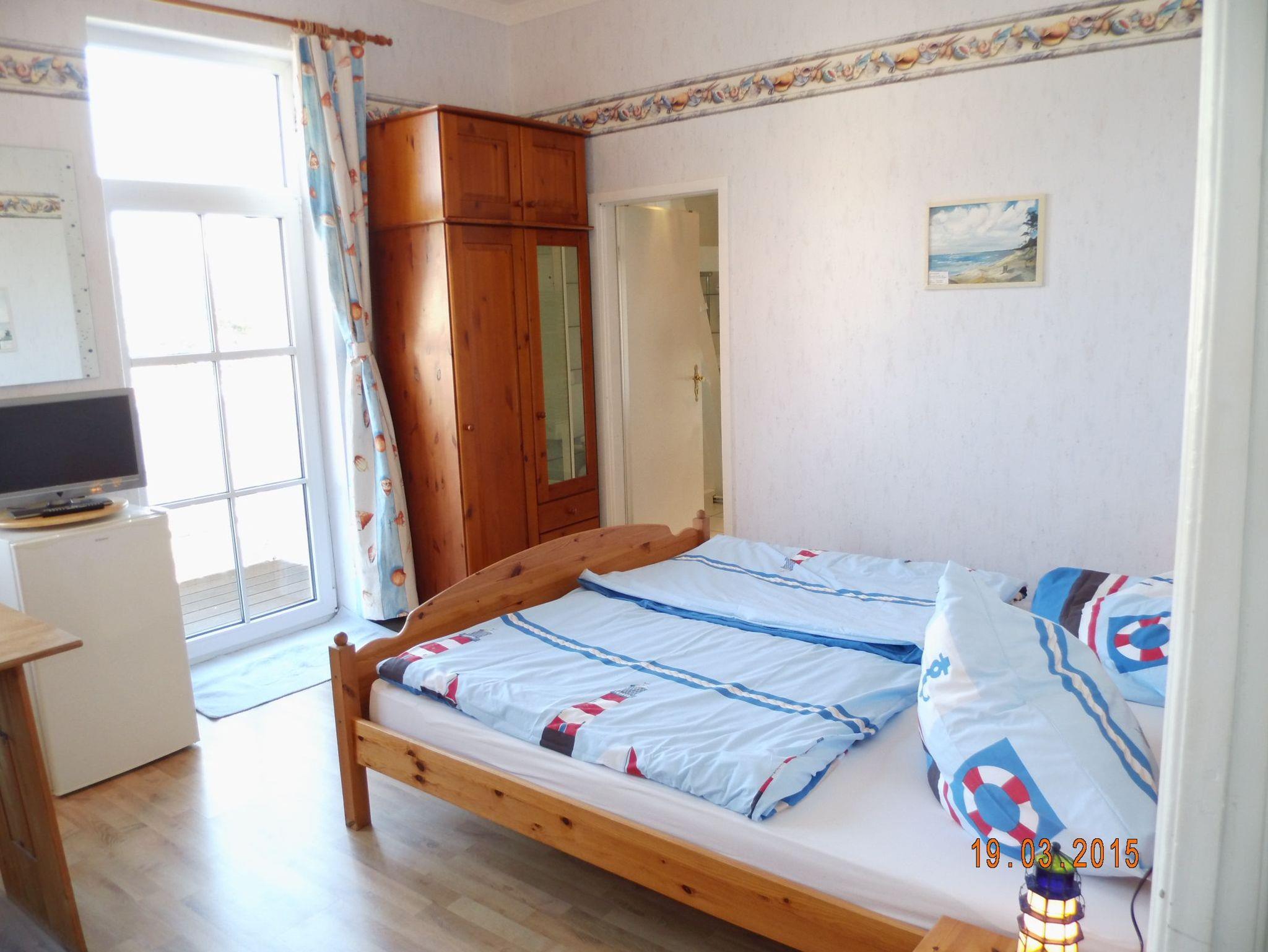 Der Wohn-/Schlafraum ist eingerichtet mit einem Doppelbett (200/180 mit verstellbaren Lattenrosten am Kopf - & Fußenden), einer Sitzecke, TV, Radiowecker, Musikanlage und einer Garderobe.