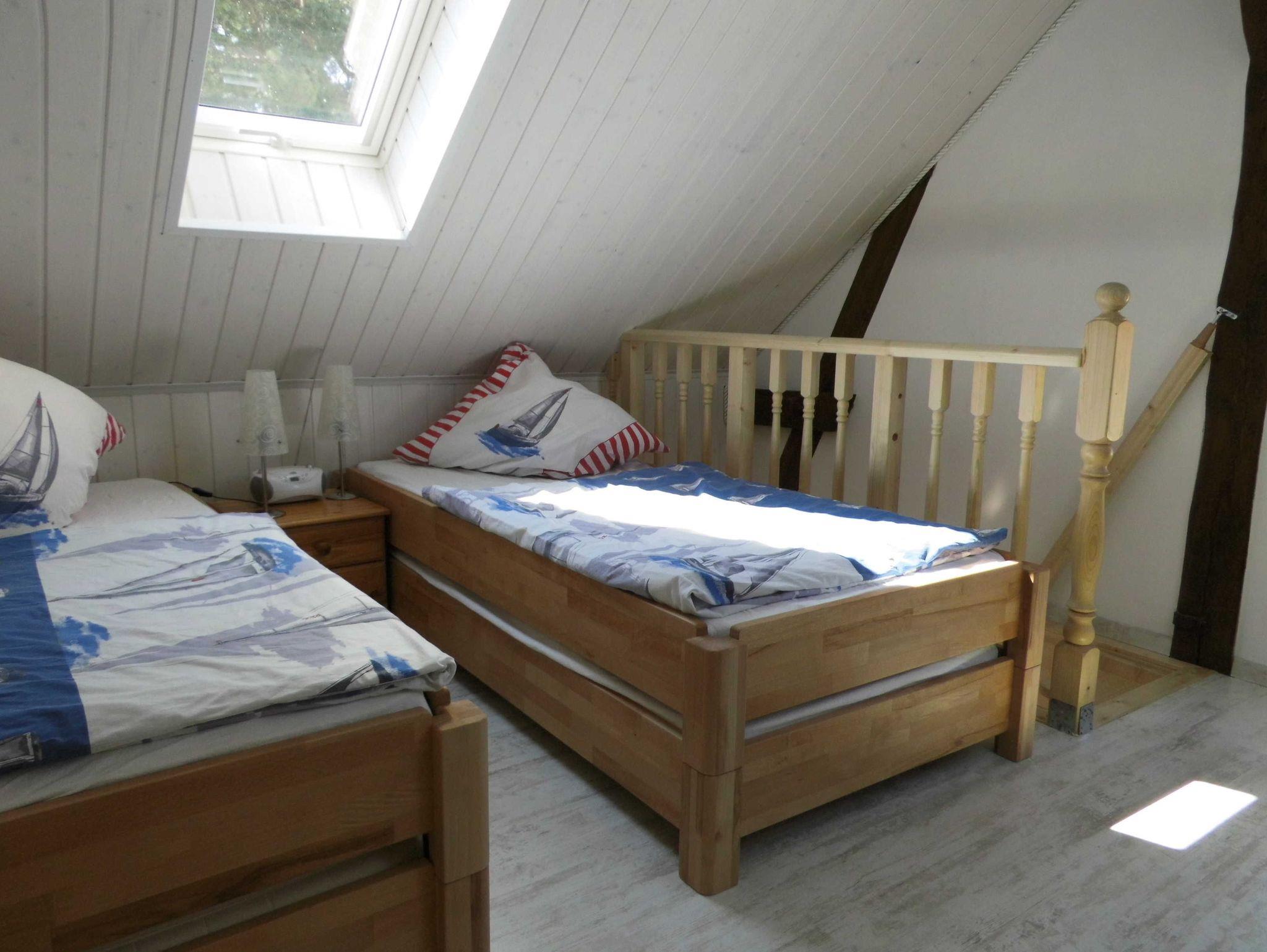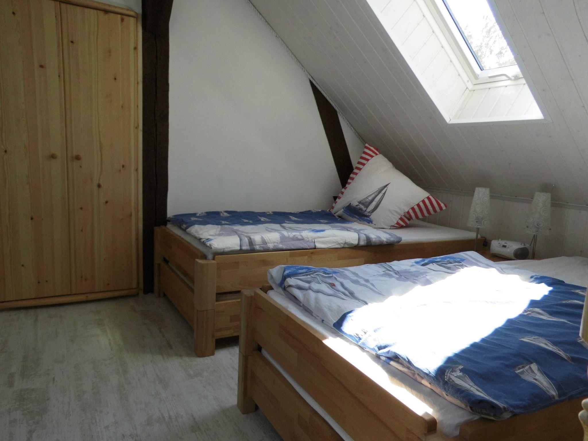 Die komfortable Ferienwohnung (54qm), bietet Platz für 5 Erwachsene, aufgeteilt in zwei Schlafzimmer, ein Esszimmer, Küche und Badezimmer. Der Wohn-/Schlafraum ist eingerichtet mit einem Doppelbett (200/180) mit verstellbaren Lattenrosten am Kopf - & Fußenden), einer Sitzecke, TV, Radiowecker, Musikanlage und einer Garderobe. Den zweiten Schlafraum erreicht man über eine Raumspartreppe in das Dachgeschoss. Hier stehen 2 Stapelbetten (200cm x 90cm), diese zu 3 oder sogar 4 Betten umgestapelt werden können.