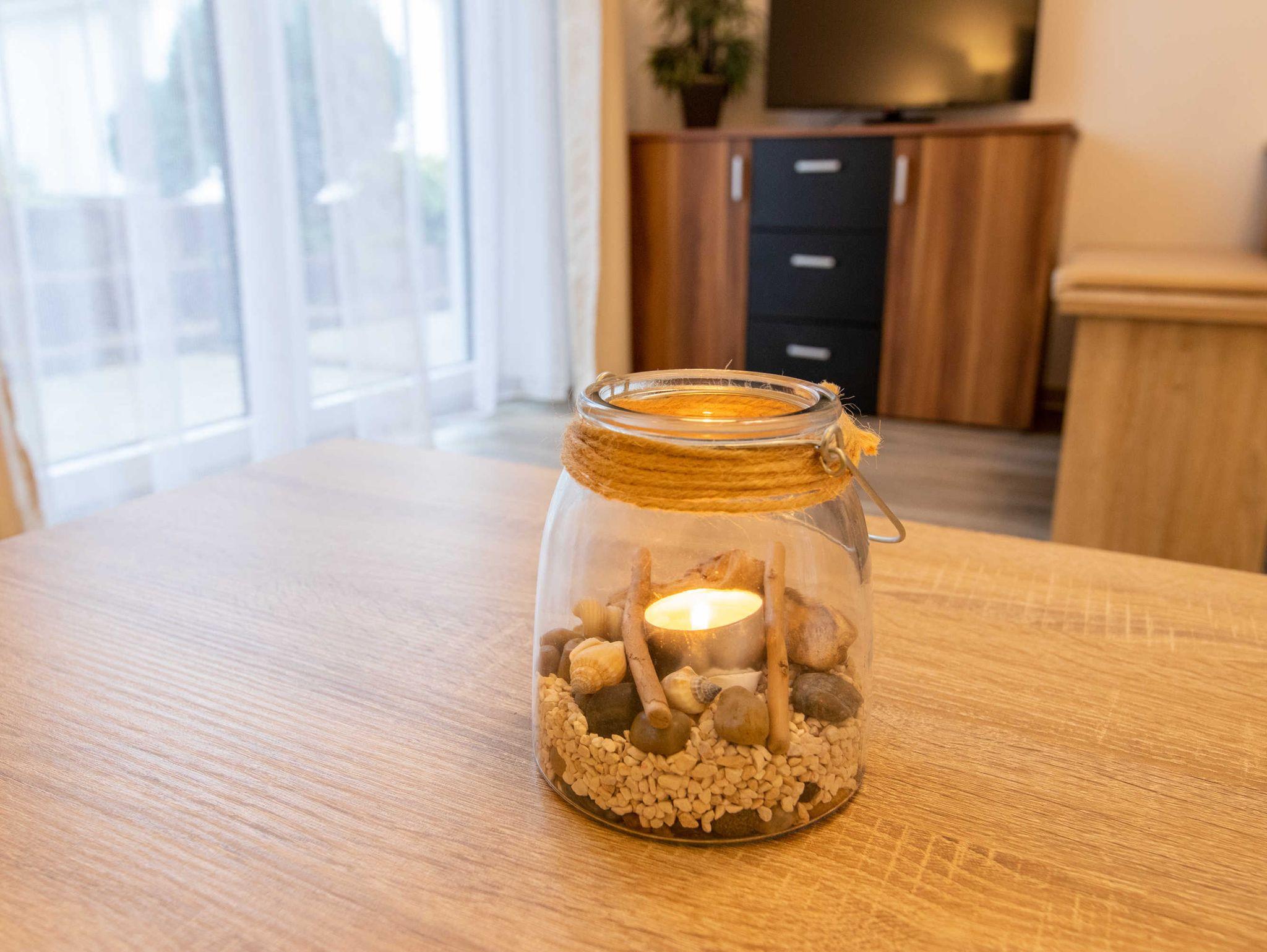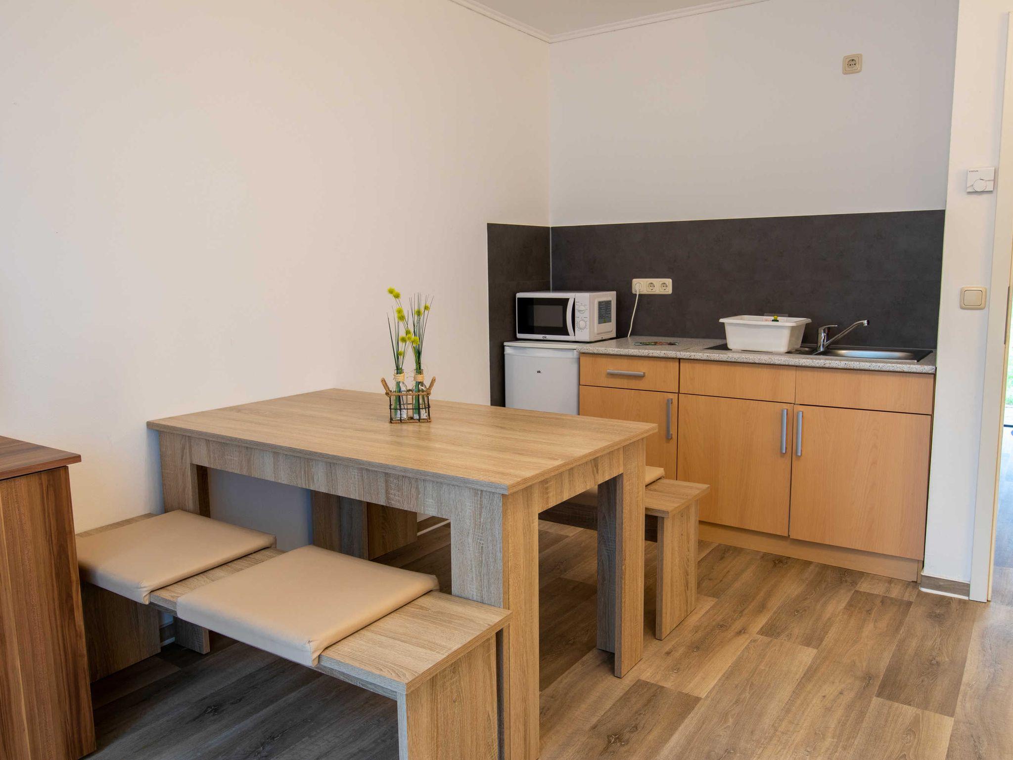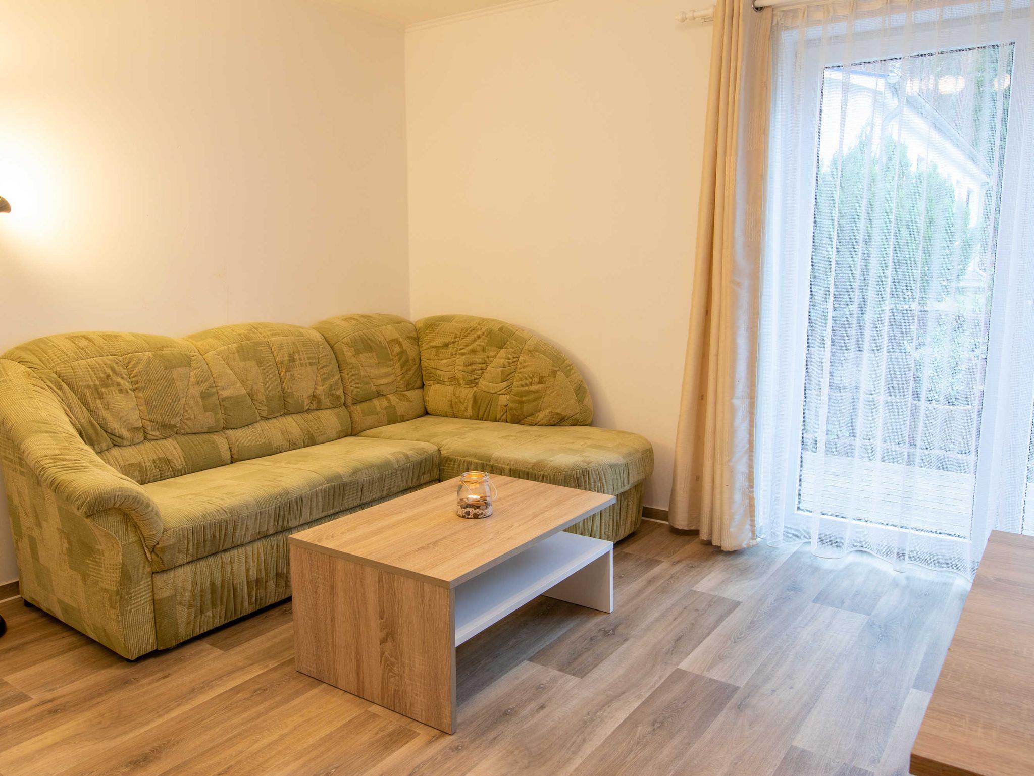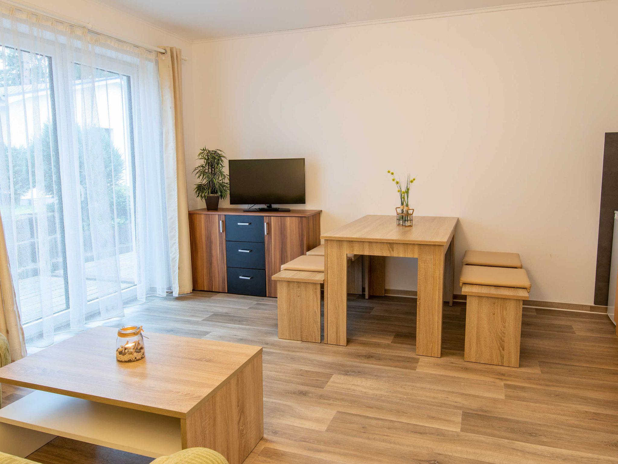 DIe ca. 50 m² große Ferienwohnung befindet sich in einem einzeln stehenden Doppelhaus mit Terrasse und Blick zum Wald. Sie verfügt über ein Wohnzimmer mit Miniküche, zwei separaten Schlafzimmern, Flur und Bad.