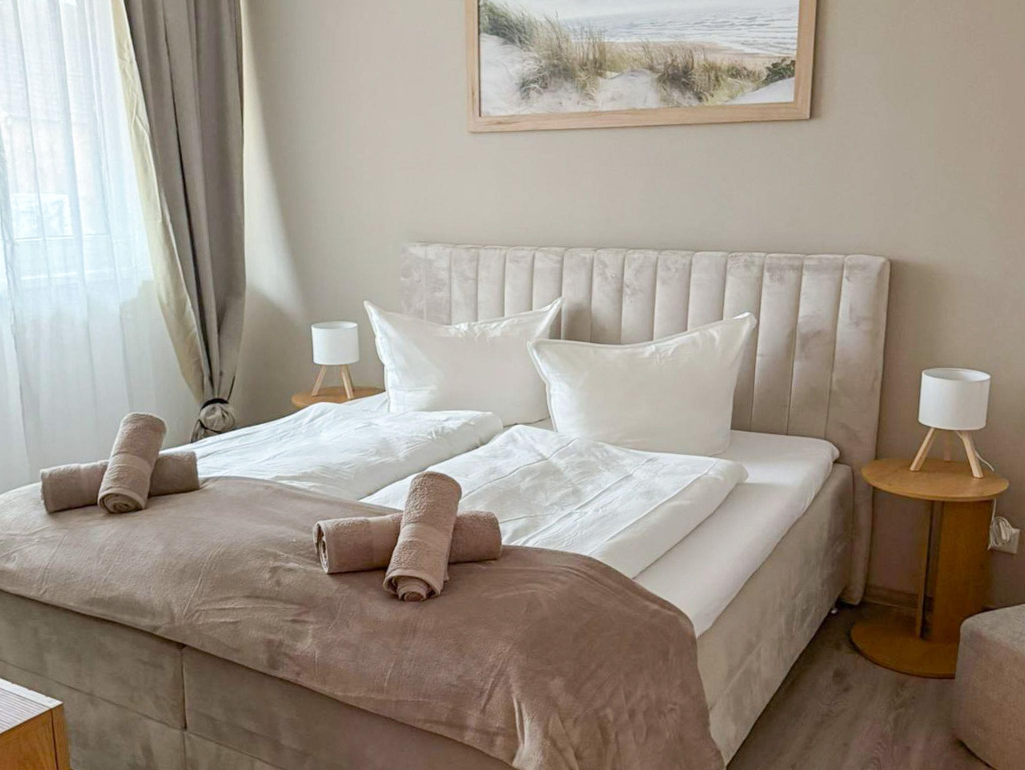 Die Wohnung überzeugt mit einem durchdachten Grundriss: ein gemütliches Schlafzimmer, ein heller Wohnbereich mit offener Küche, ein modernes Bad mit ebenerdiger Dusche sowie ein Balkon für entspannte Momente an der frischen Ostseeluft. Der private Parkplatz direkt vor der Tür sorgt für eine entspannte An- und Abreise, der kontaktlose Check-in für maximale Flexibilität.