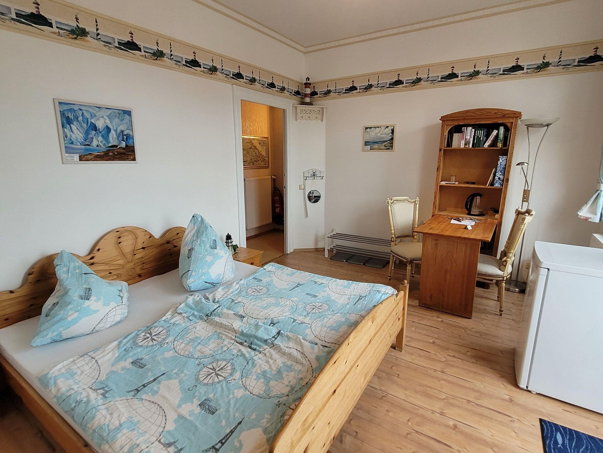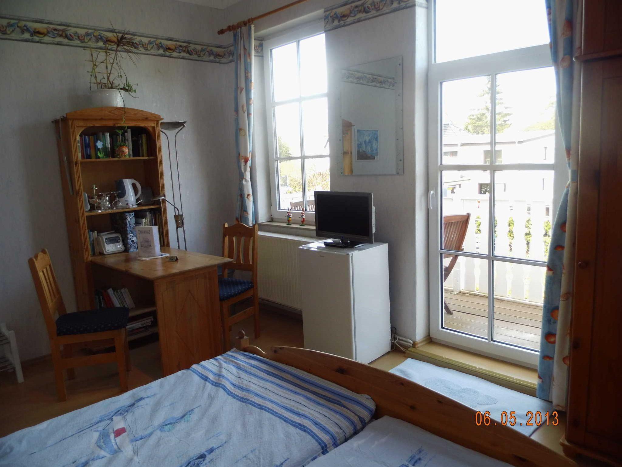 Das mit Laminat ausgelegte Doppelzimmer - mit angrenzendem Balkon - ist zweckmäßig eingerichtet, mit Doppelbett (bezogen mit Spezialbettwäsche), einer Sitzgruppe mit Tisch, Kleiderschrank, kleine Kommode und Bücherregal. Ferner sind TV mit DVD-Spieler und Radiowecker (mit CD) vorhanden.