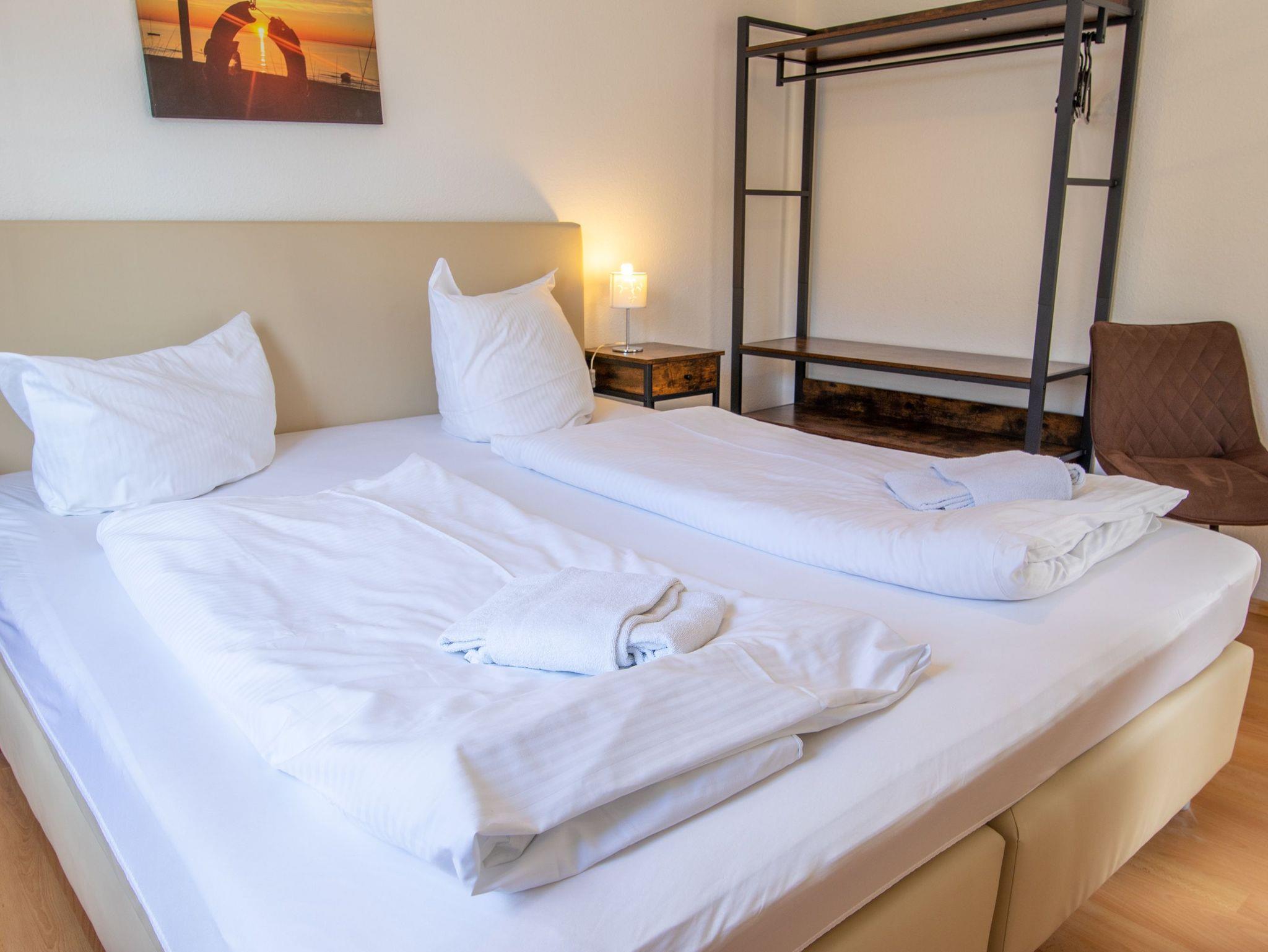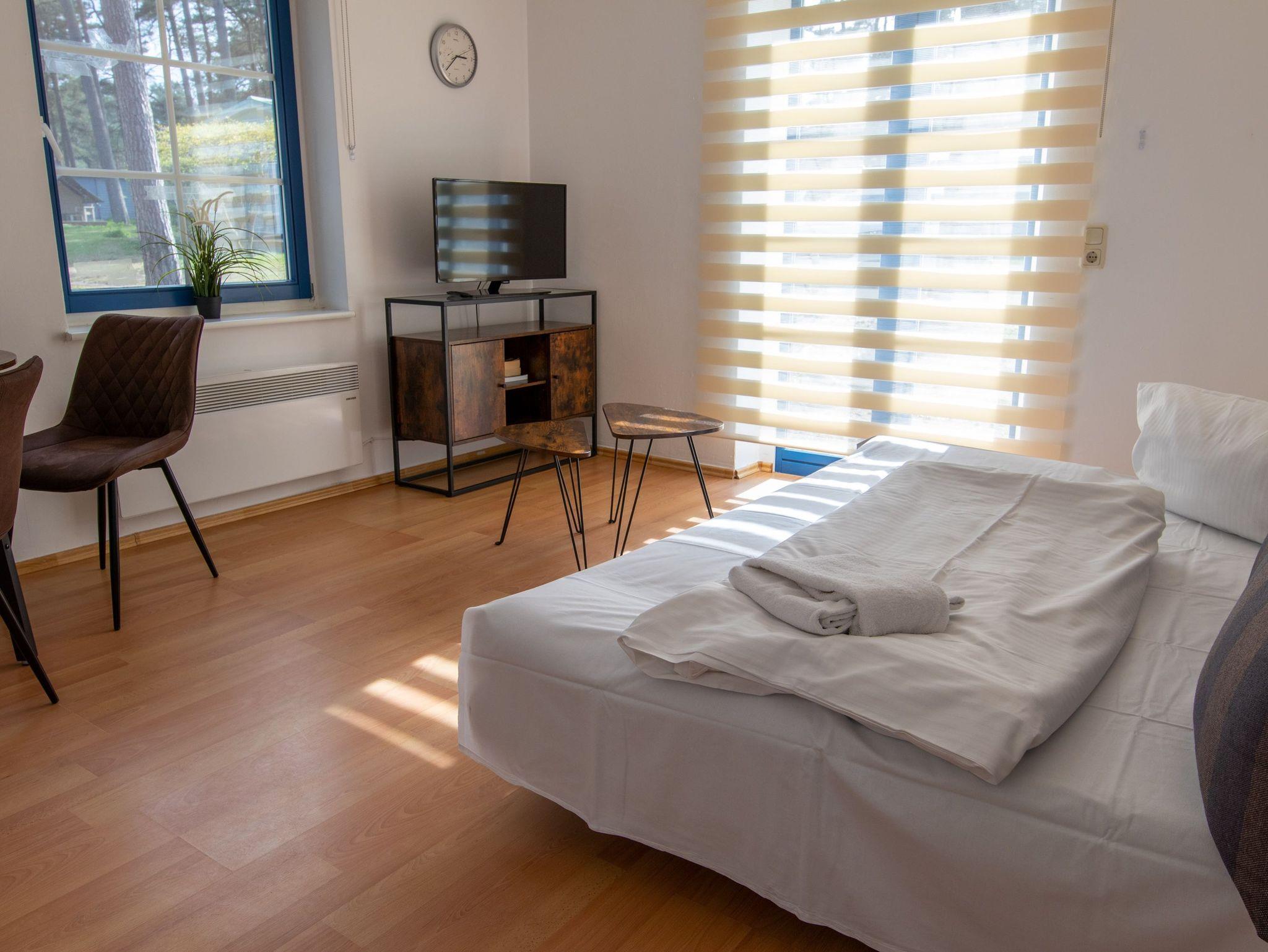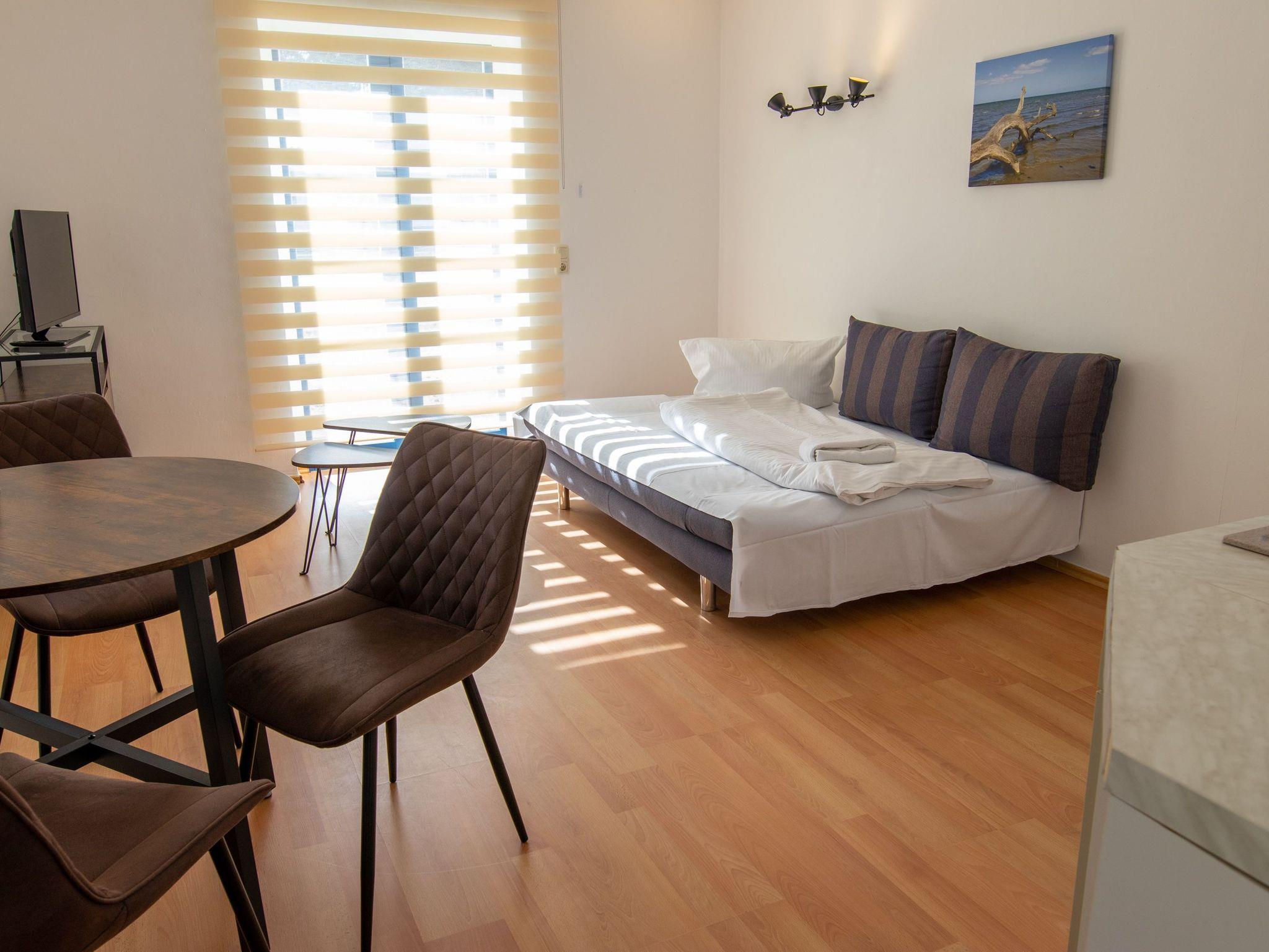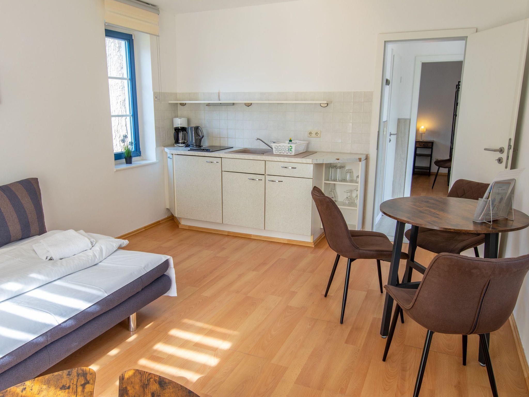 Das Wohnzimmer ist gemütlich eingerichtet mit einer Schlafcouch (Aufbettung für 2 Personen), TV, einem Esstisch und einer Miniküche mit Kühlschrank, Kaffeemaschine, Wasserkocher und 2 Kochplatten. Im Schlafzimmer befindet sich ein Boxspringbett (180x200) und ein Kleiderschrank. Das Tageslichtbad beinhaltet eine Dusche und ein WC.